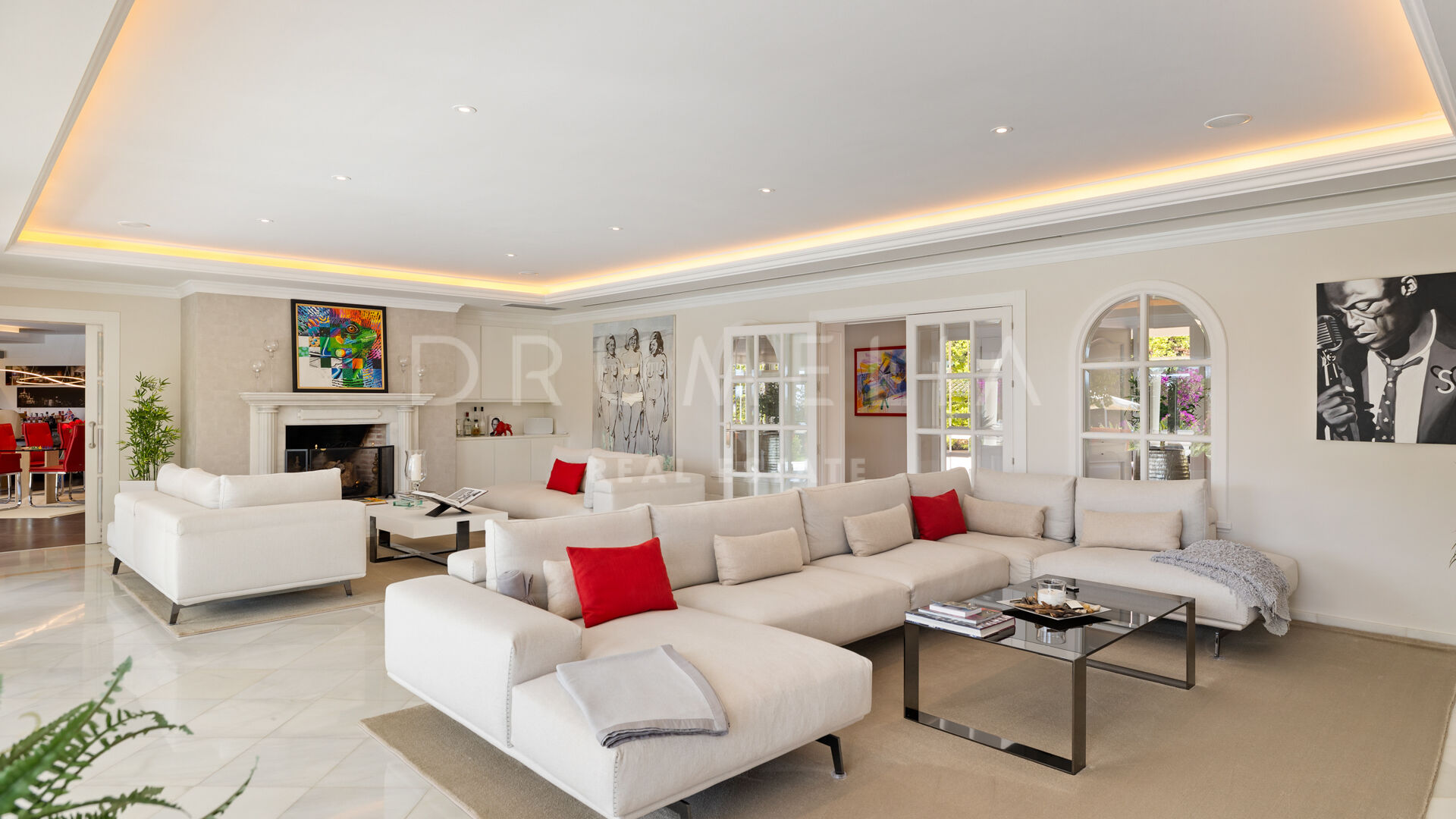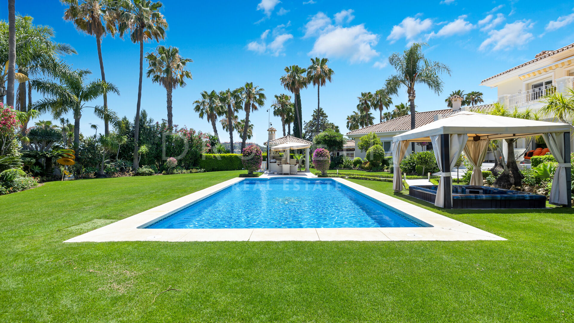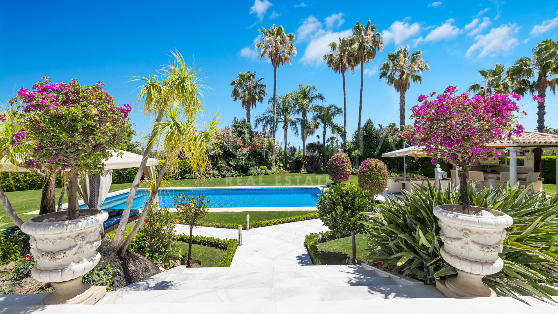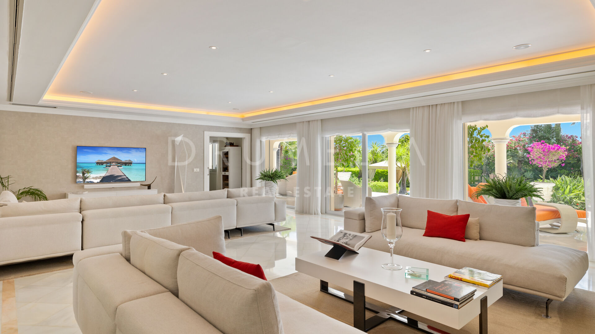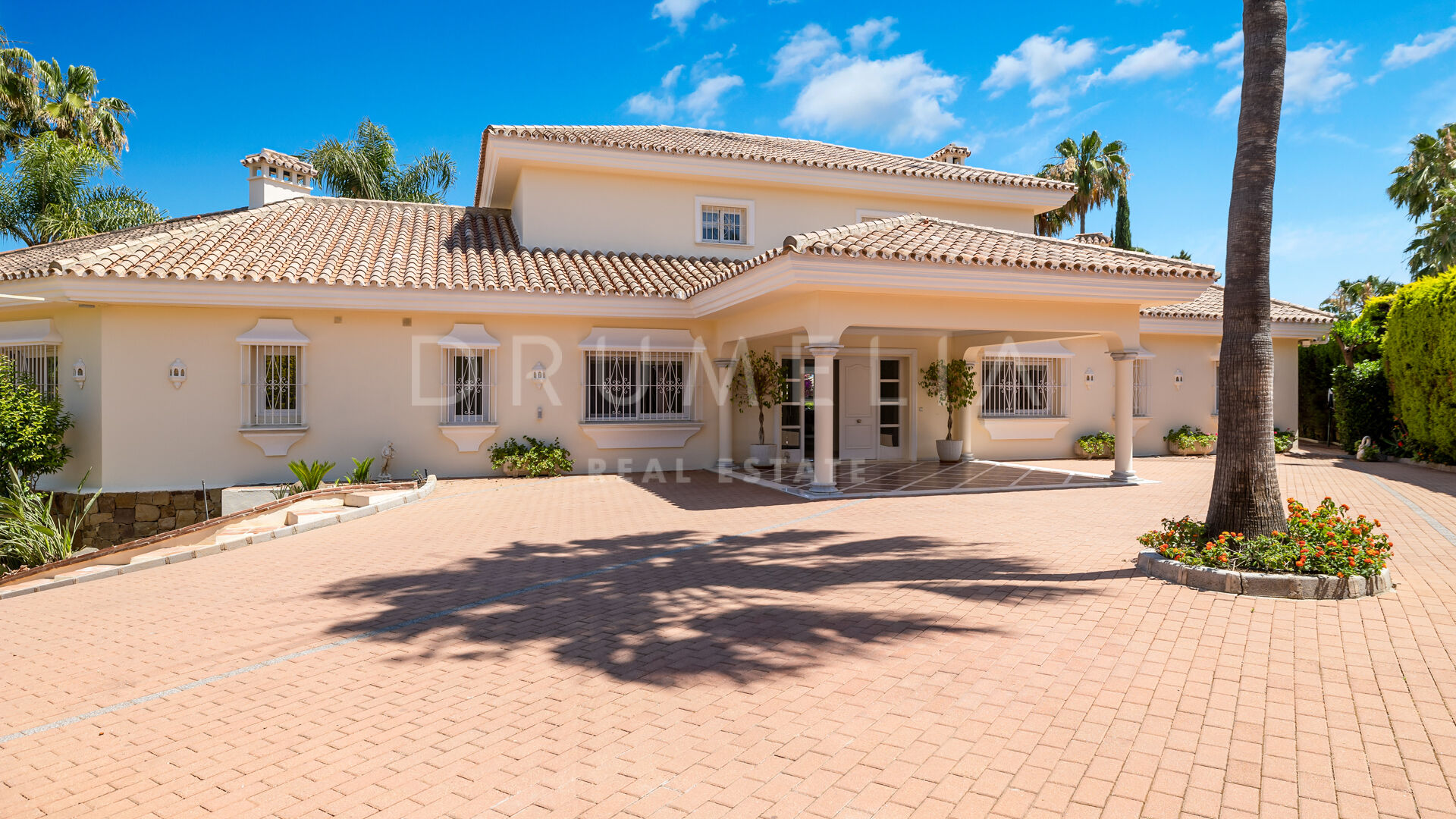 A great renovated 6-bedroom villa is offered for sale in the heart of Nueva Andalucia, Marbella. It is situated in La Cerquilla, an exclusive gated, 24-h protected urbanization of luxury villas, which ranks among the most private and secure in the area. Surrounded with the luxury properties and lush greenery of Nueva Andalucia, with little passing traffic, the sought-after La Cerquilla is called a ‘haven of peace’. The views from there, across the Golf Valley towards Puerto Banús, sea and mountains and majestic La Concha are magnificent. All local amenities are nearby, including shops and supermarkets, restaurants and bars, international schools, commercial centre Centro Plaza, colourful street markets, casino, sport facilities, Las Brisas and Los Naranjos golf clubs and other golf courses. The Blue Flag beach in Puerto Banus, all amenities of Marbella centre and San Pedro are just a few minutes’ away.