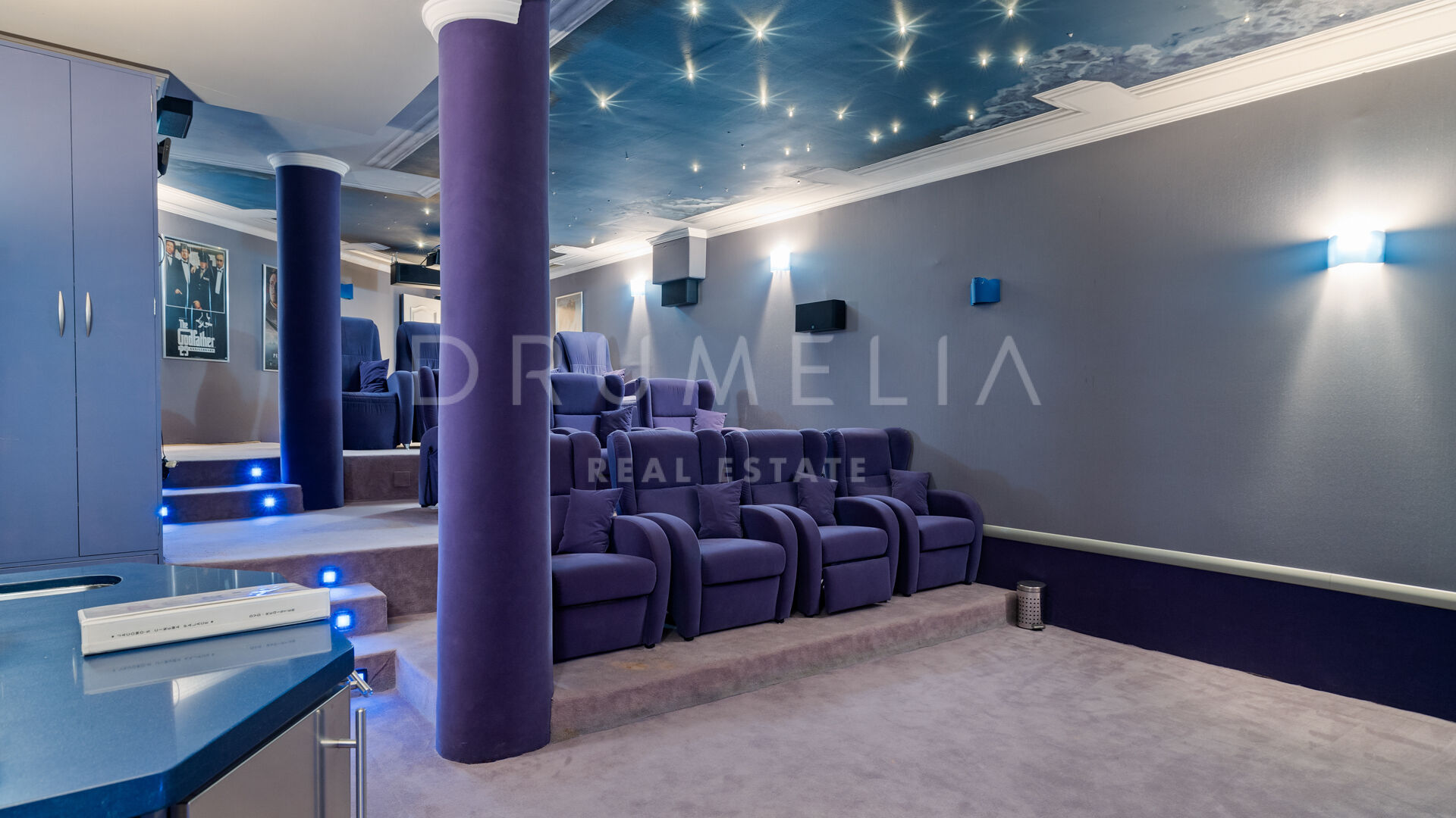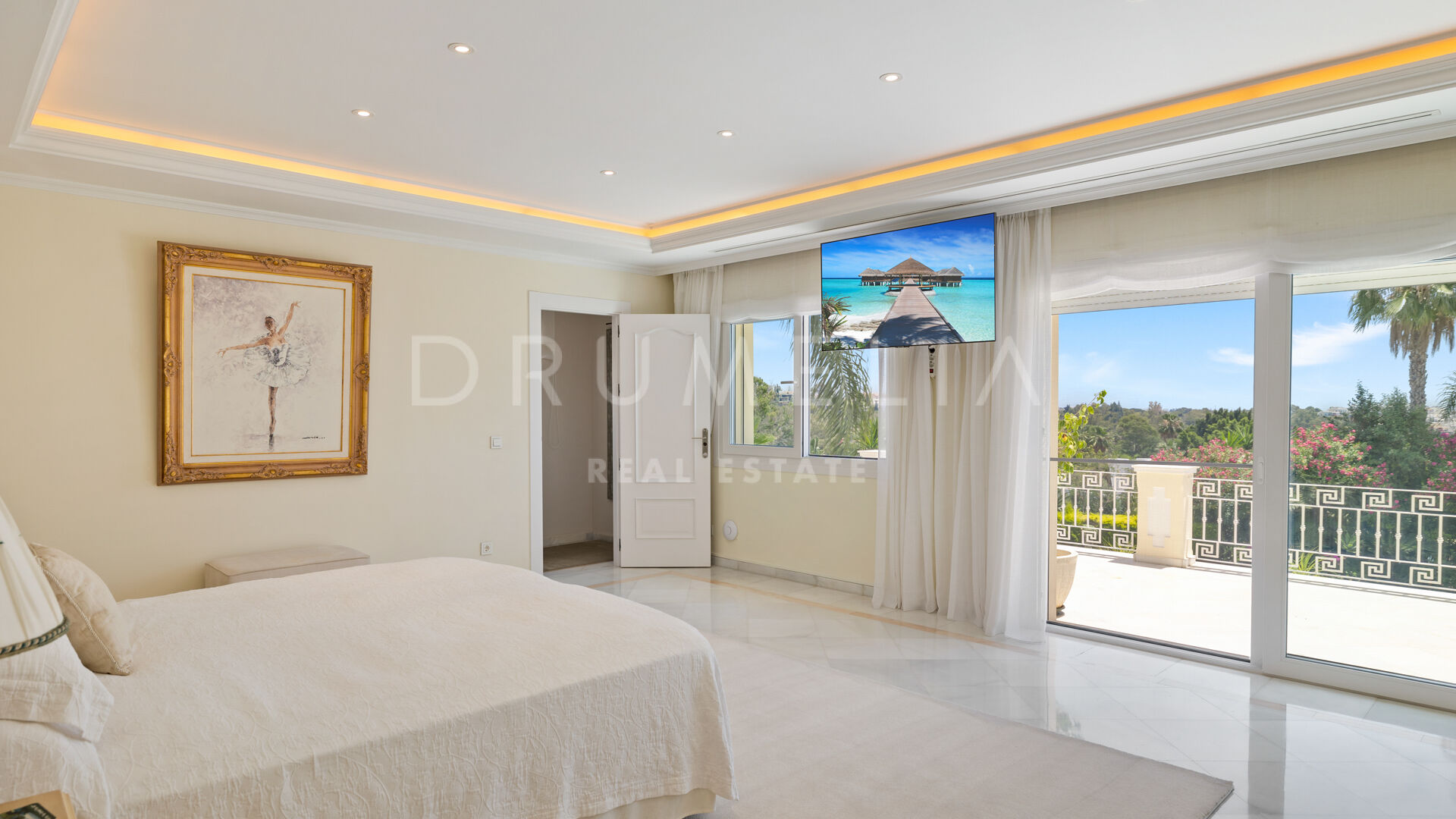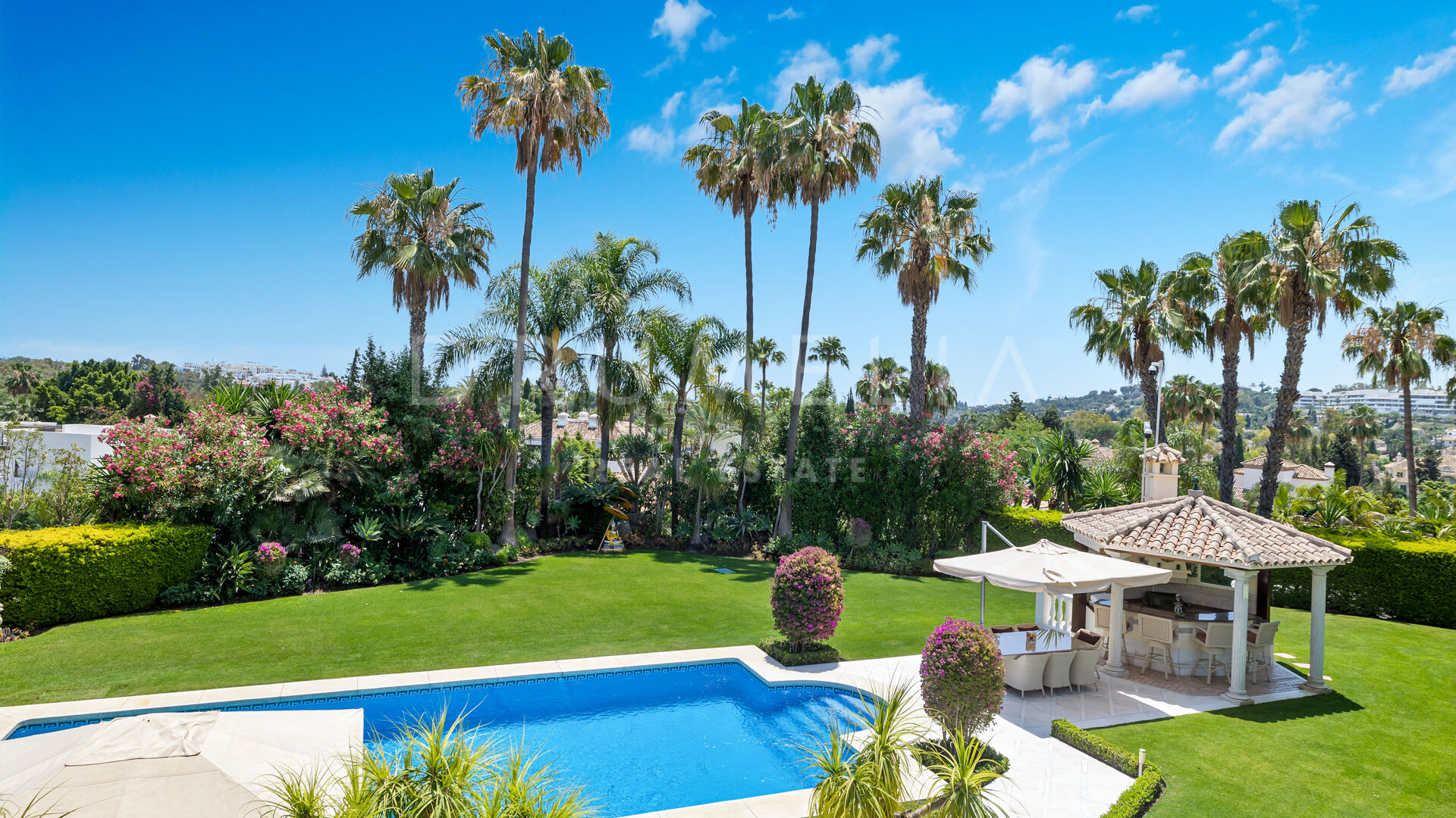 The first floor hosts an impressive Master suite with a luxurious bathroom, dressing area and access to the terrace with delightful views. The lower floor offers an entertainment area, wine cellar, cinema room, gym, storage and garage for 6 cars. A separate fully fitted guest or staff apartment adds exclusivity and comfort to this fabulous property. The beautiful mature gardens, outdoor chill-out and BBQ areas, and a nice sized heated pool invite to enjoy the world-famous Mediterranean lifestyle.