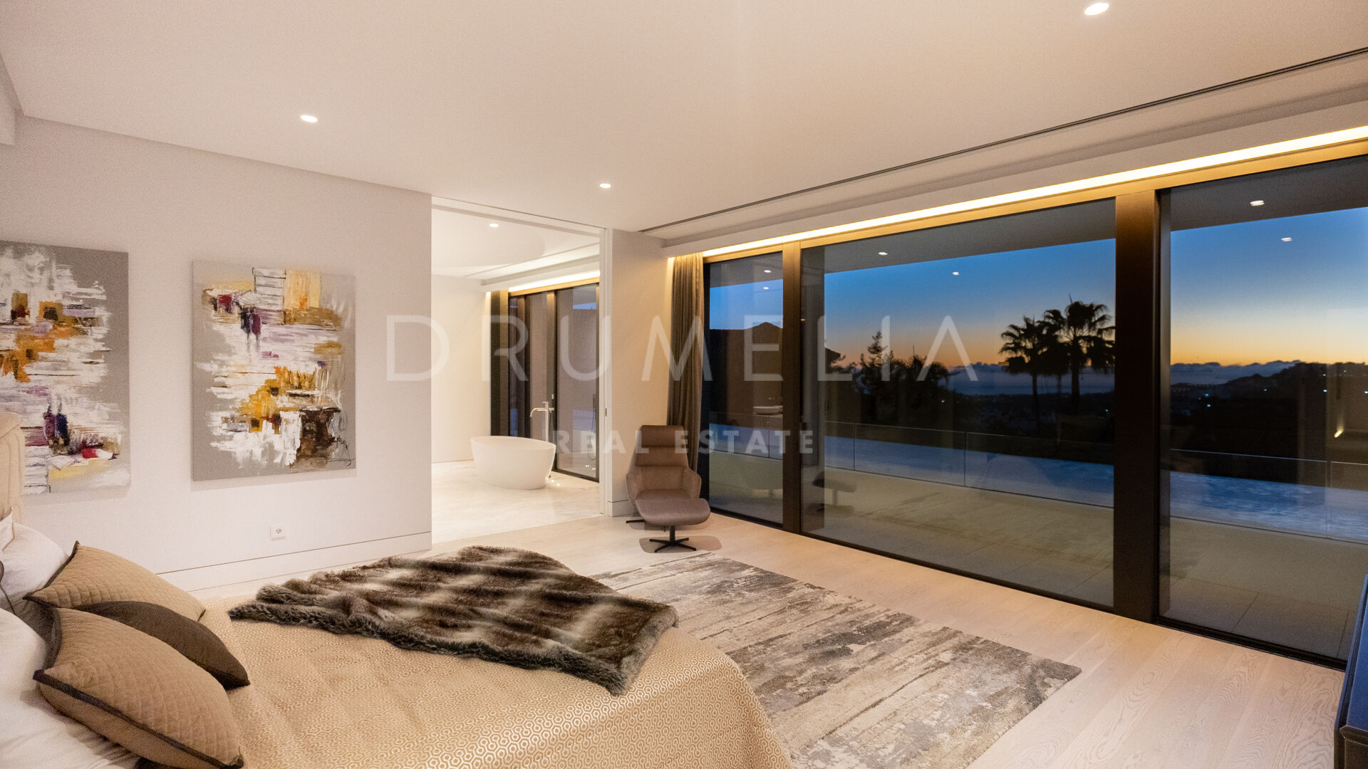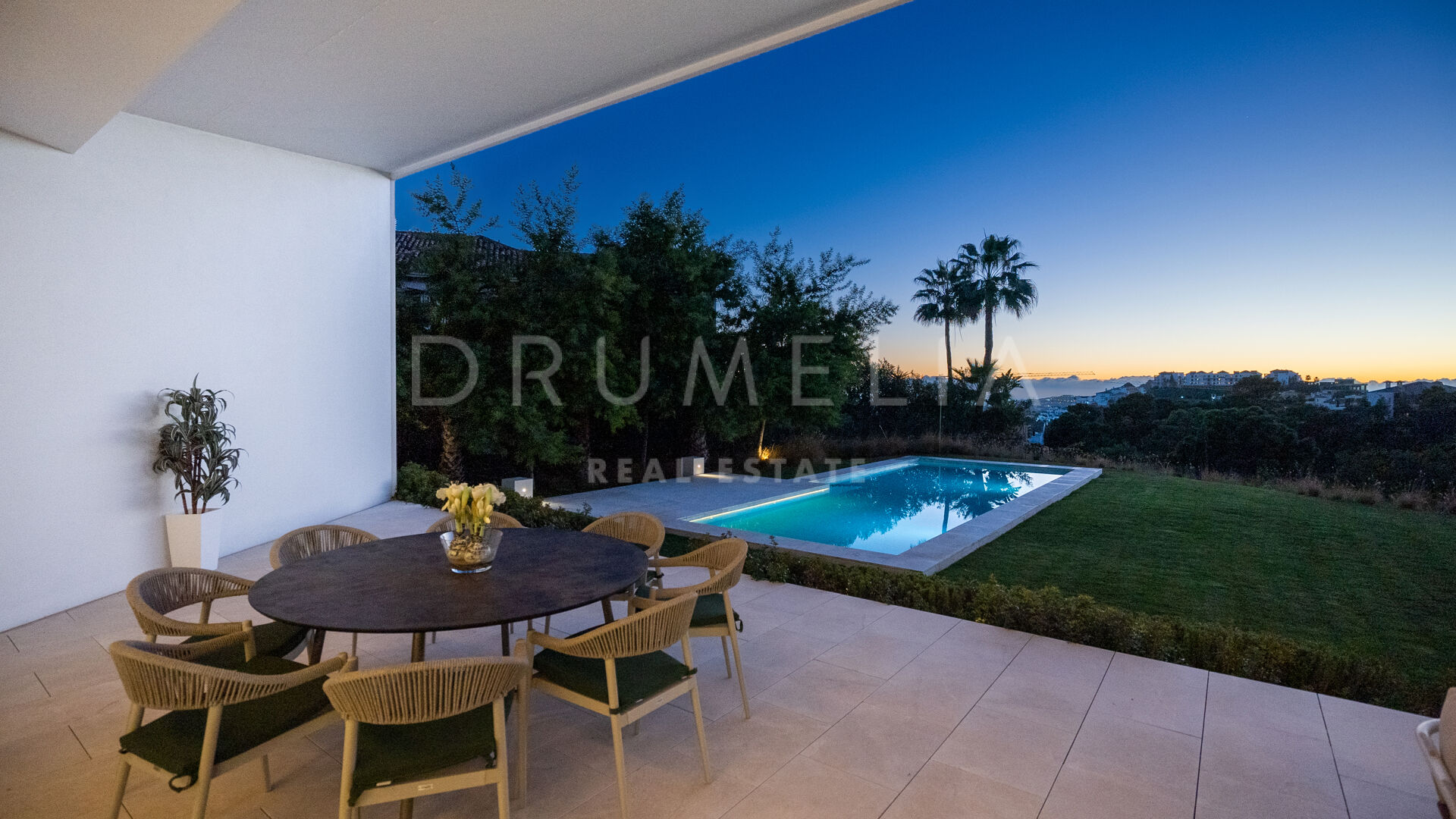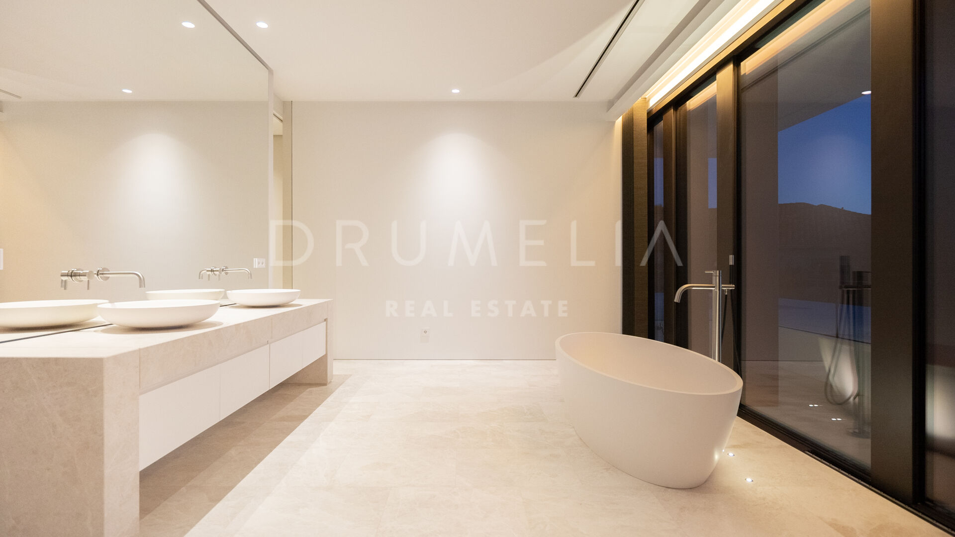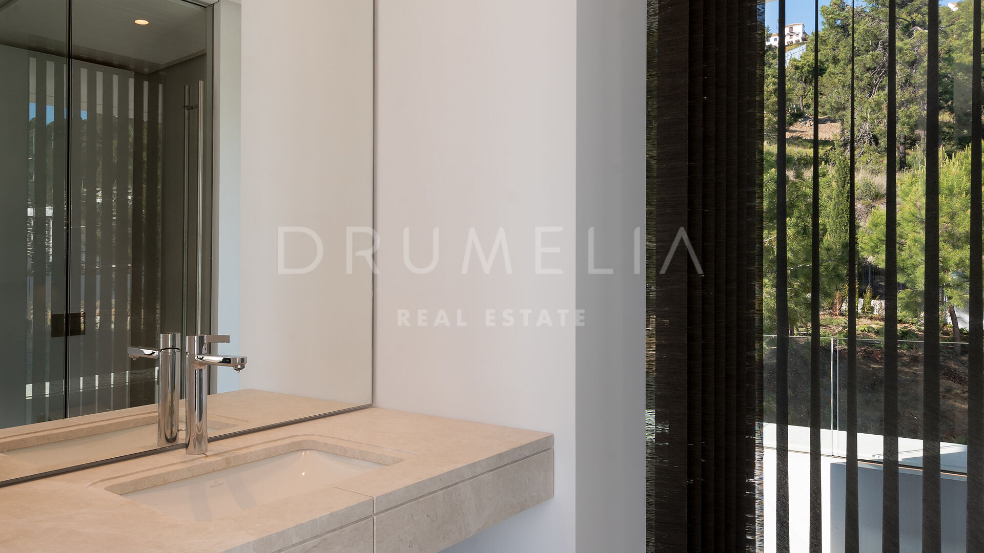 Recently built, gated with a checkpoint entrance La Reserva de Alcuzcuz is a very secure, green and spectacular residential development a short drive from the golf courses, sandy beaches, the mecca of glamour, chic parties, luxury brands and celebrities Puerto Banus and the resort towns of Marbella and San Pedro. Due to its elevated position, it boasts breath-taking unobstructed panoramic sea views towards Gibraltar and the African Coast, and to the picturesque Andalusian hills. It is quite unique, created in accordance with the criteria of sustainability, ecology and bioclimatic architecture (low operating costs through generously sized solar system, external and internal lighting with the latest energy saving technology, efficient thermal insulation with organic materials, automatic ventilation with temperature compared internally and externally in heating and cooling mode, the garden irrigation of the development working of its almost autonomous water supply).