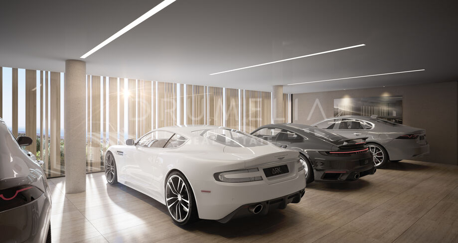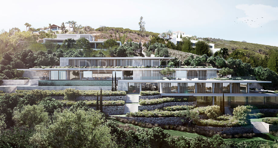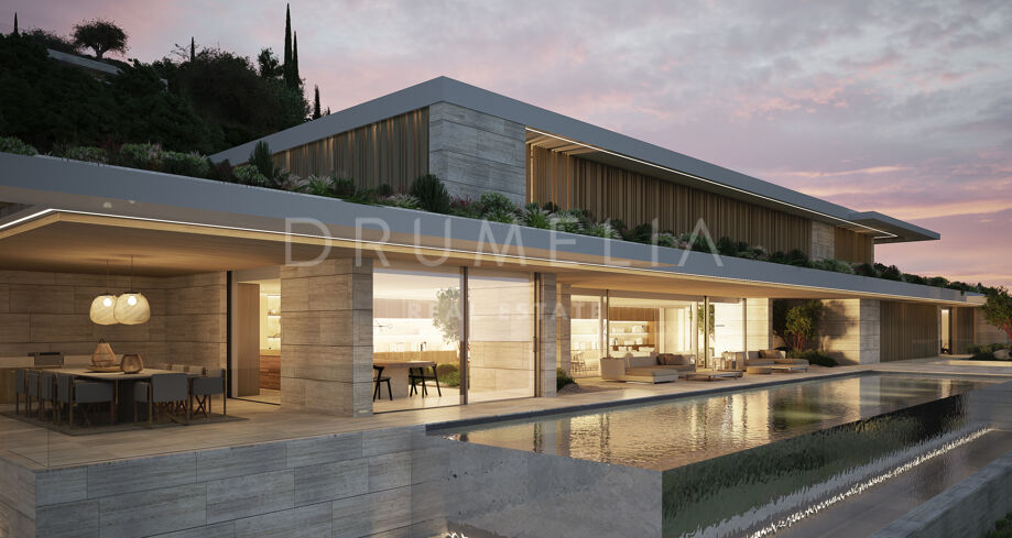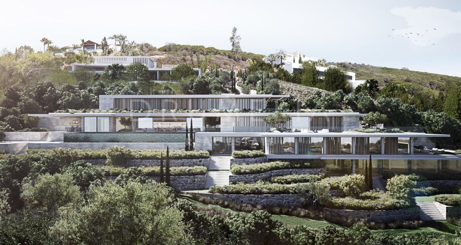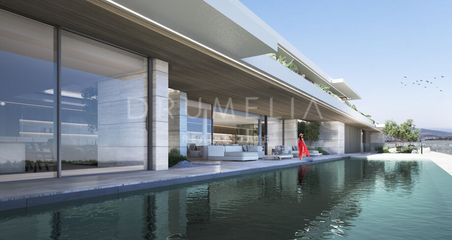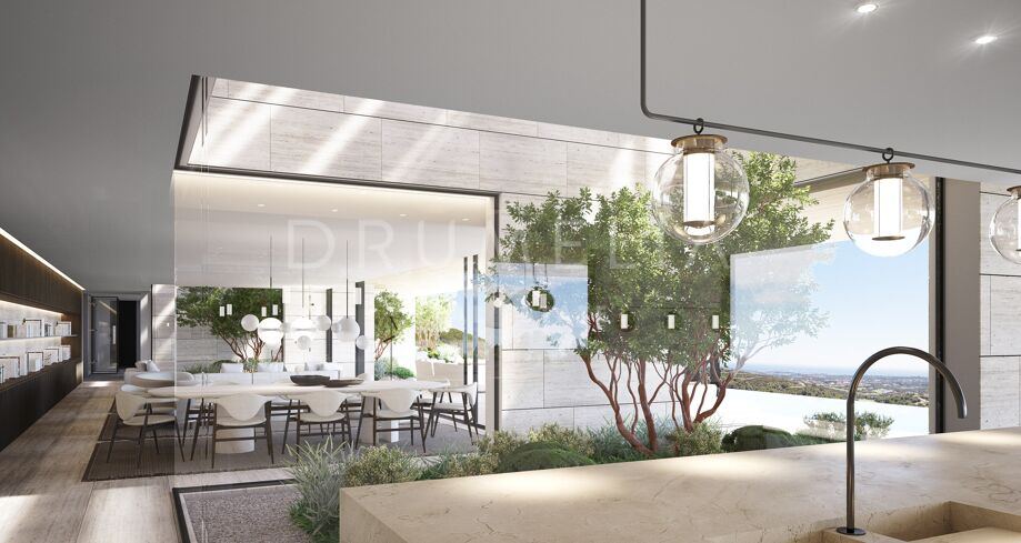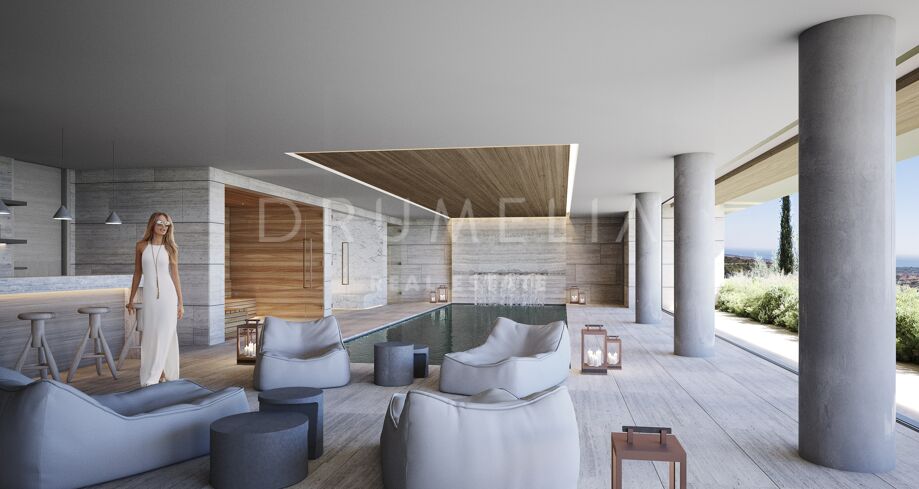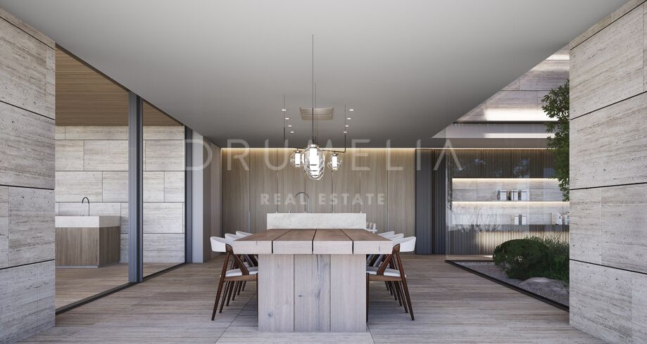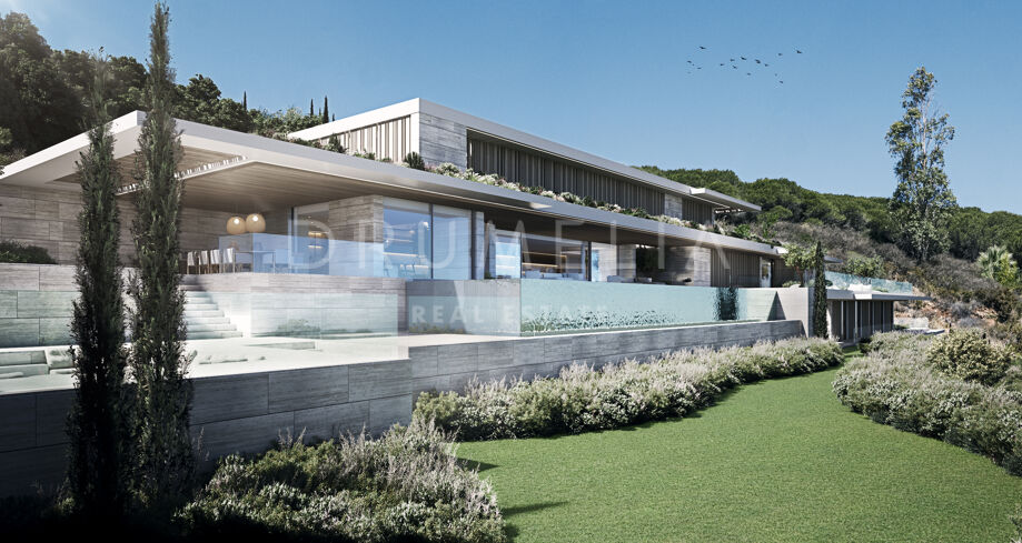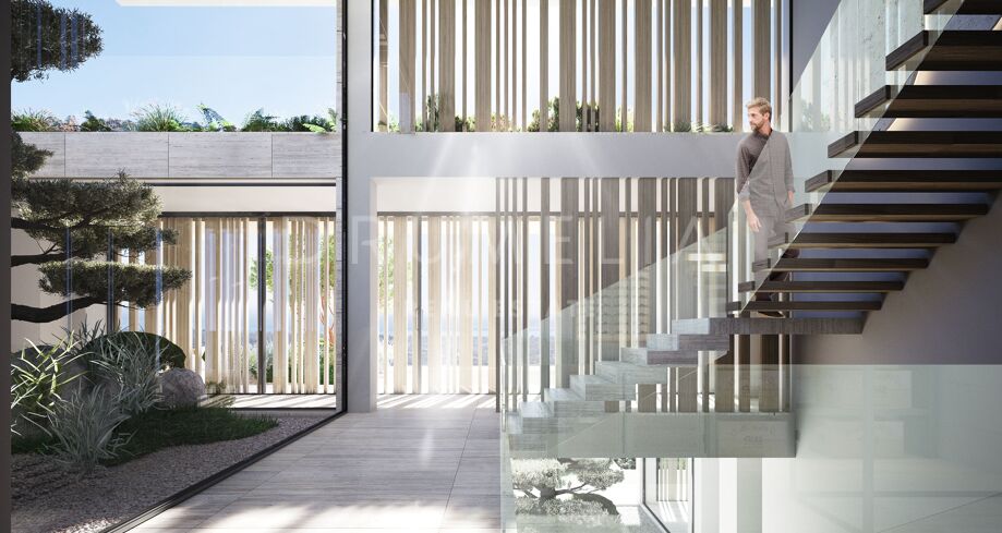 This 1 848m² mansion with terraces of 590 m² will be built on a beautiful large plot of 4.405 m². Due to the natural elevation of the area, it will enjoy delightful views to the sea and La Reserva de Sotogrande surroundings. The stunning house has a very stylish contemporary design, while the natural materials such as stone and wood will make it warm and inviting. Interior patios will immediately add life, vitality and calm into the inside spaces. Providing respect to the environment, the eco-friendly exterior is perfectly balanced with the interior, which interacts dynamically with the garden landscape, where the native species of southern Andalusia, olive trees, cypress, cork oak, lavender and rosemary allow nature to express itself.