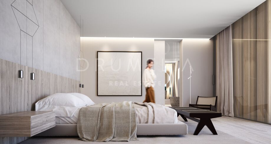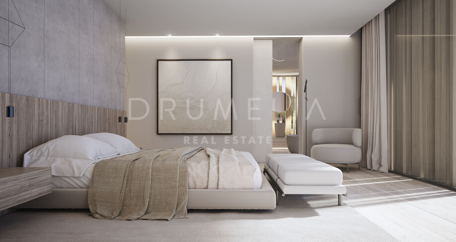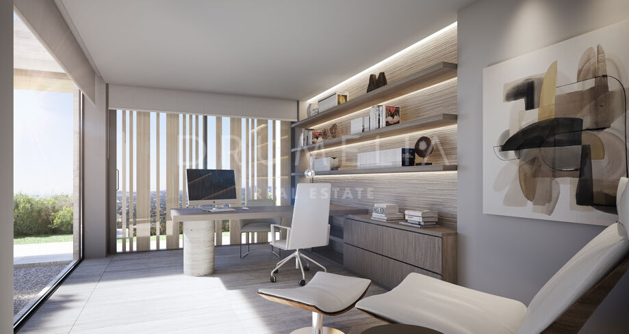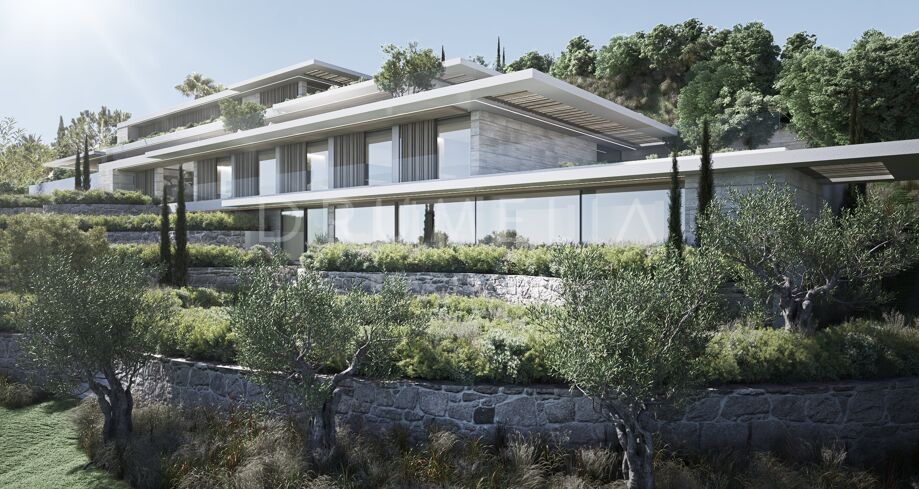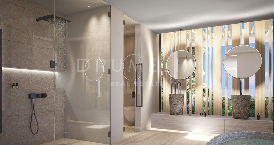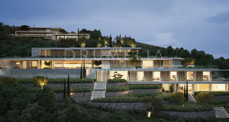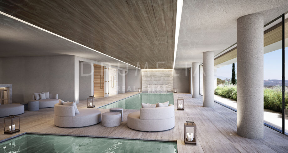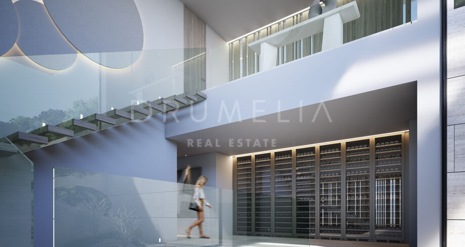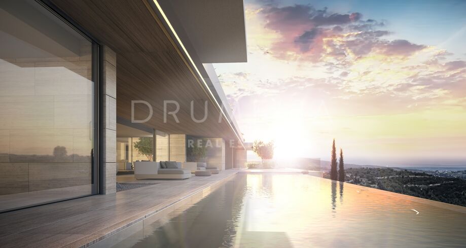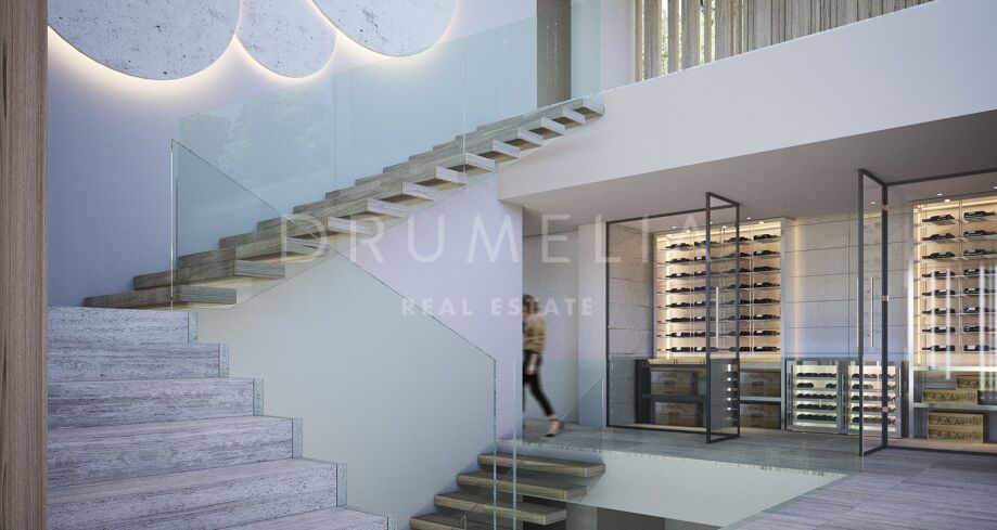This 1 848m² mansion with terraces of 590 m² will be built on a beautiful large plot of 4.405 m². Due to the natural elevation of the area, it will enjoy delightful views to the sea and La Reserva de Sotogrande surroundings. The stunning house has a very stylish contemporary design, while the natural materials such as stone and wood will make it warm and inviting. Interior patios will immediately add life, vitality and calm into the inside spaces. Providing respect to the environment, the eco-friendly exterior is perfectly balanced with the interior, which interacts dynamically with the garden landscape, where the native species of southern Andalusia, olive trees, cypress, cork oak, lavender and rosemary allow nature to express itself.