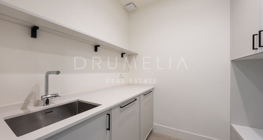 Built across four levels, the villa offers 433 m² of interior space on a 1,097 m² plot, complemented by 312 m² of terraces. The main floor features an open-plan living and dining area connected to a modern kitchen with a central island and a separate secondary kitchen. Floor-to-ceiling windows open onto the outdoor terraces and infinity pool, creating a seamless indoor-outdoor flow.