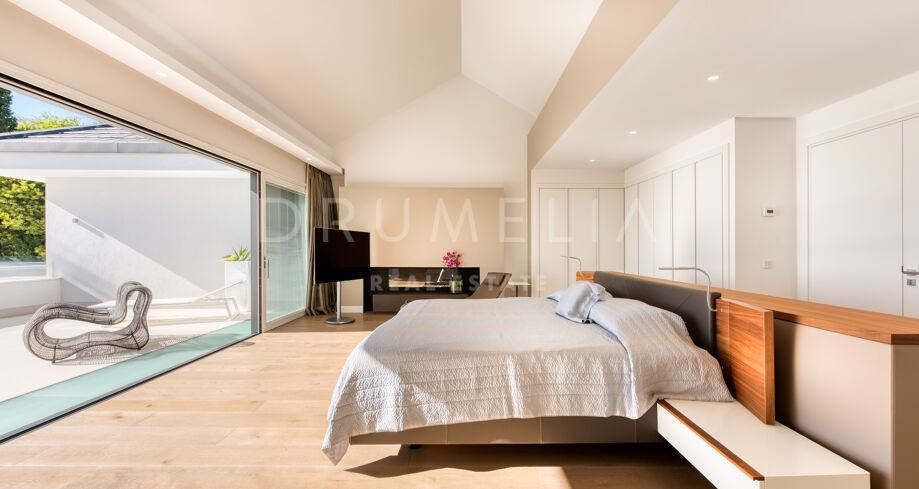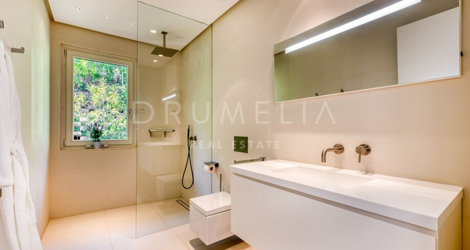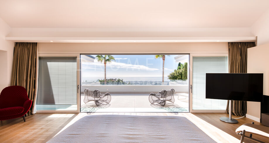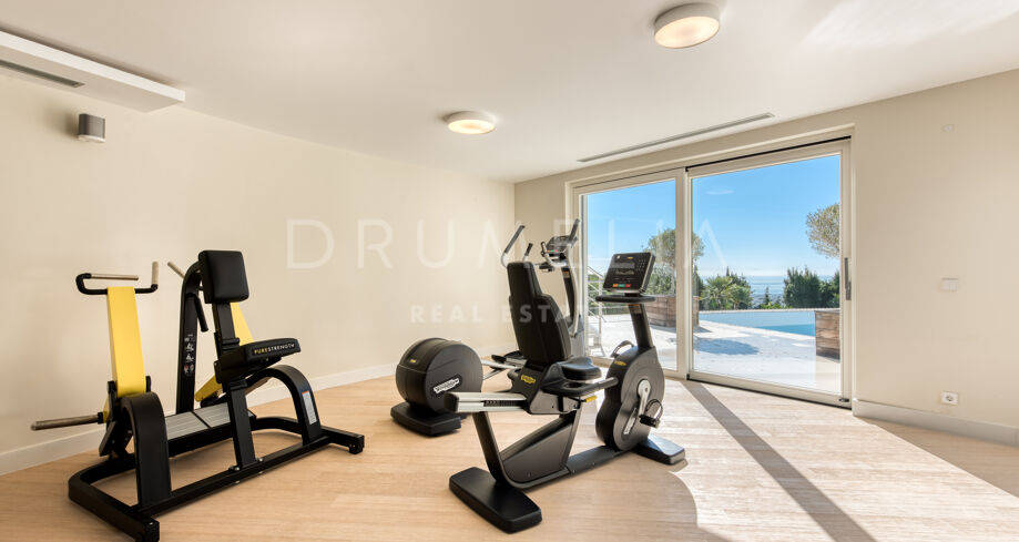 Set on a 4.826 m² plot, it is approached from a long driveway which leads to the south-facing 3-level contemporary house of 1.080 m². An entrance hall with beautiful sea views invites to a bright living room with double doors leading out to the terraces with a few steps down to a zero-edge swimming pool. The lounge leads to a modern fully-fitted and open-plan kitchen with a dining room, which has access to another covered terrace. This level hosts one of the Master suites with bedroom and bathroom, a Guest suite also with en-suite bathroom, a large gym, a sauna and a steam room. The remaining 3 bedrooms are on the upper level, each has an en-suite bathroom. A very large Master bedroom has a fireplace and a private terrace, the master bathroom has a shower, freestanding bath and fireplace. The lower level contains an indoor swimming pool, a cinema screen and a bar.
