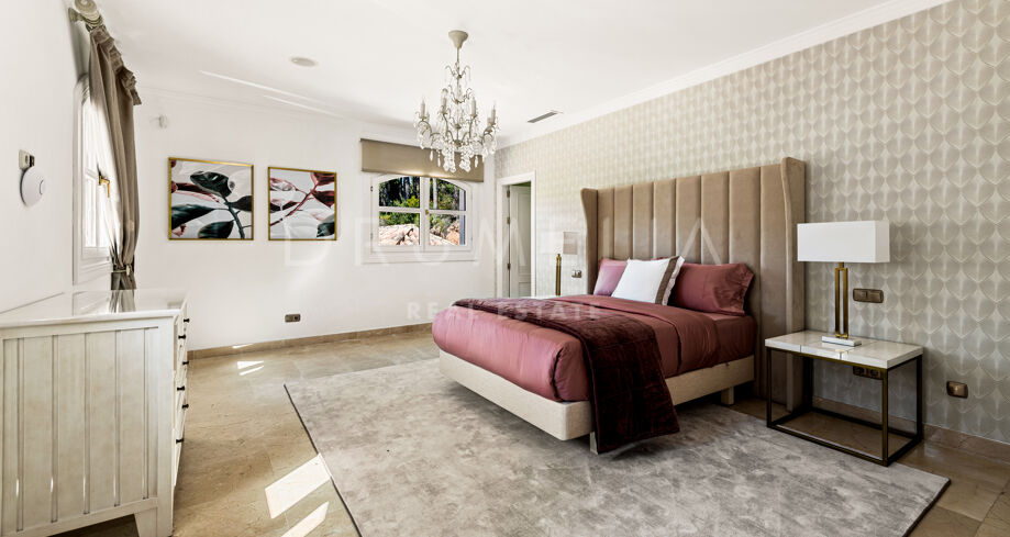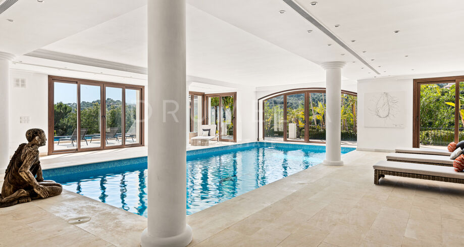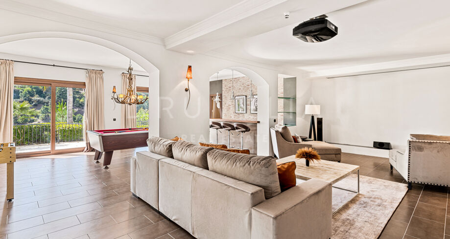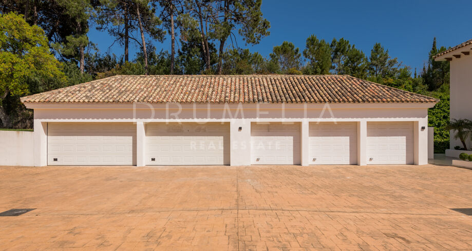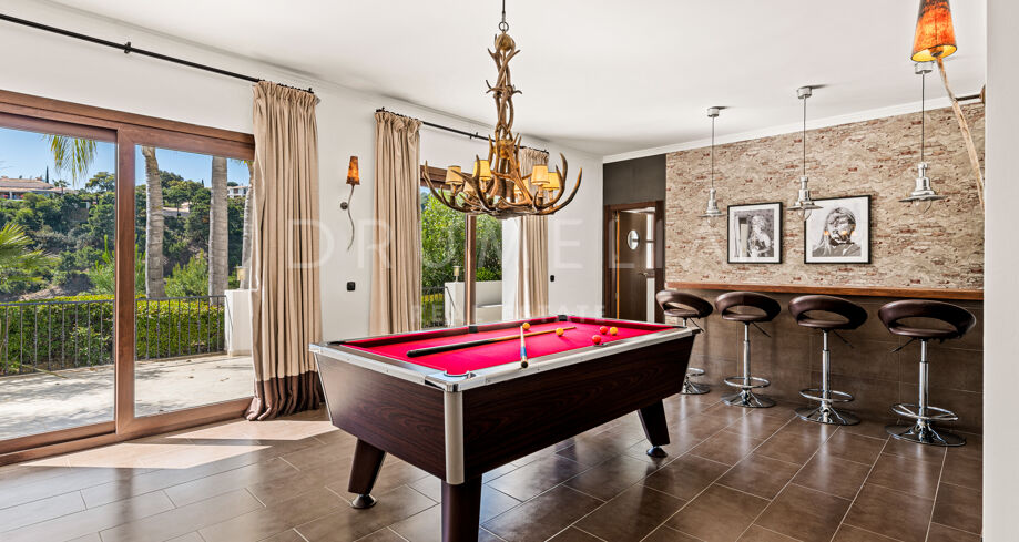 Surrounded by protected nature and similar high-end properties, the south-facing property affords panoramic views of the idyllic hills and valleys, picture-perfect coastline and the Mediterranean Sea all the way to Africa. The main house has 3 floors and 8 bedroom suites: the top floor features 5, the main floor 2 and the basement level 1. The main floor features a spacious living room, a cosy TV salon, a dining area and a large contemporary kitchen with access to the outdoor dining and BBQ area. The grand Master suite on the upper floor boasts its own balcony with unforgettable sea views and a luxurious bathroom with Jacuzzi. The basement level has a fabulous games/cinema room, which is tastefully decorated and fully fitted with a Cinema projector, pool table and bar area; a gym and SPA- area with an indoor swimming pool. It leads out to the immaculately maintained, lush mature gardens offering the best outdoor living, including the infinity pool, sunbathing area and a built-in gazebo with a pool bar area. Covered and uncovered terraces of 250 m² have sunbathing, chill-out and al fresco dining areas. A driveway leads to 5 individual garages. A guest house is a perfect solution for hosting friends and family at your grand property.