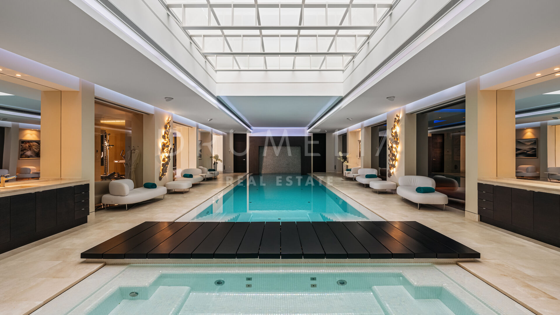 Casa Valentino features 7 bedrooms and 9 bathrooms spread across three floors, all accessible via an elevator. High-end furniture from prestigious brands like Smania, Fendi, Manutti, and Technogym, along with Bang & Olufsen TVs and speakers, grace the interiors. The property includes a cinema room, games room, spa, and fitness area complete with gym, heated indoor pool, Jacuzzi, sauna, and Turkish bath. Expansive terraces (400 m²) encourage an indoor/outdoor lifestyle with both covered and sunlit areas.
