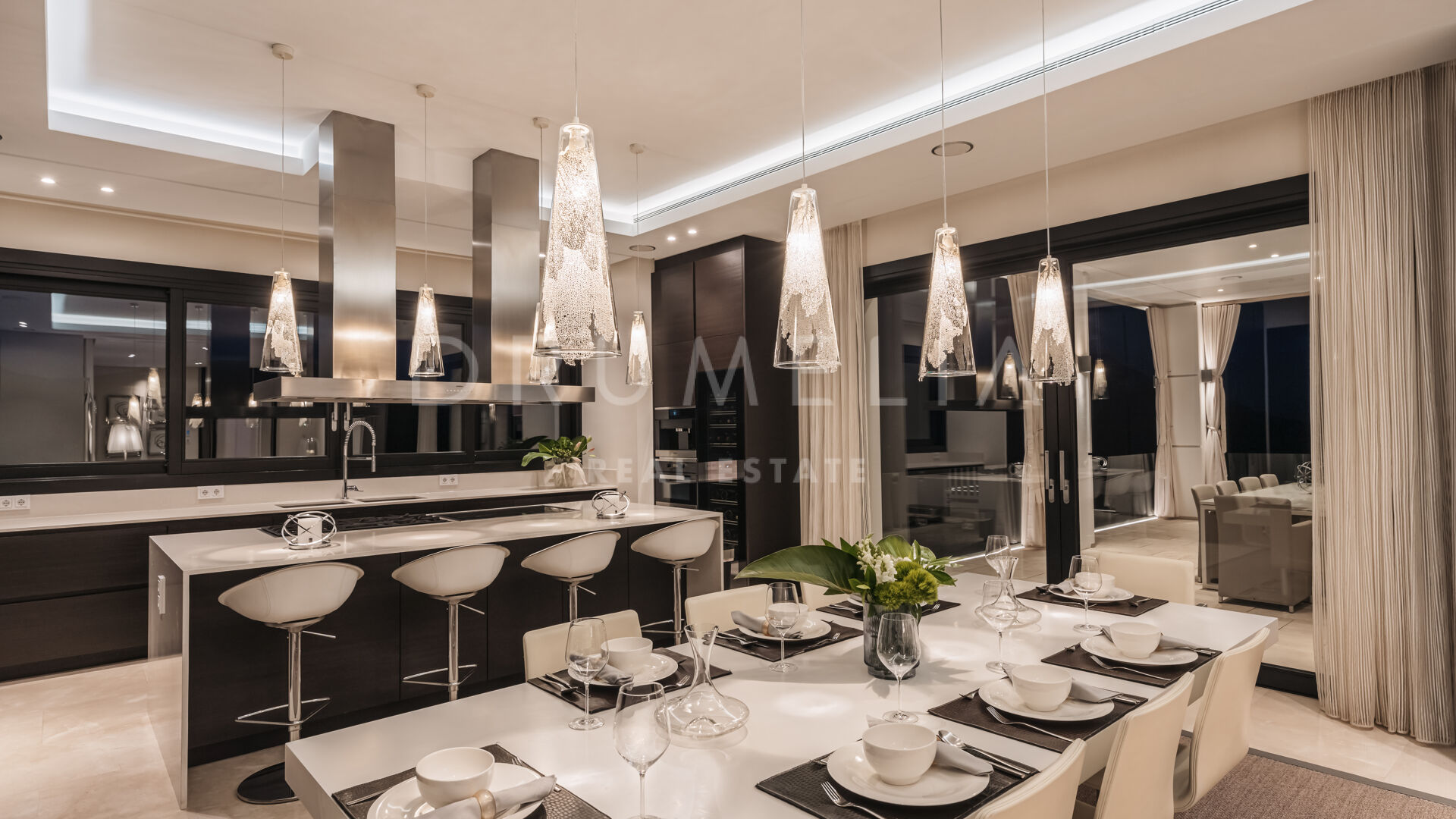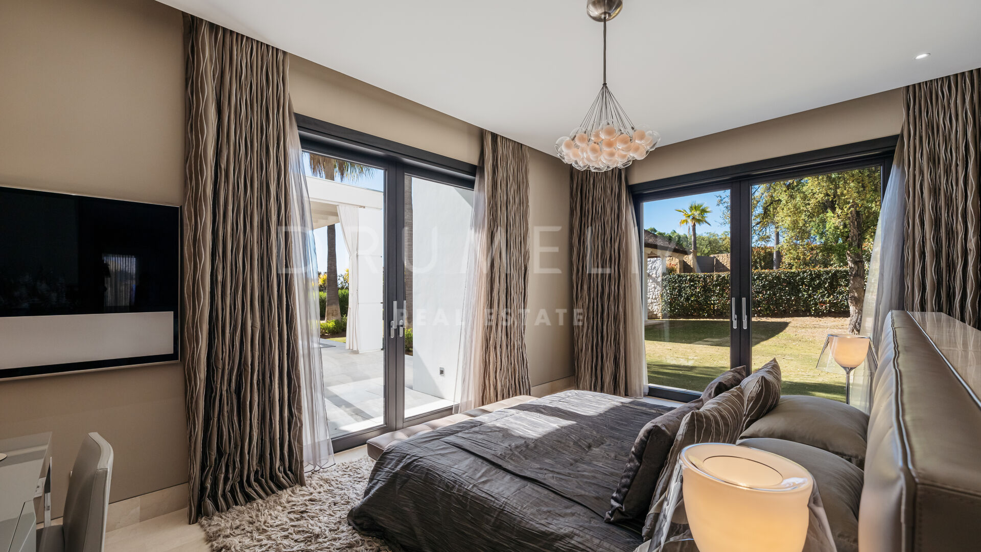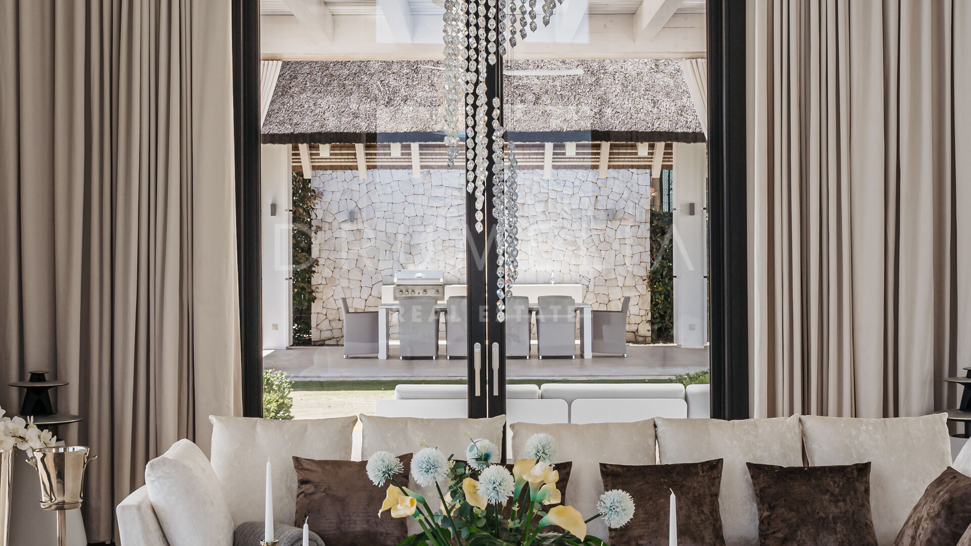This eco-friendly residence is outfitted with solar panels, a Lutron home automation system, air conditioning, marble floors with underfloor heating, double-glazing, and fitted wardrobes. Kitchen amenities include both gas and induction cooking areas, Gaggenau refrigerators, Miele dishwashers, and a built-in wine cooler. The property also boasts a substantial backup water reservoir and a comprehensive alarm system with 24-hour monitoring. With significant luxury rental potential, the property currently employs three staff members who oversee cleaning, garden and pool maintenance, and technical equipment upkeep, all of whom are available to continue their services for the new owner.