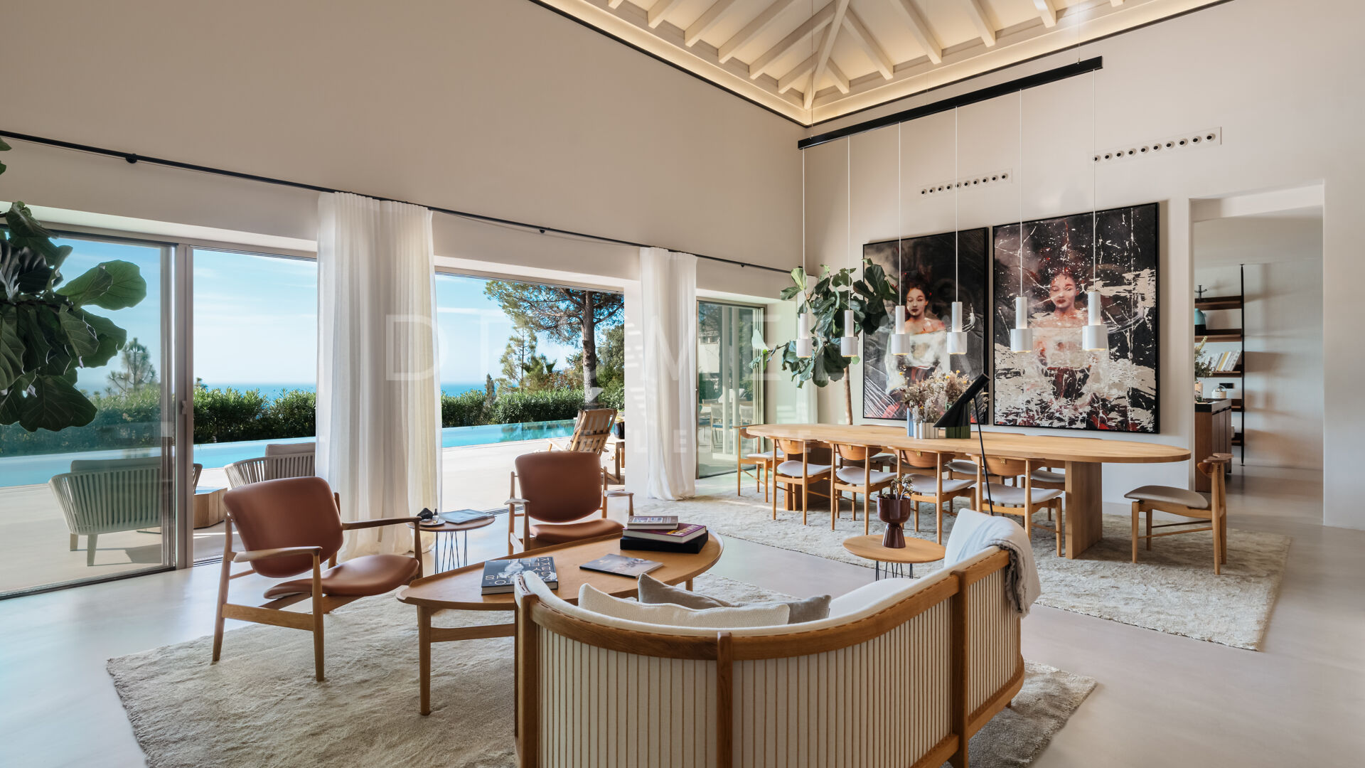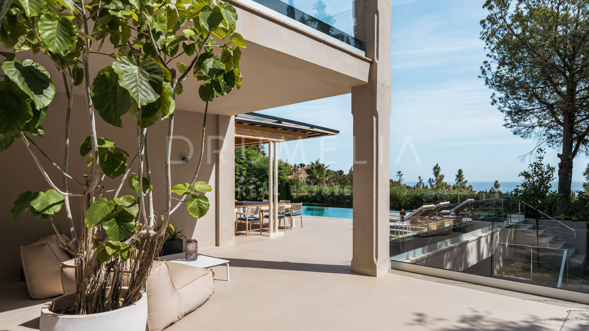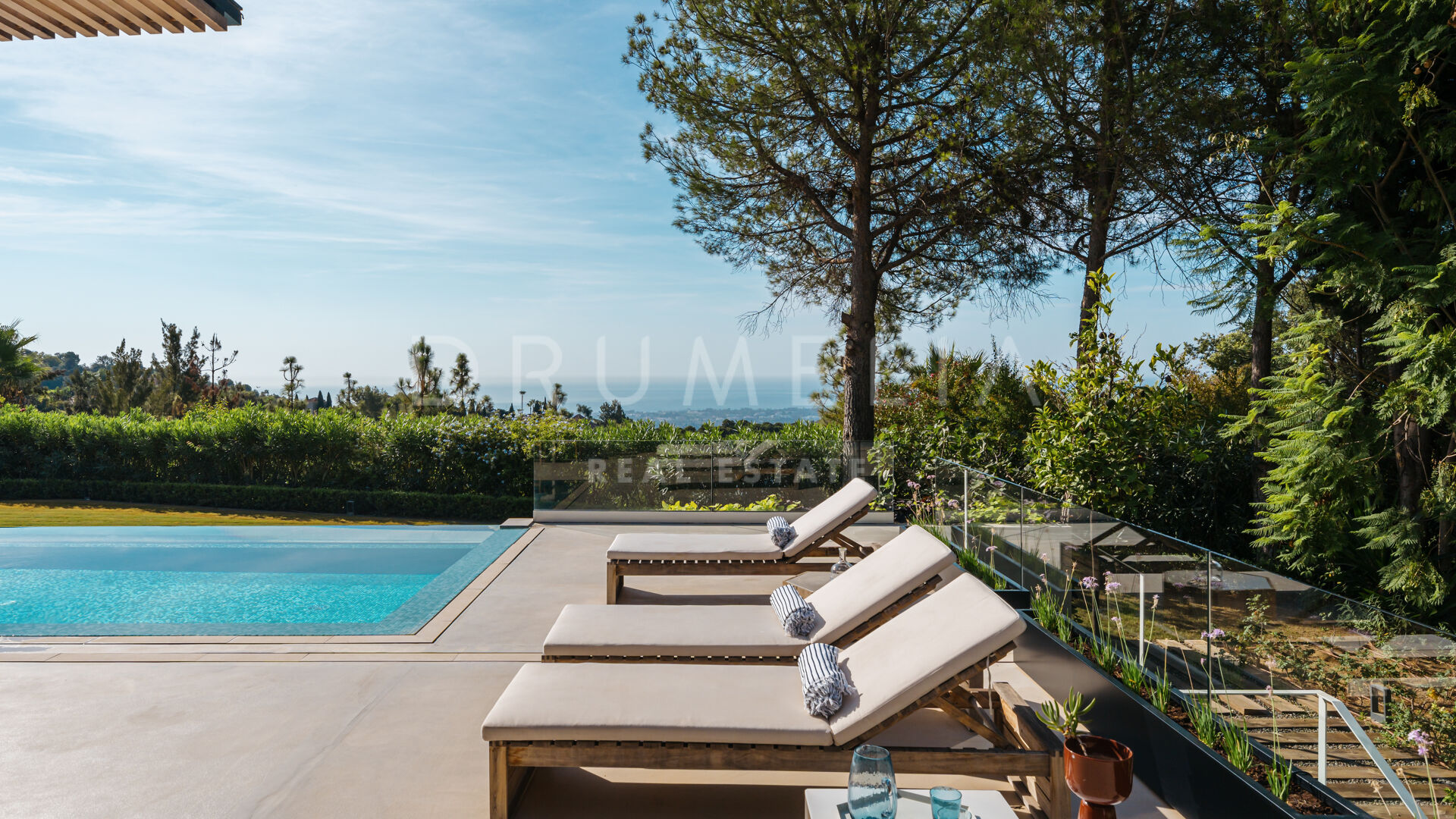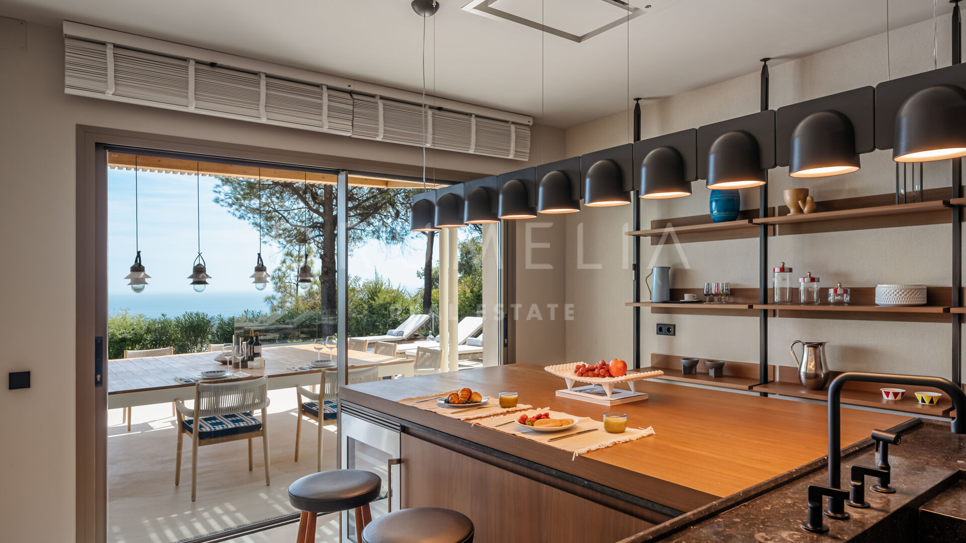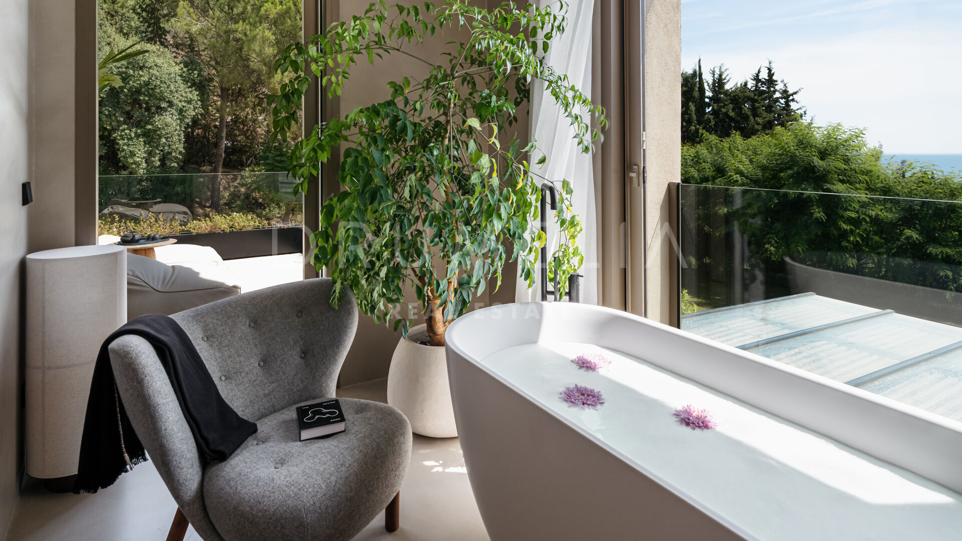 The detached residence of 862 m², spread over 3 levels, offers prestigious, custom-designed furniture. South-facing, it is situated on a large plot of 4.017 m² with magnificent landscaped gardens and 120 m² of terraces with impressive views of the coast and the mountains. It has been designed using innovative methods, traditional and modern high-quality materials, offering a smart design to ensure very comfortable living spaces and a truly exquisite lifestyle, blending Mediterranean feelings with a Scandinavian touch. You enter this magnificent villa through a long driveway leading to the main door framed by olive trees. The ground floor includes a superb entrance hall that leads to the elegant living area with a dining room and a stunning lounge with double-height vaulted ceilings. An Arrital fully equipped kitchen with Gaggenau appliances and indoor and outdoor dining areas. On the west and east wings, there are two en-suite bedrooms, both with terraces and sea views, plus a guest toilet complete this level. Large covered and uncovered terraces lead to an infinity pool (over 13 m long) which enjoys sea views. The flat subtropical garden is located just in front and around the property, featuring an automatic irrigation system and splendid views of the coast and the idyllic surroundings.