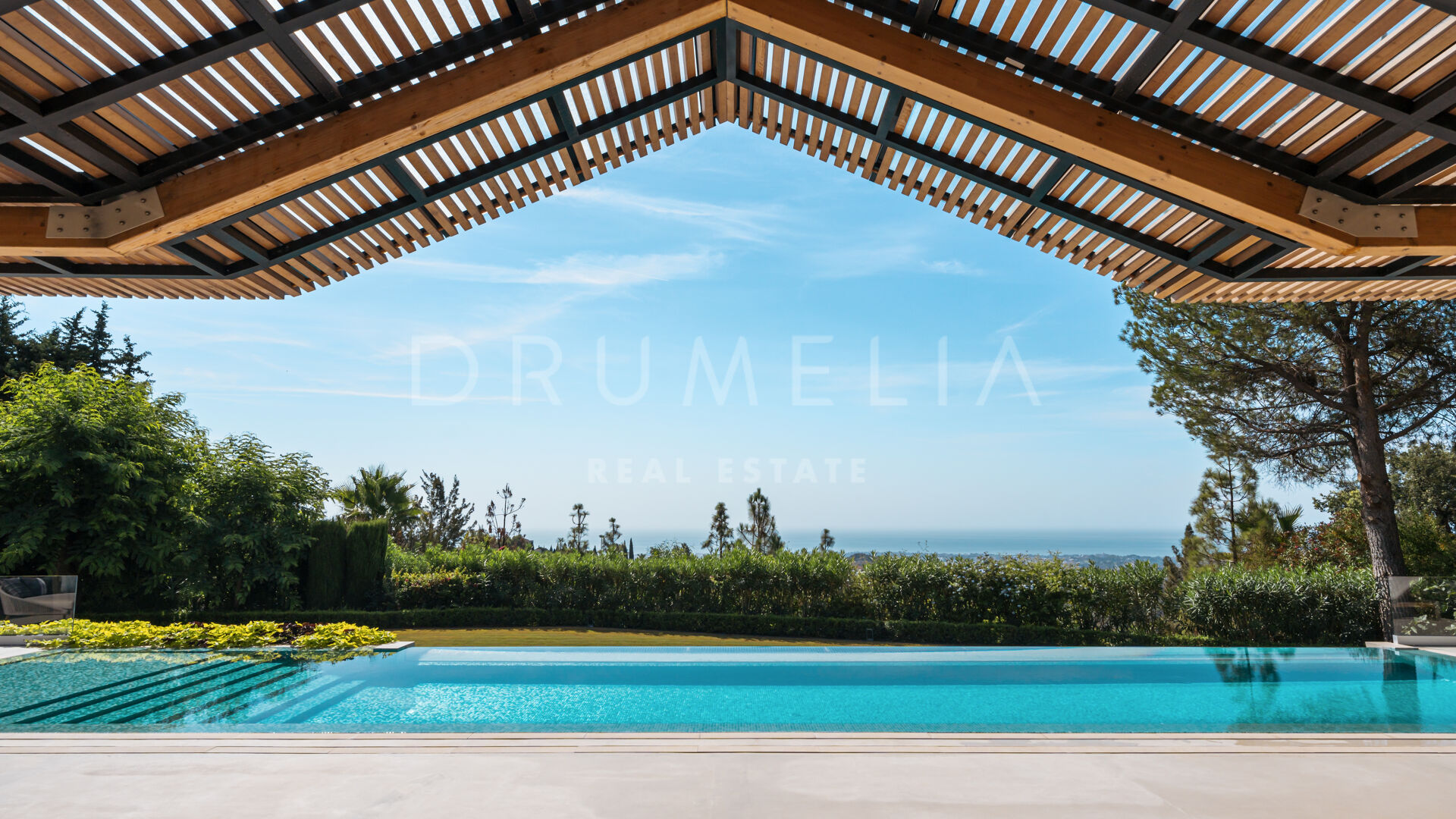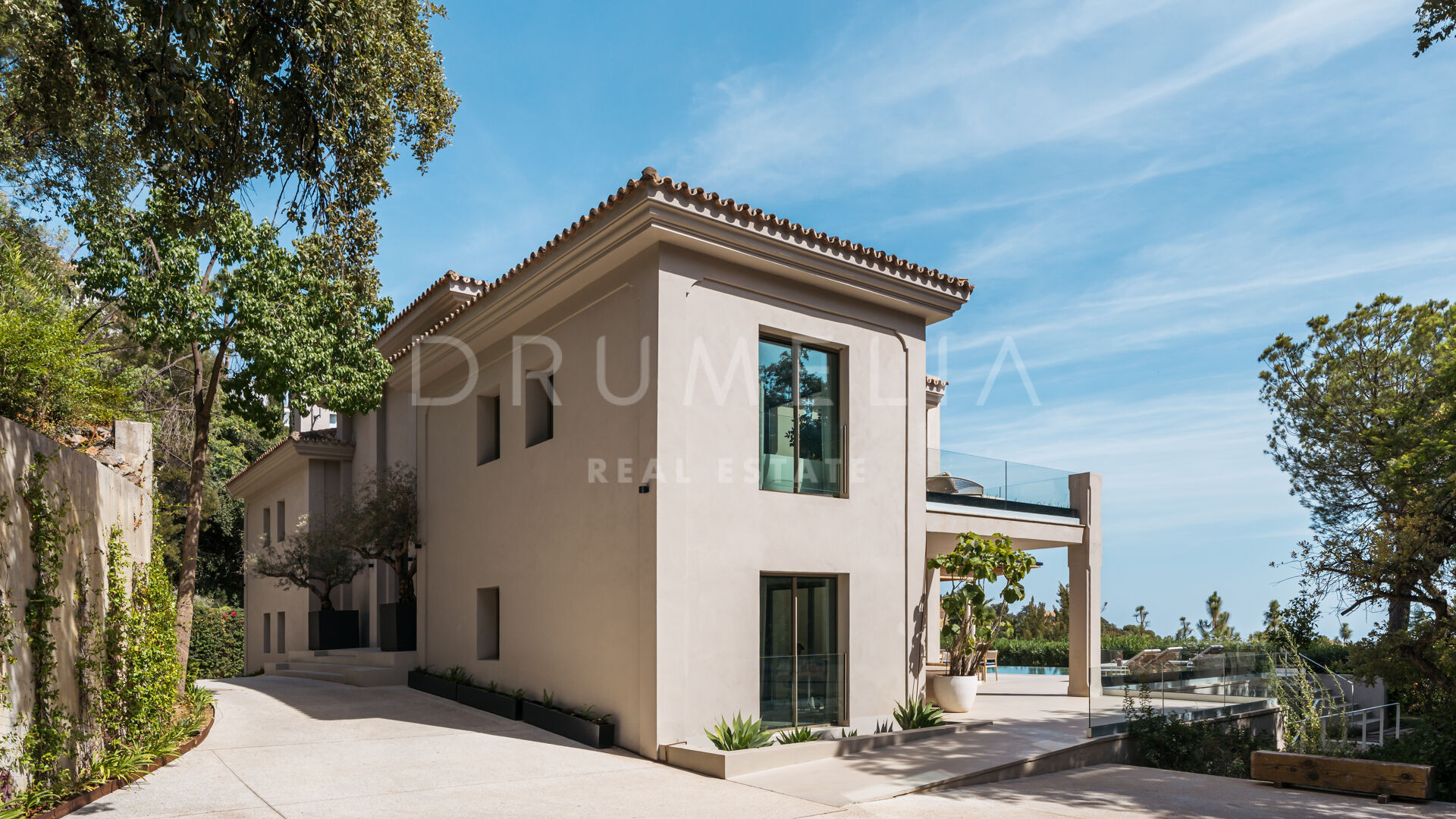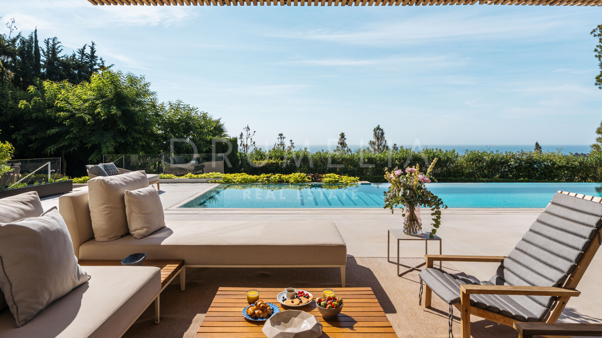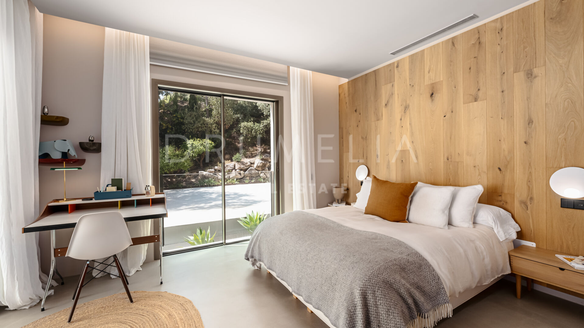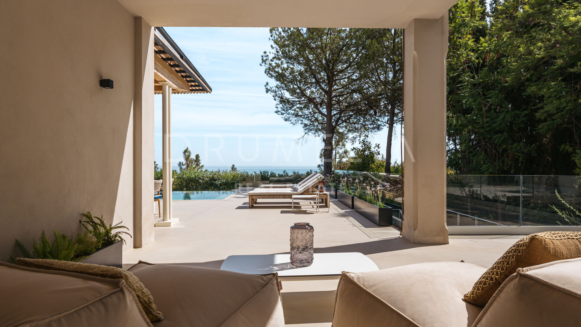 The detached residence of 862 m², spread over 3 levels, offers prestigious, custom-designed furniture. South-facing, it is situated on a large plot of 4.017 m² with magnificent landscaped gardens and 120 m² of terraces with impressive views of the coast and the mountains. It has been designed using innovative methods, traditional and modern high-quality materials, offering a smart design to ensure very comfortable living spaces and a truly exquisite lifestyle, blending Mediterranean feelings with a Scandinavian touch. You enter this magnificent villa through a long driveway leading to the main door framed by olive trees. The ground floor includes a superb entrance hall that leads to the elegant living area with a dining room and a stunning lounge with double-height vaulted ceilings. An Arrital fully equipped kitchen with Gaggenau appliances and indoor and outdoor dining areas. On the west and east wings, there are two en-suite bedrooms, both with terraces and sea views, plus a guest toilet complete this level. Large covered and uncovered terraces lead to an infinity pool (over 13 m long) which enjoys sea views. The flat subtropical garden is located just in front and around the property, featuring an automatic irrigation system and splendid views of the coast and the idyllic surroundings.