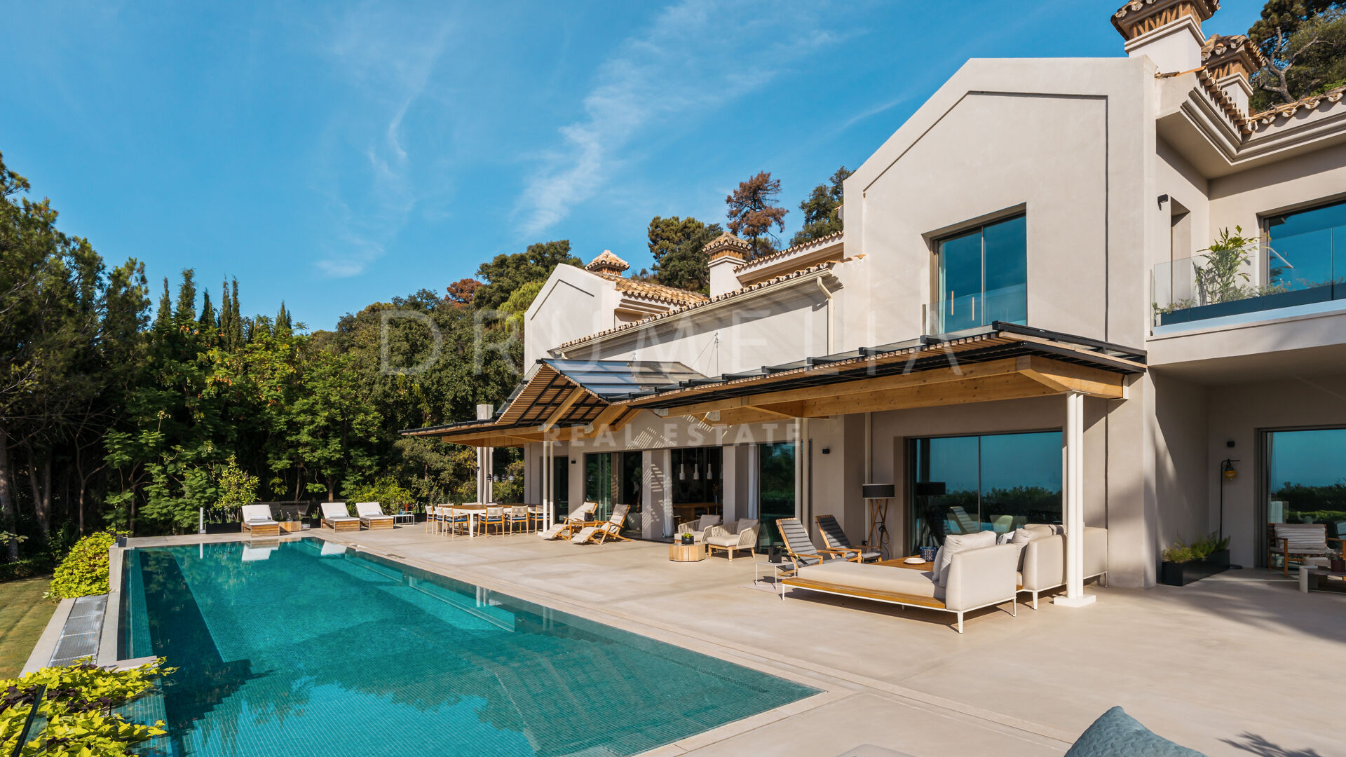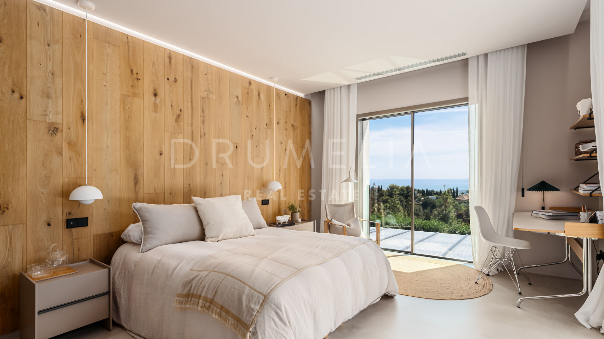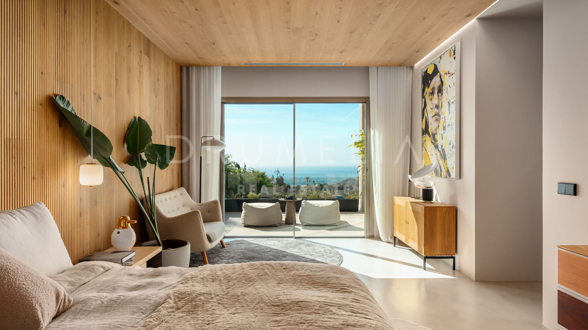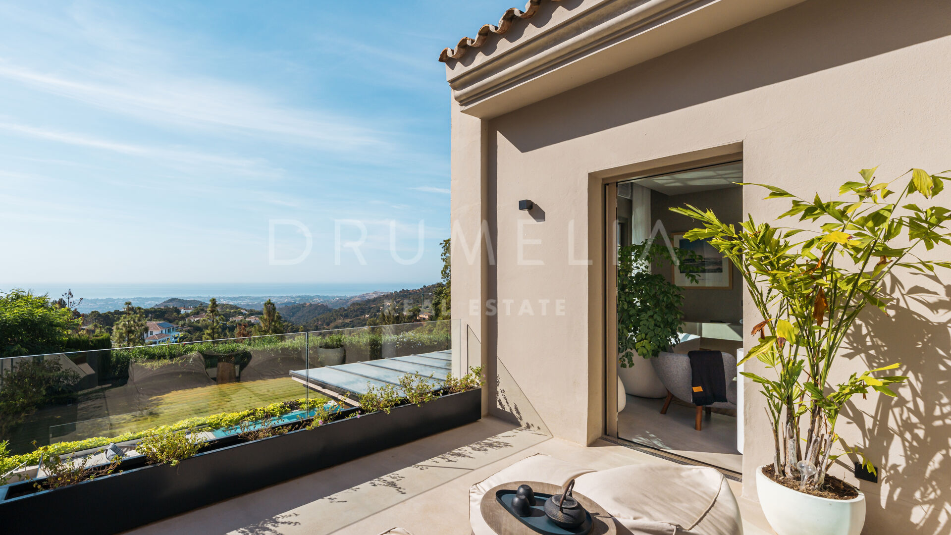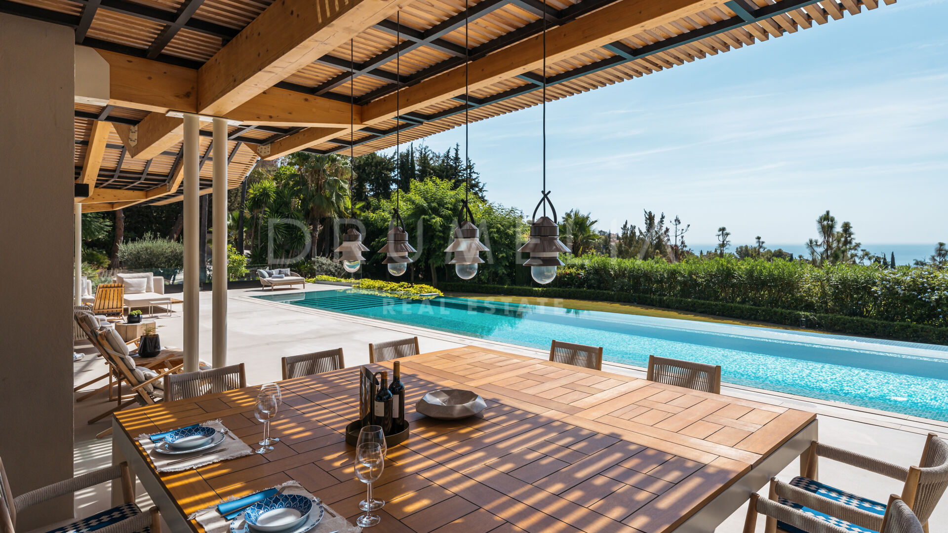 The detached residence of 862 m², spread over 3 levels, offers prestigious, custom-designed furniture. South-facing, it is situated on a large plot of 4.017 m² with magnificent landscaped gardens and 120 m² of terraces with impressive views of the coast and the mountains. It has been designed using innovative methods, traditional and modern high-quality materials, offering a smart design to ensure very comfortable living spaces and a truly exquisite lifestyle, blending Mediterranean feelings with a Scandinavian touch. You enter this magnificent villa through a long driveway leading to the main door framed by olive trees. The ground floor includes a superb entrance hall that leads to the elegant living area with a dining room and a stunning lounge with double-height vaulted ceilings. An Arrital fully equipped kitchen with Gaggenau appliances and indoor and outdoor dining areas. On the west and east wings, there are two en-suite bedrooms, both with terraces and sea views, plus a guest toilet complete this level. Large covered and uncovered terraces lead to an infinity pool (over 13 m long) which enjoys sea views. The flat subtropical garden is located just in front and around the property, featuring an automatic irrigation system and splendid views of the coast and the idyllic surroundings.