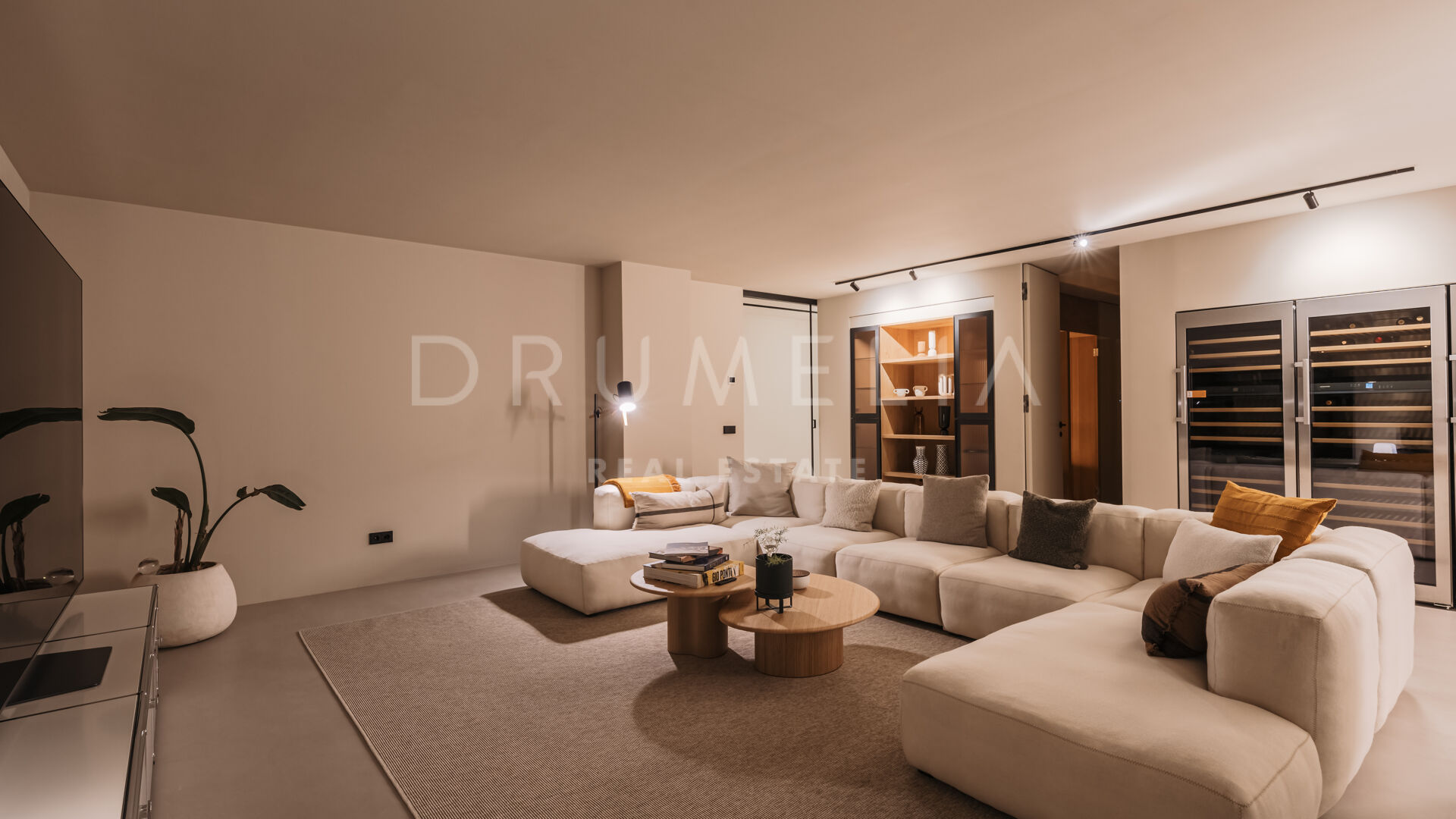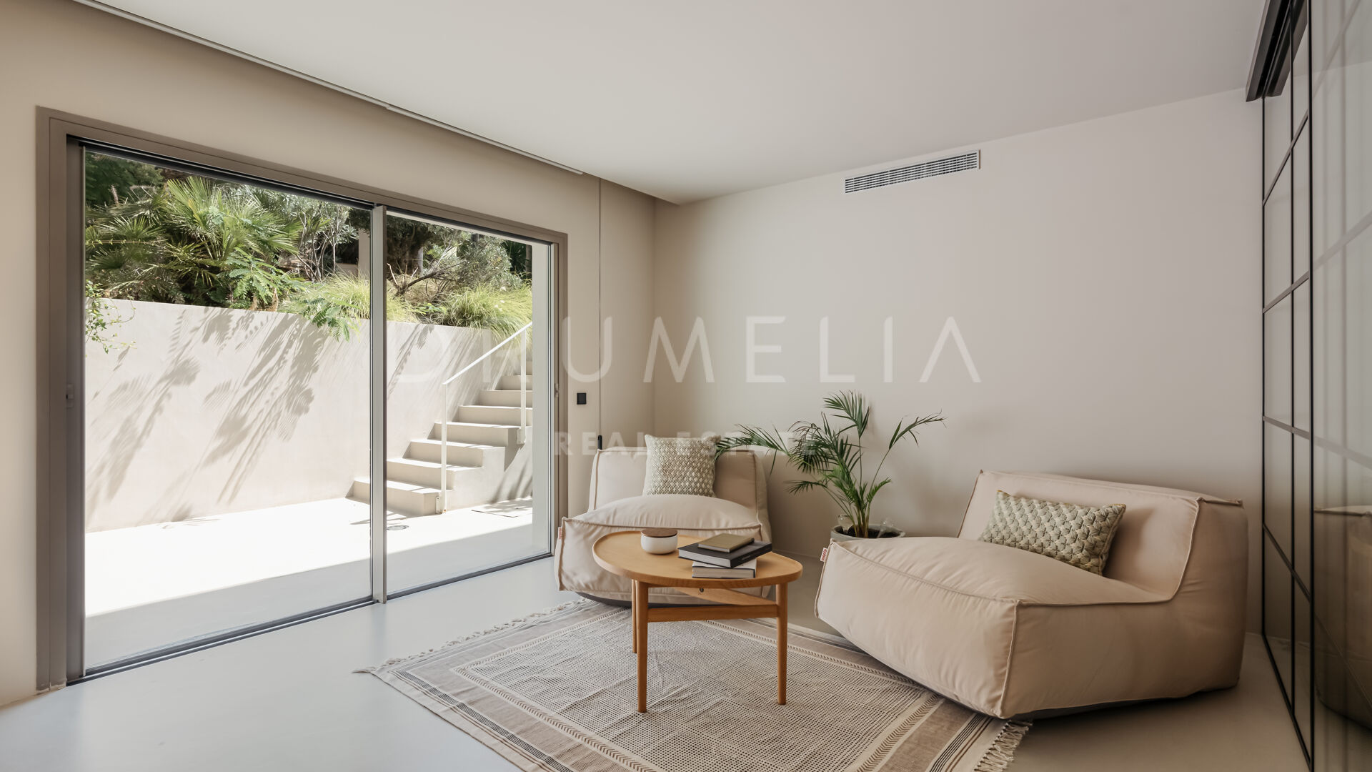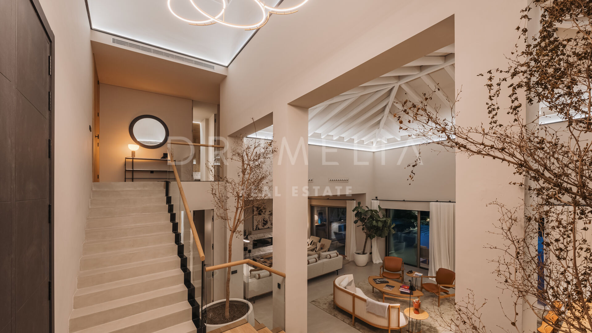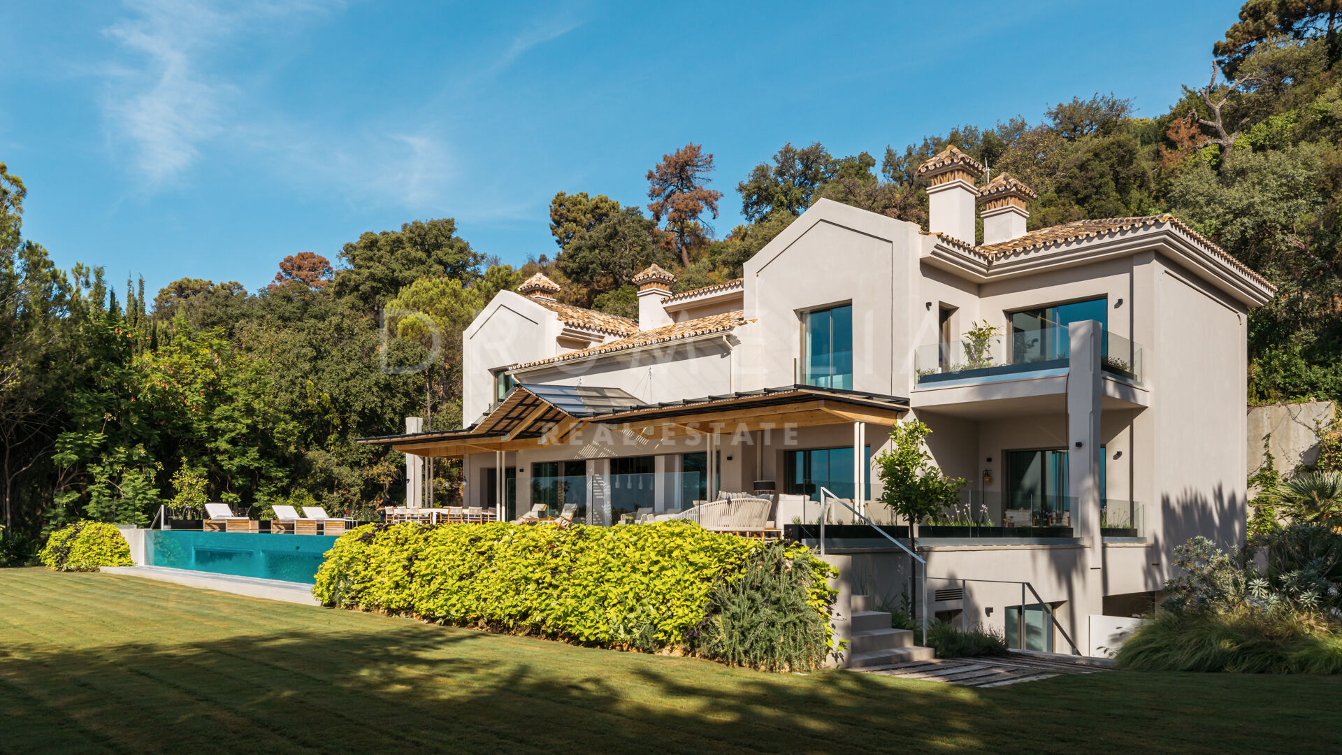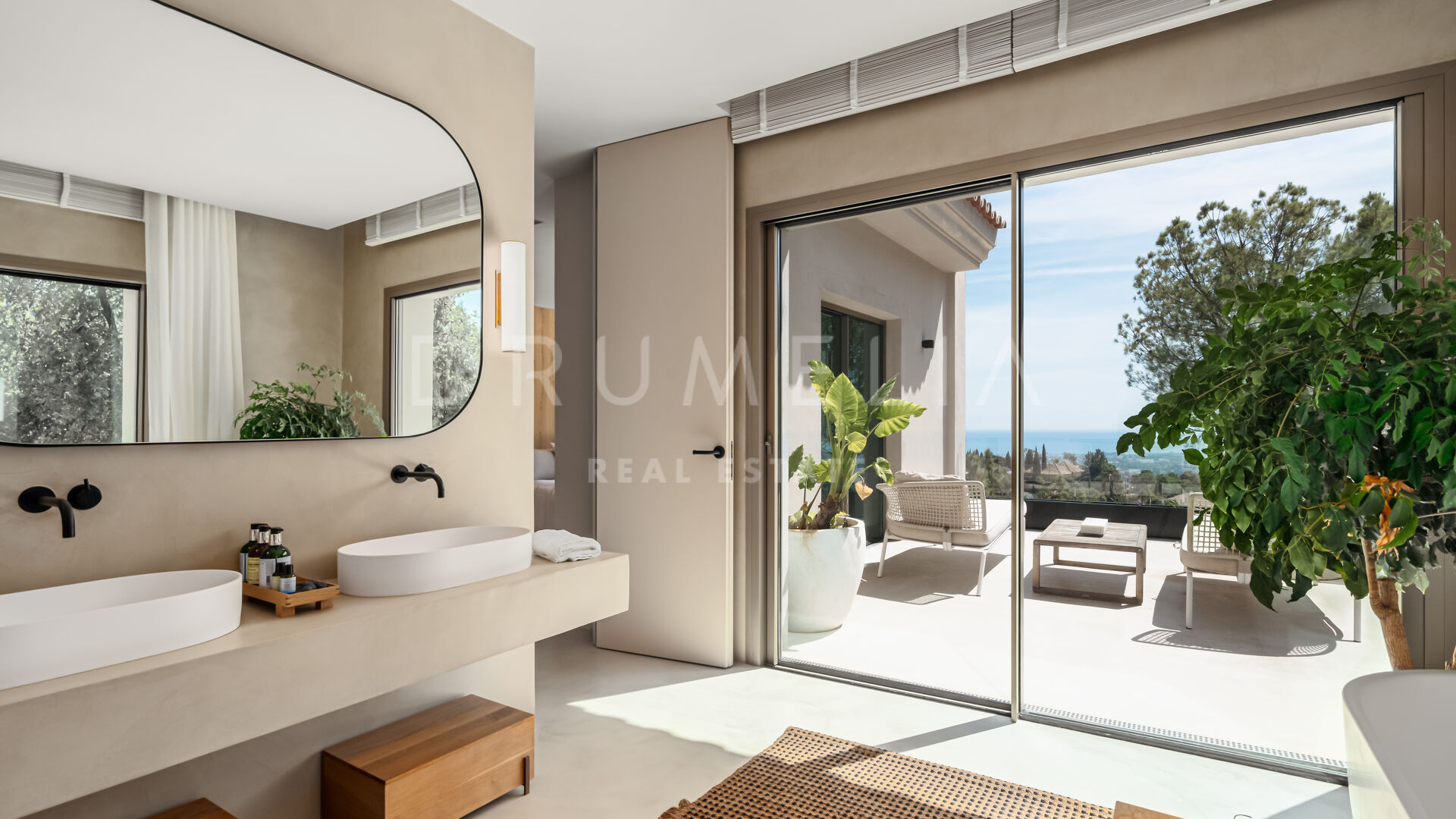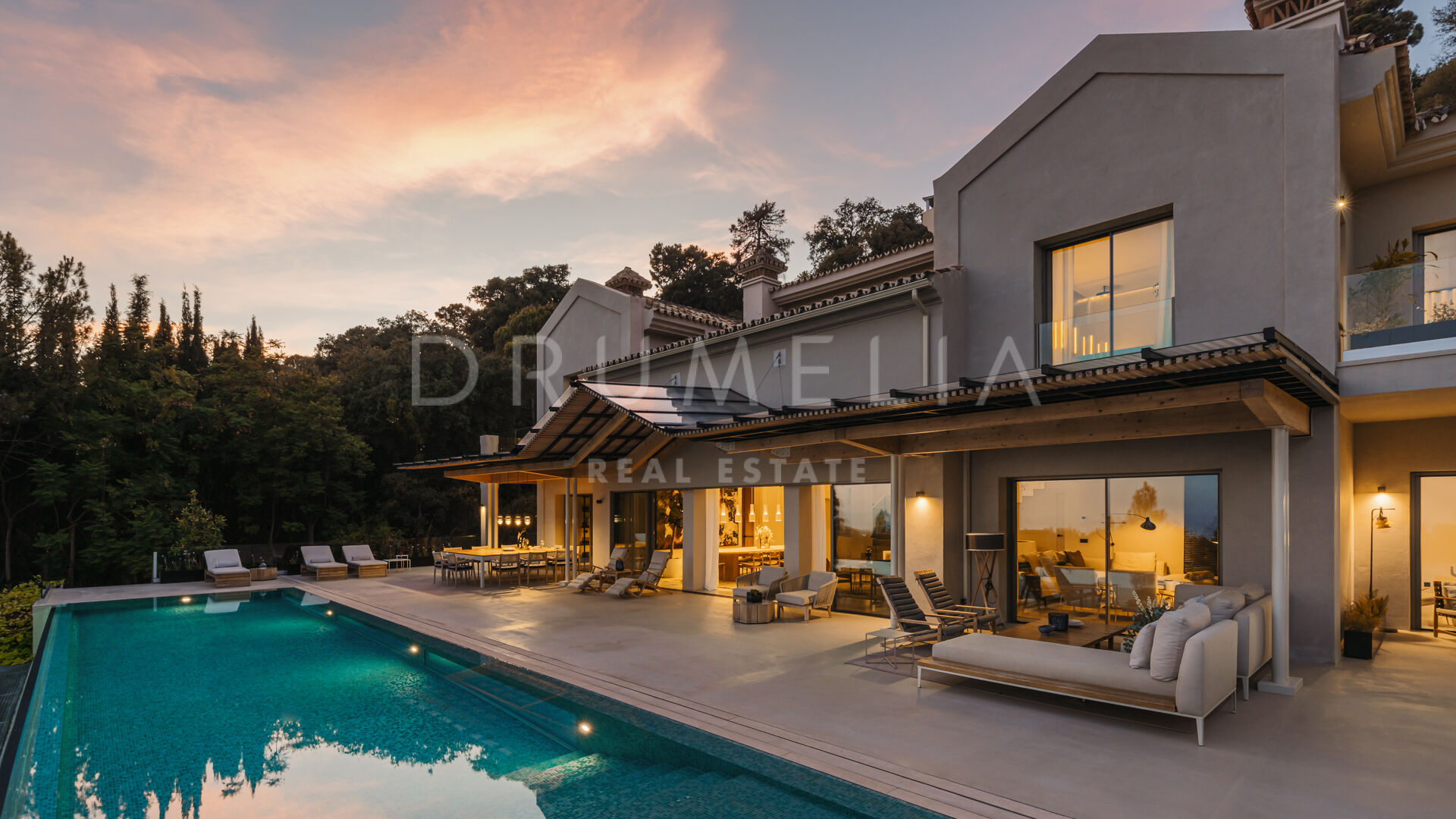 The detached residence of 862 m², spread over 3 levels, offers prestigious, custom-designed furniture. South-facing, it is situated on a large plot of 4.017 m² with magnificent landscaped gardens and 120 m² of terraces with impressive views of the coast and the mountains. It has been designed using innovative methods, traditional and modern high-quality materials, offering a smart design to ensure very comfortable living spaces and a truly exquisite lifestyle, blending Mediterranean feelings with a Scandinavian touch. You enter this magnificent villa through a long driveway leading to the main door framed by olive trees. The ground floor includes a superb entrance hall that leads to the elegant living area with a dining room and a stunning lounge with double-height vaulted ceilings. An Arrital fully equipped kitchen with Gaggenau appliances and indoor and outdoor dining areas. On the west and east wings, there are two en-suite bedrooms, both with terraces and sea views, plus a guest toilet complete this level. Large covered and uncovered terraces lead to an infinity pool (over 13 m long) which enjoys sea views. The flat subtropical garden is located just in front and around the property, featuring an automatic irrigation system and splendid views of the coast and the idyllic surroundings.