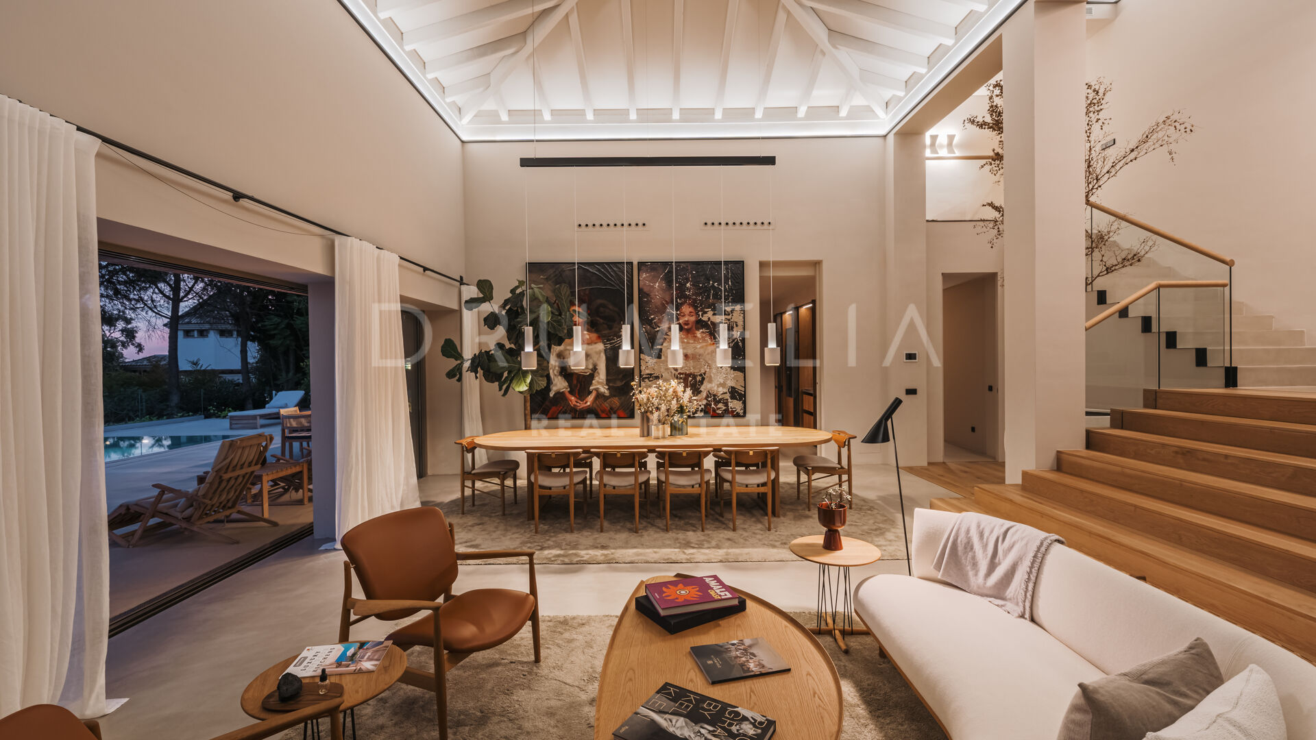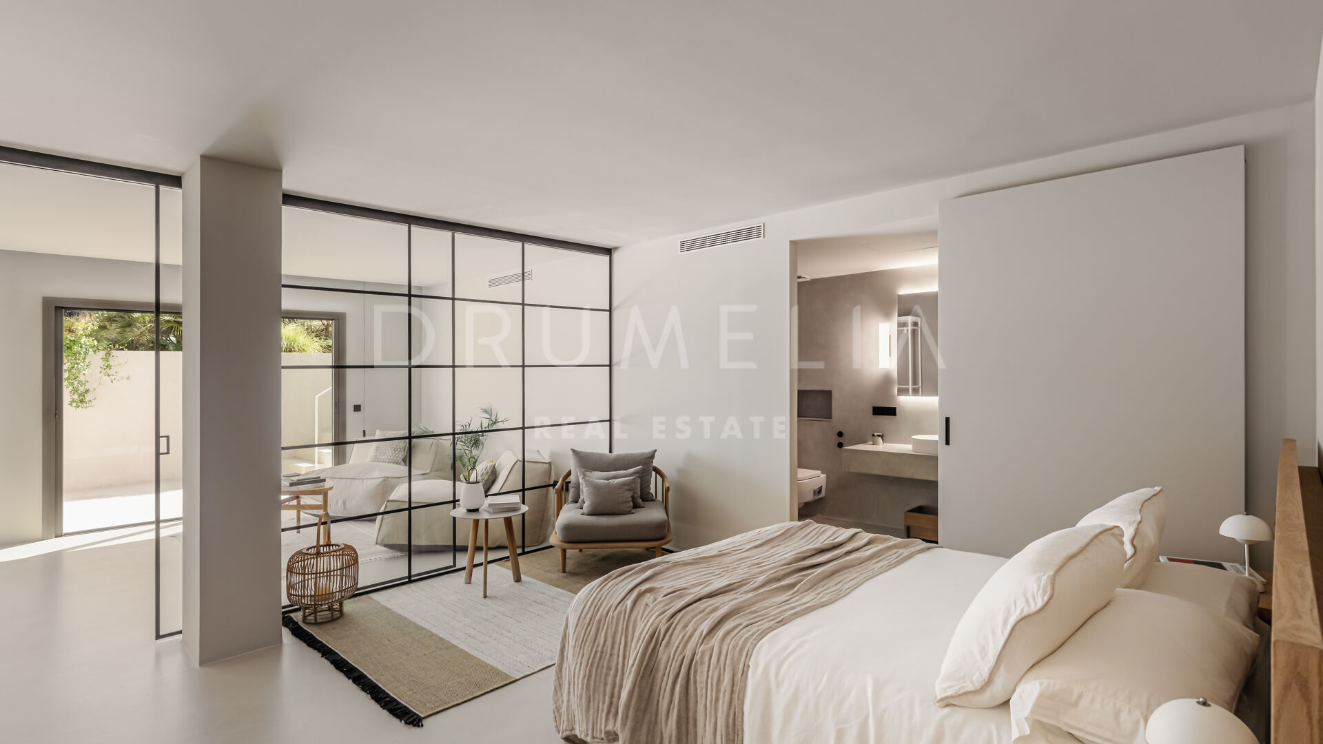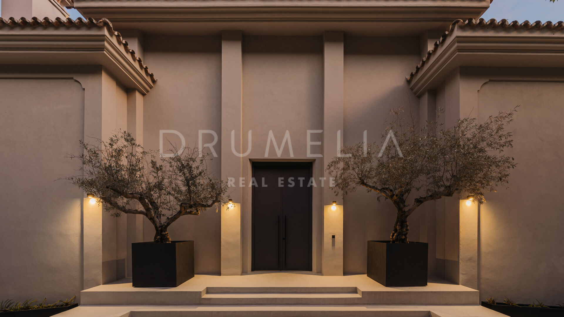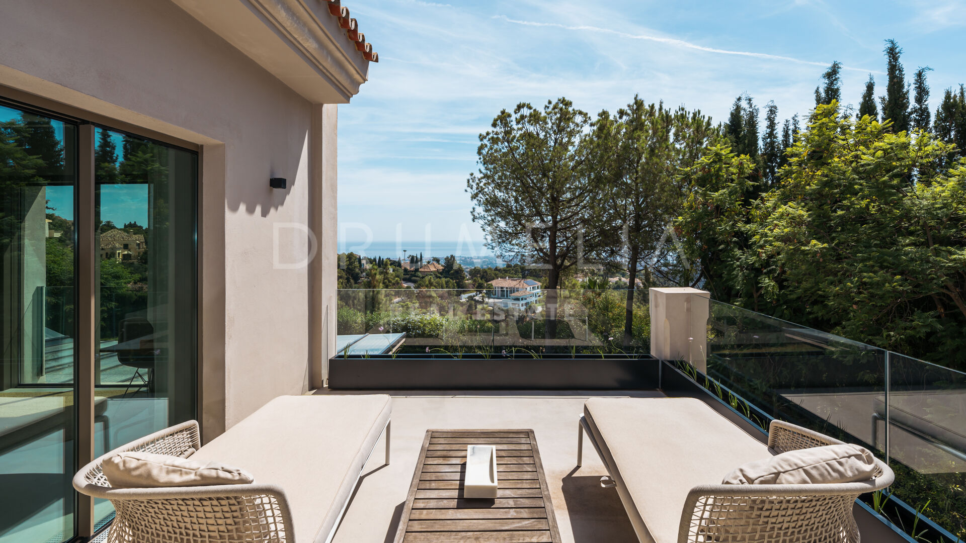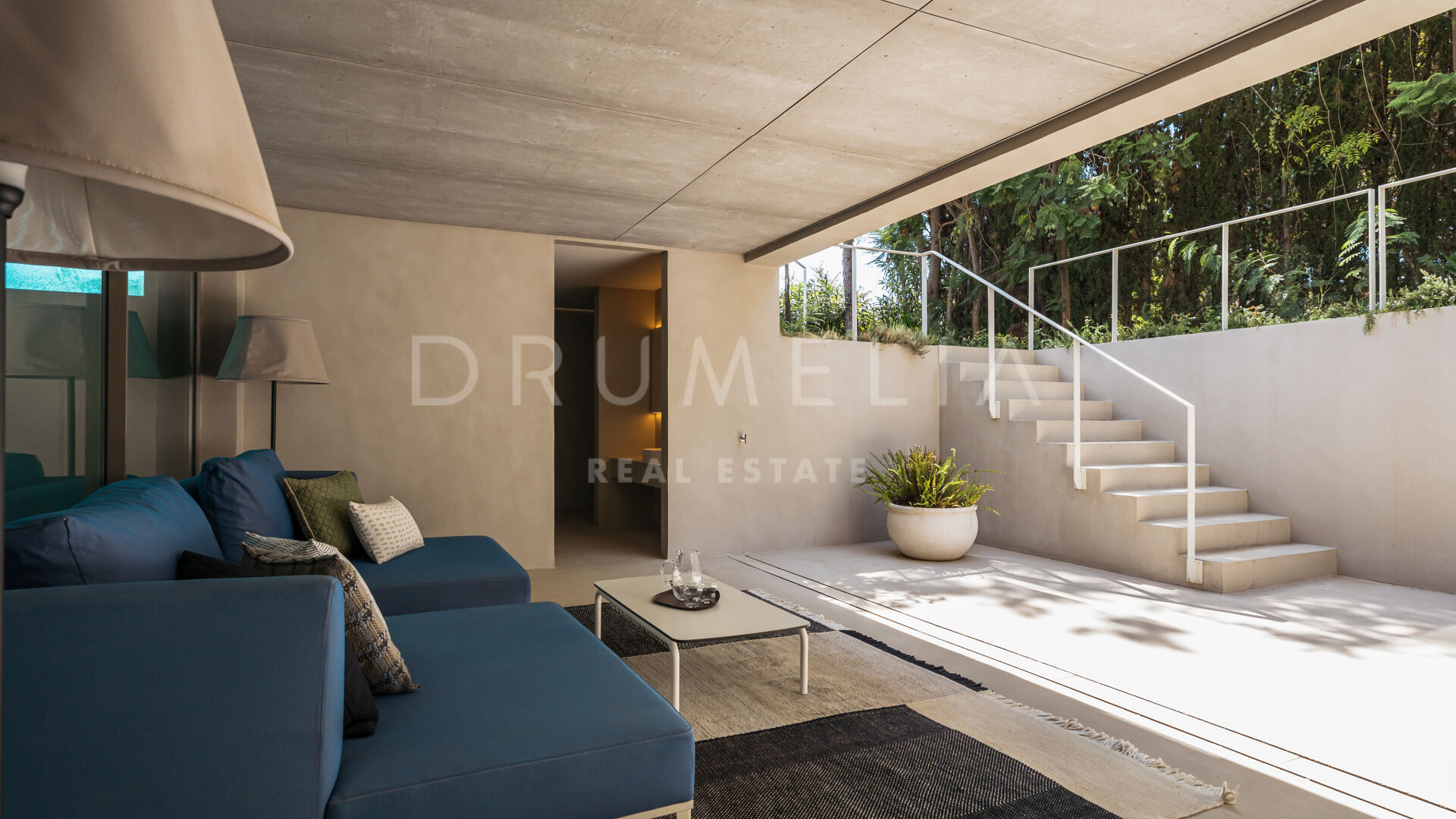 The detached residence of 862 m², spread over 3 levels, offers prestigious, custom-designed furniture. South-facing, it is situated on a large plot of 4.017 m² with magnificent landscaped gardens and 120 m² of terraces with impressive views of the coast and the mountains. It has been designed using innovative methods, traditional and modern high-quality materials, offering a smart design to ensure very comfortable living spaces and a truly exquisite lifestyle, blending Mediterranean feelings with a Scandinavian touch. You enter this magnificent villa through a long driveway leading to the main door framed by olive trees. The ground floor includes a superb entrance hall that leads to the elegant living area with a dining room and a stunning lounge with double-height vaulted ceilings. An Arrital fully equipped kitchen with Gaggenau appliances and indoor and outdoor dining areas. On the west and east wings, there are two en-suite bedrooms, both with terraces and sea views, plus a guest toilet complete this level. Large covered and uncovered terraces lead to an infinity pool (over 13 m long) which enjoys sea views. The flat subtropical garden is located just in front and around the property, featuring an automatic irrigation system and splendid views of the coast and the idyllic surroundings.