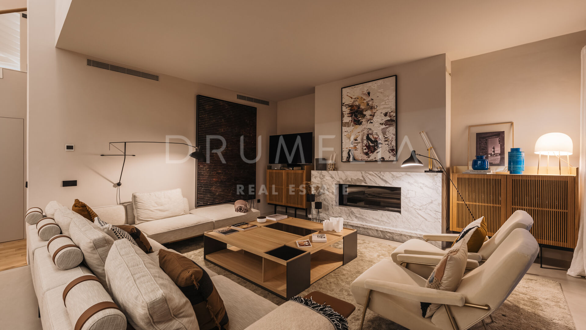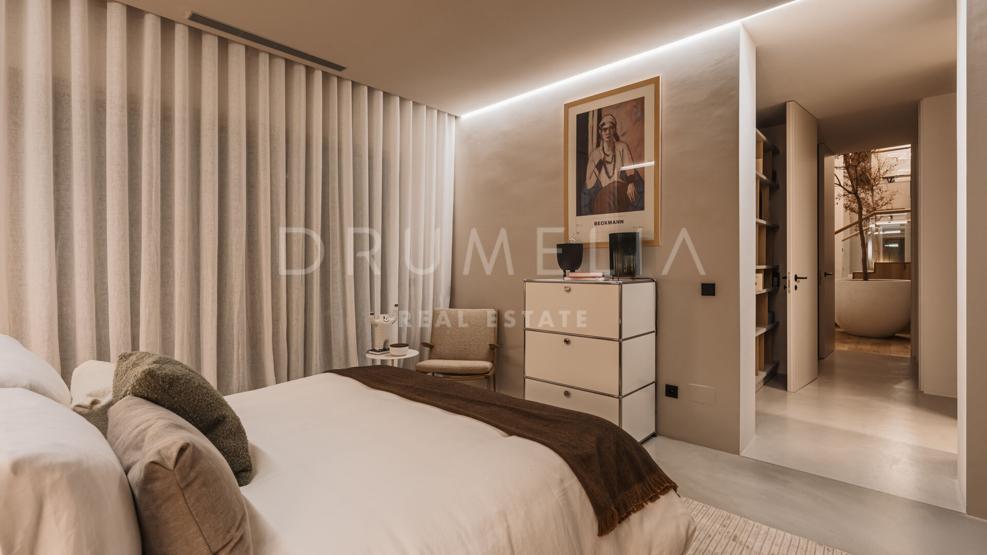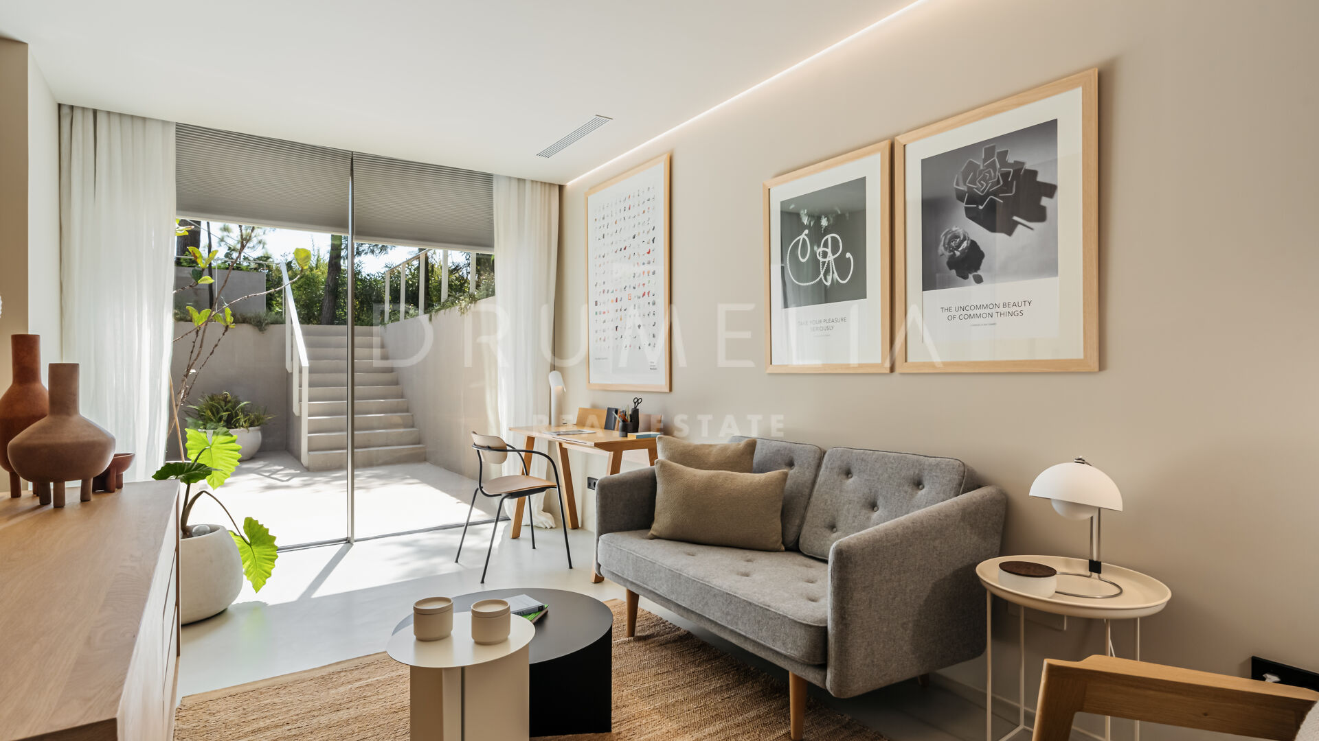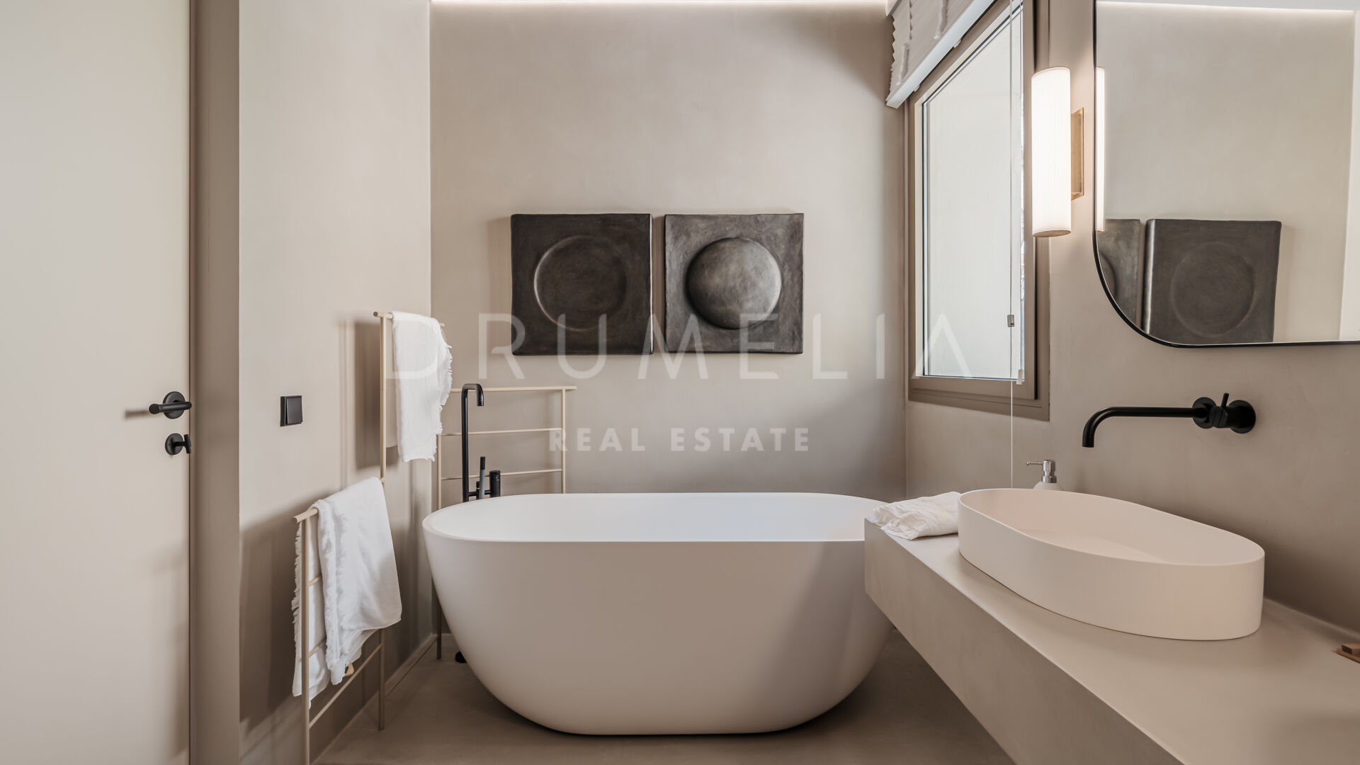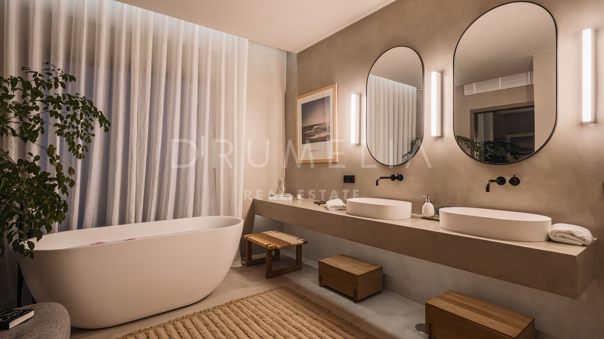 The detached residence of 862 m², spread over 3 levels, offers prestigious, custom-designed furniture. South-facing, it is situated on a large plot of 4.017 m² with magnificent landscaped gardens and 120 m² of terraces with impressive views of the coast and the mountains. It has been designed using innovative methods, traditional and modern high-quality materials, offering a smart design to ensure very comfortable living spaces and a truly exquisite lifestyle, blending Mediterranean feelings with a Scandinavian touch. You enter this magnificent villa through a long driveway leading to the main door framed by olive trees. The ground floor includes a superb entrance hall that leads to the elegant living area with a dining room and a stunning lounge with double-height vaulted ceilings. An Arrital fully equipped kitchen with Gaggenau appliances and indoor and outdoor dining areas. On the west and east wings, there are two en-suite bedrooms, both with terraces and sea views, plus a guest toilet complete this level. Large covered and uncovered terraces lead to an infinity pool (over 13 m long) which enjoys sea views. The flat subtropical garden is located just in front and around the property, featuring an automatic irrigation system and splendid views of the coast and the idyllic surroundings.