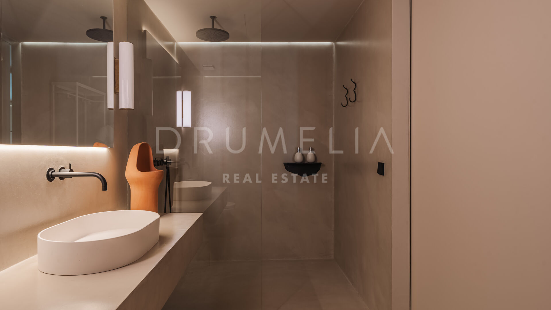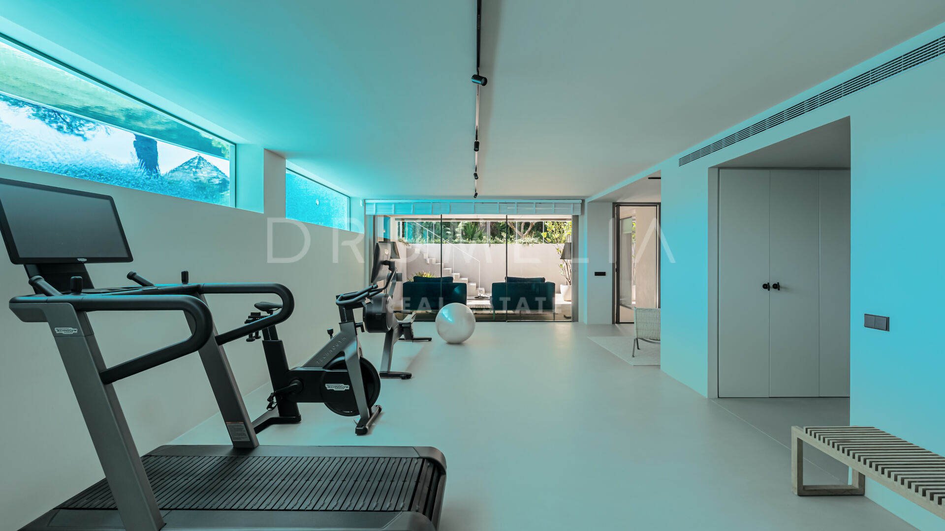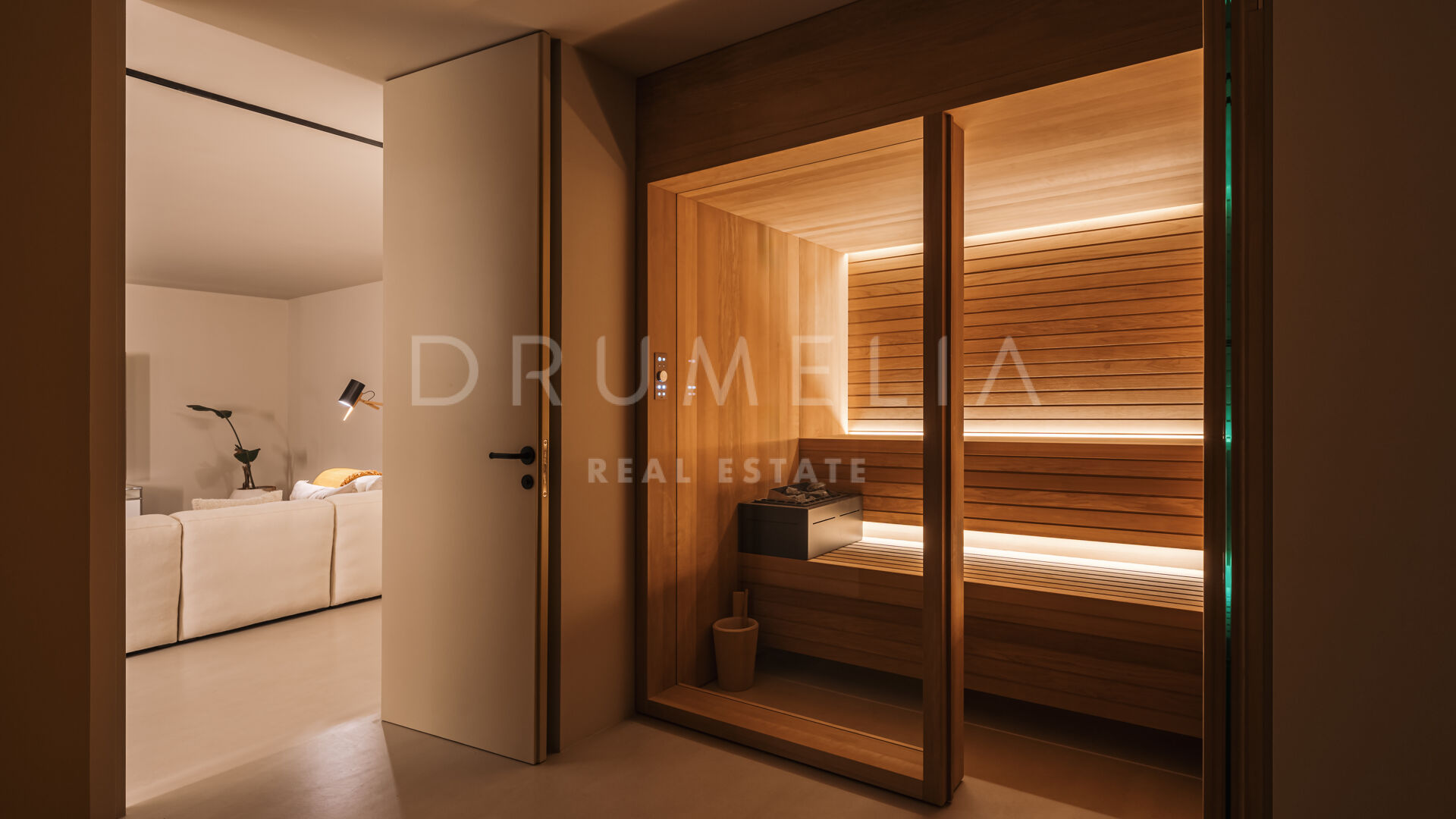 On the first floor, you will find two en-suite bedrooms. In the west wing, the master suite features a south-facing terrace with panoramic sea views, a well-designed walk-in closet, and a beautiful bright bathroom with a freestanding bathtub. The other guest bedroom is located in the east wing of the house and also features a south-facing terrace with sea views. The spacious 458 m² basement houses another bedroom with a large bathroom, a guest apartment with a kitchenette, open patios that bring in natural light, and terraces with direct access to the garden and pool area. In addition, there is an SPA with a sauna and a massage room, as well as a living space with natural light coming through the pool windows, creating a unique atmosphere with the gym connected to the entertainment area including a reading corner and a cozy lounge. A garage for two cars is also located on this level. Additional parking spaces are found next to the kitchen and at the entrance of the indoor garage.