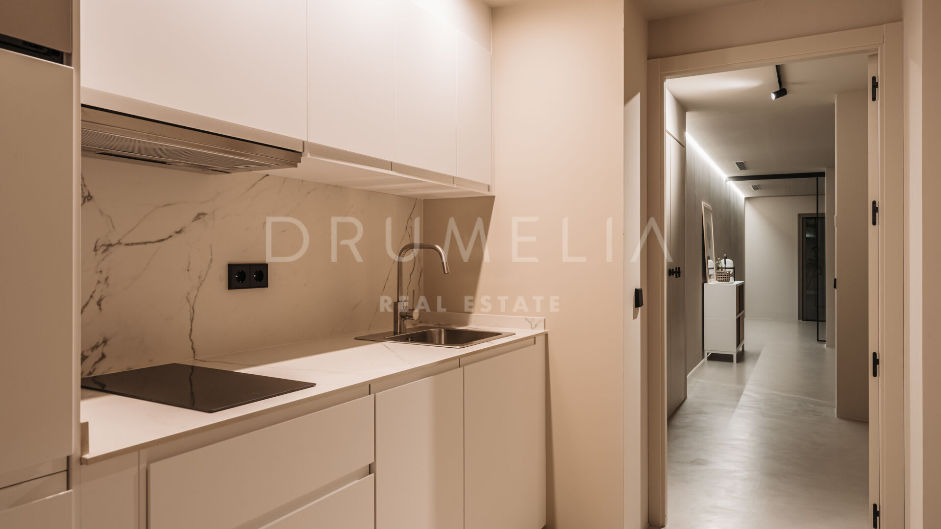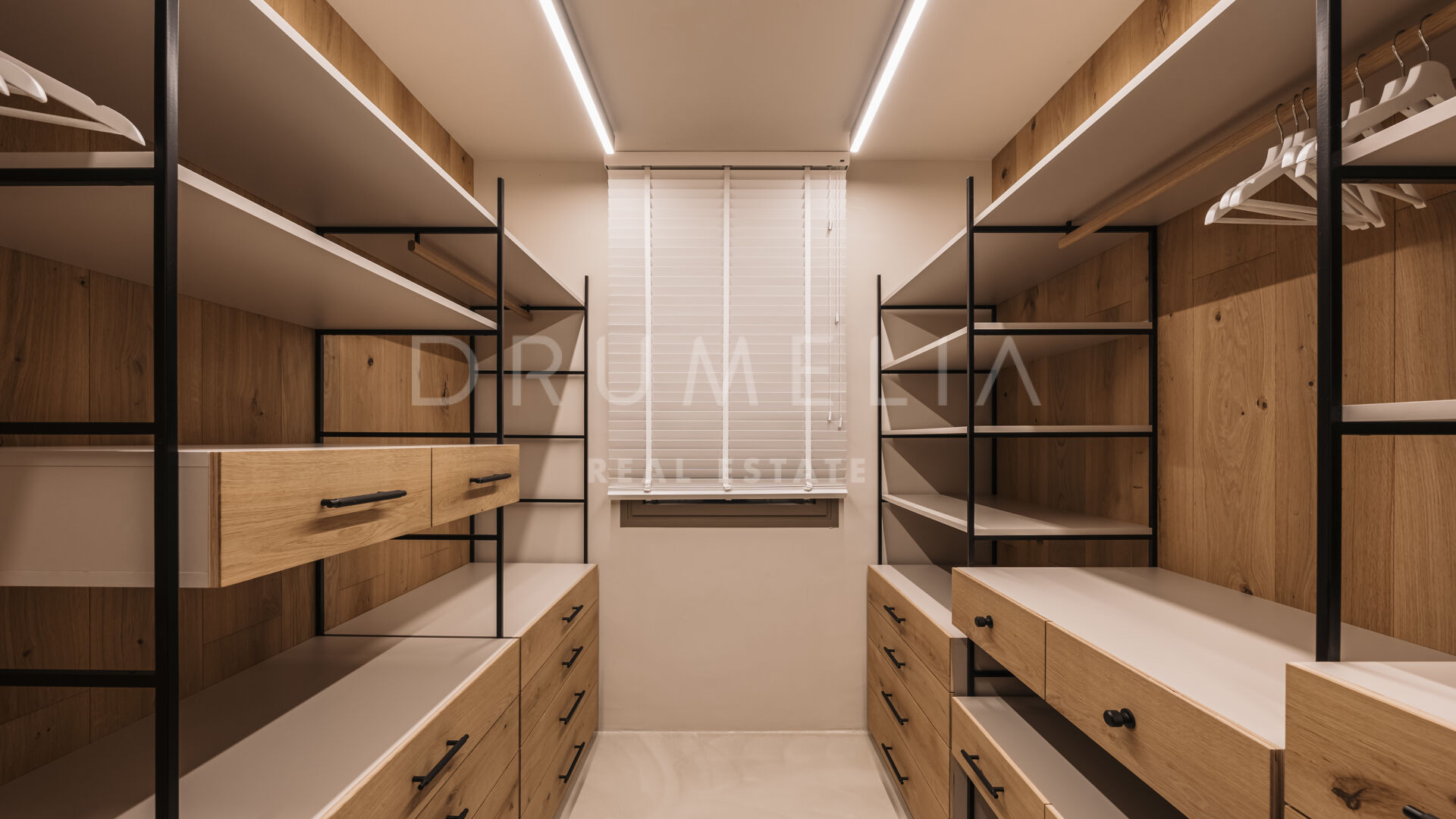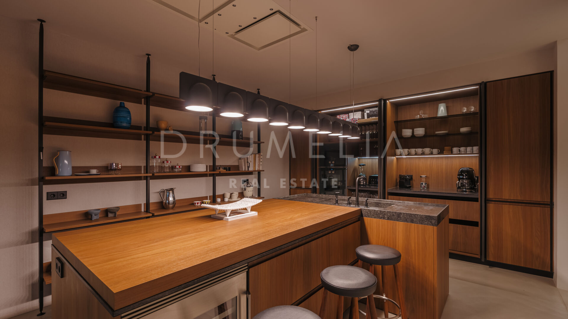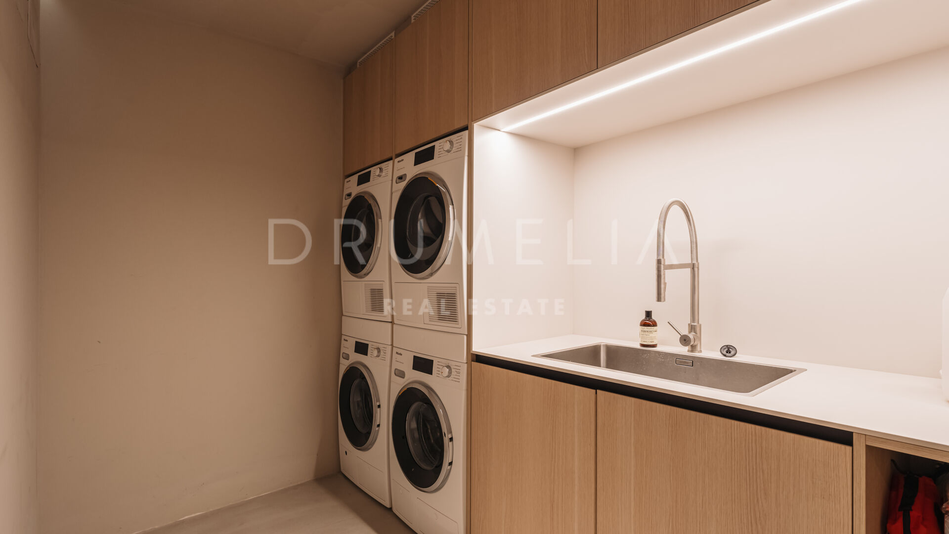 On the first floor, you will find two en-suite bedrooms. In the west wing, the master suite features a south-facing terrace with panoramic sea views, a well-designed walk-in closet, and a beautiful bright bathroom with a freestanding bathtub. The other guest bedroom is located in the east wing of the house and also features a south-facing terrace with sea views. The spacious 458 m² basement houses another bedroom with a large bathroom, a guest apartment with a kitchenette, open patios that bring in natural light, and terraces with direct access to the garden and pool area. In addition, there is an SPA with a sauna and a massage room, as well as a living space with natural light coming through the pool windows, creating a unique atmosphere with the gym connected to the entertainment area including a reading corner and a cozy lounge. A garage for two cars is also located on this level. Additional parking spaces are found next to the kitchen and at the entrance of the indoor garage.