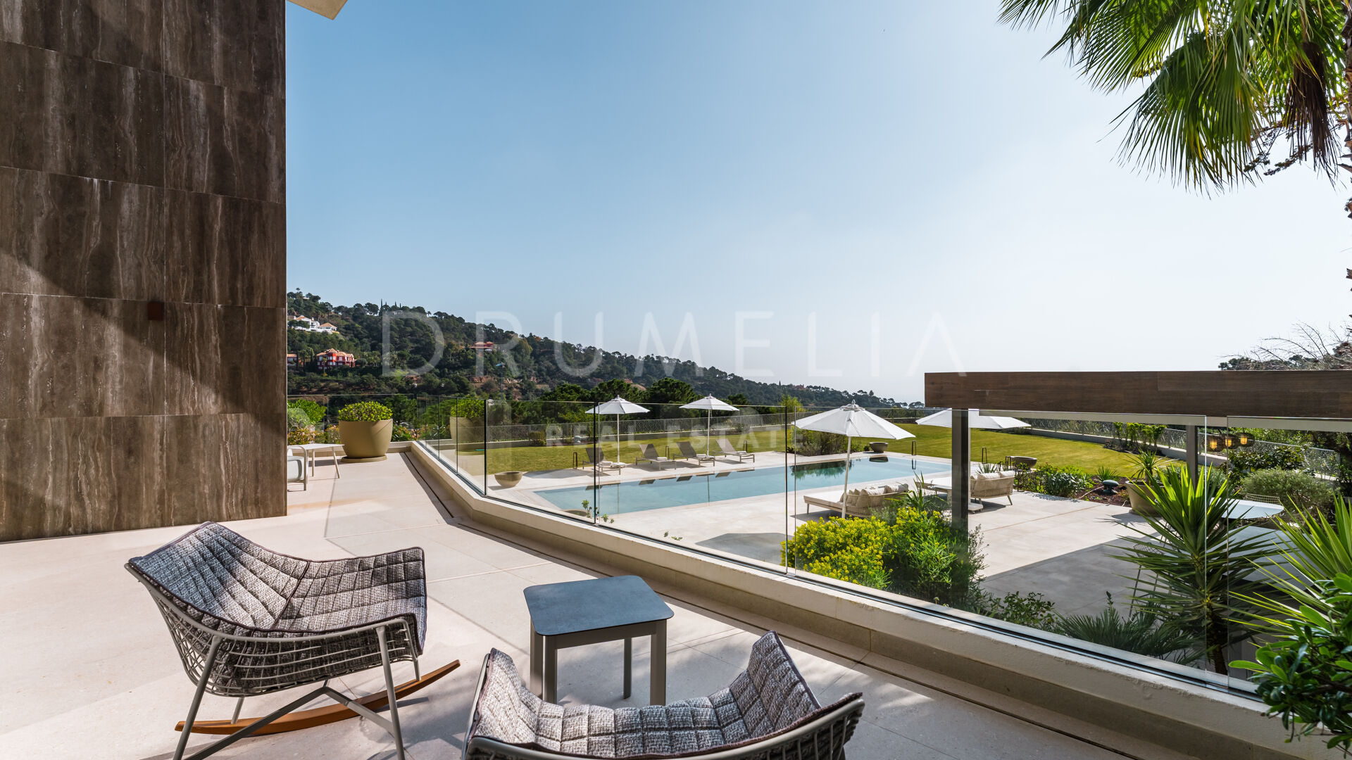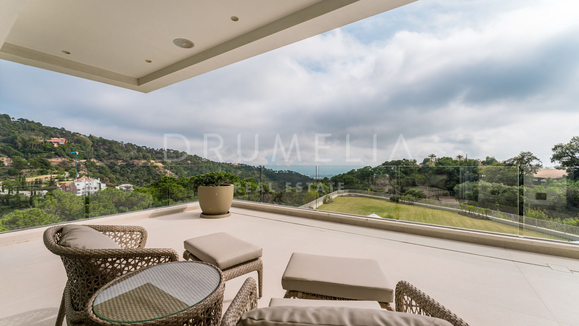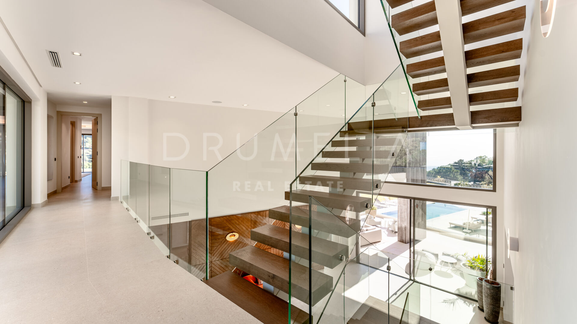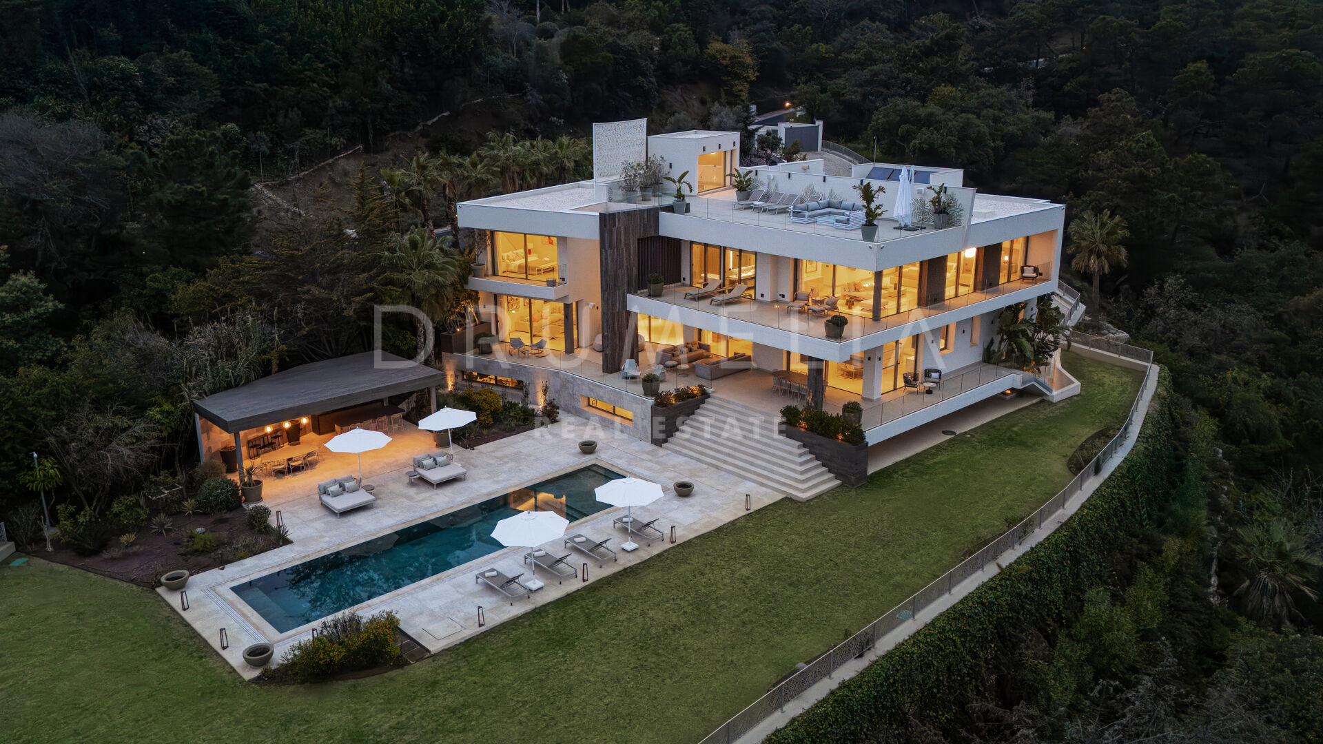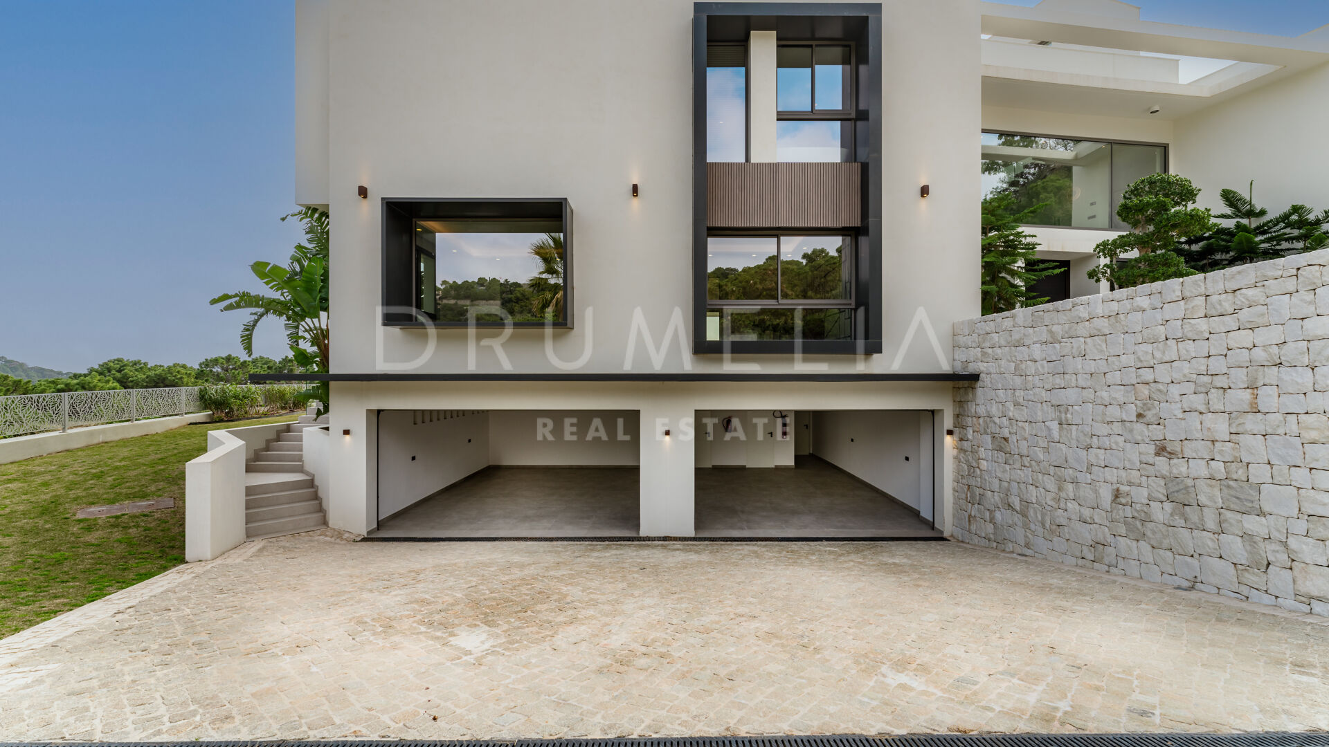 This contemporary villa for sale in La Zagaleta, Benahavís, is located on a large flat plot of 5,394 m² and offers a high standard of living with panoramic sea, valley, and mountain views from every level. Built across three floors and with a total constructed area of 958 m², the property combines modern architecture with practical layout and quality finishes throughout.
