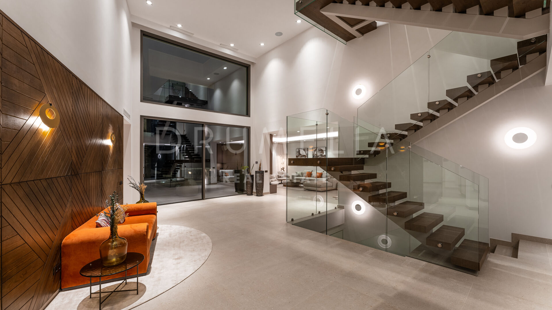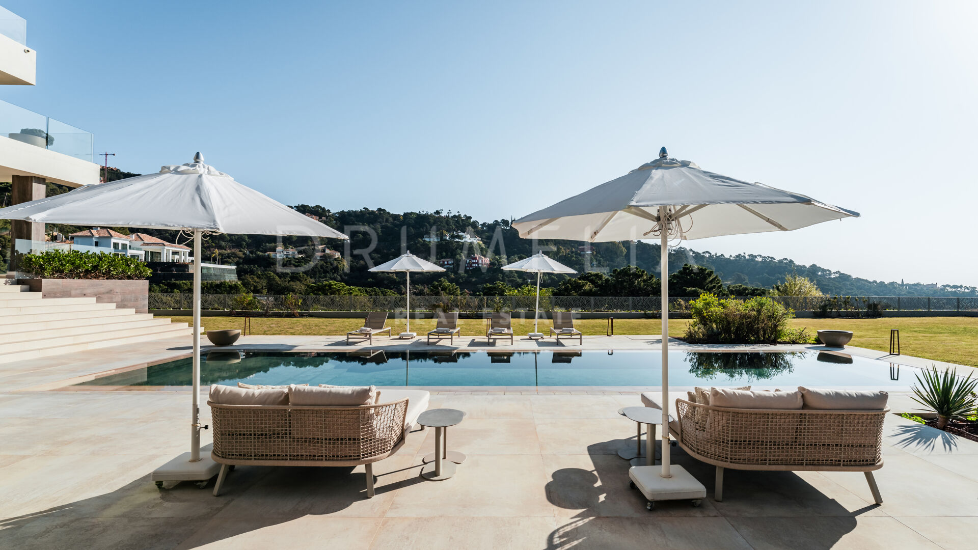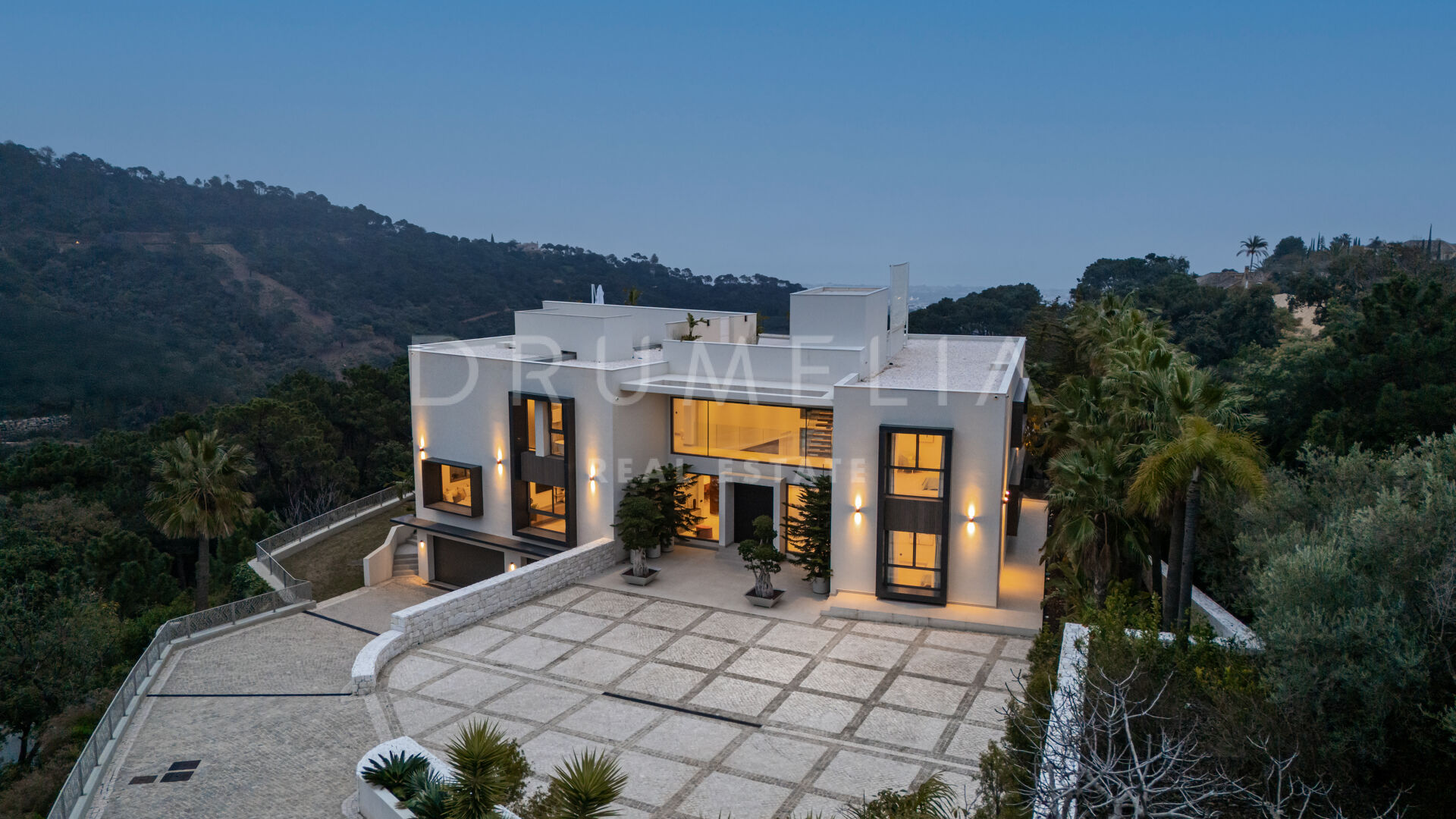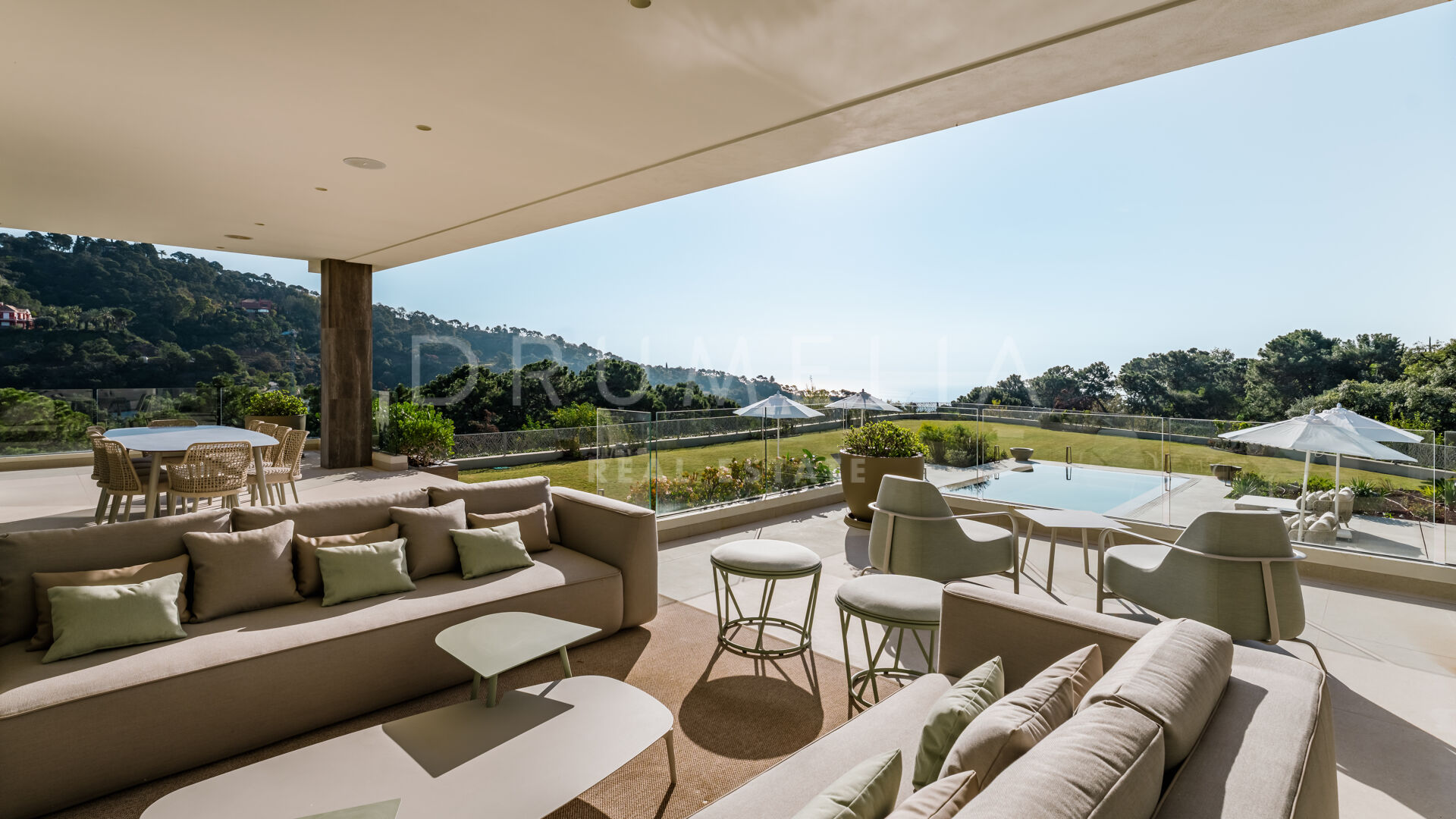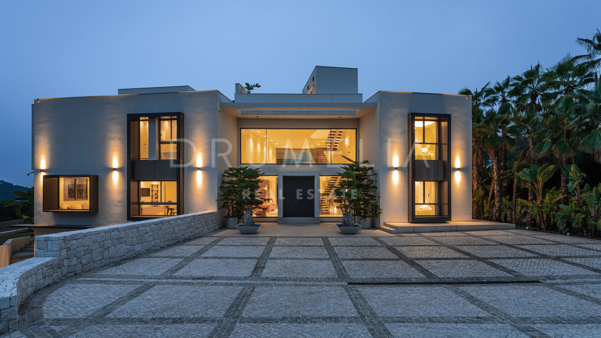 This contemporary villa for sale in La Zagaleta, Benahavís, is located on a large flat plot of 5,394 m² and offers a high standard of living with panoramic sea, valley, and mountain views from every level. Built across three floors and with a total constructed area of 958 m², the property combines modern architecture with practical layout and quality finishes throughout.