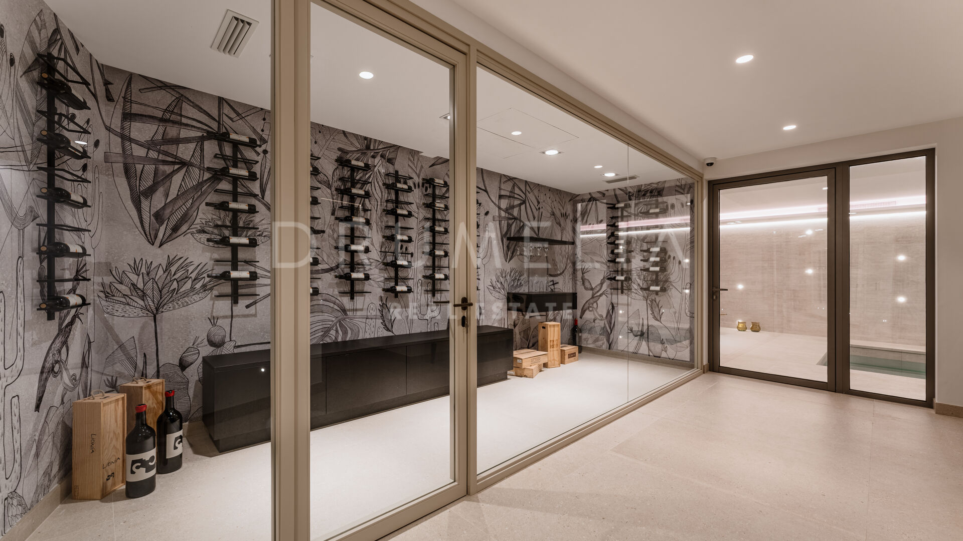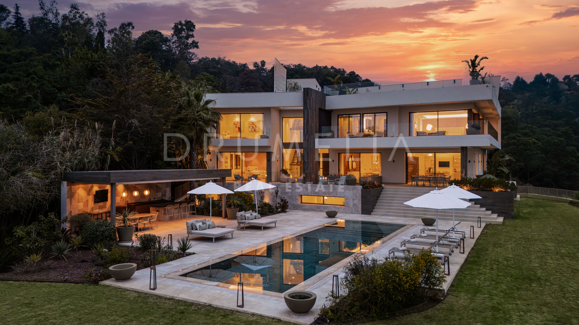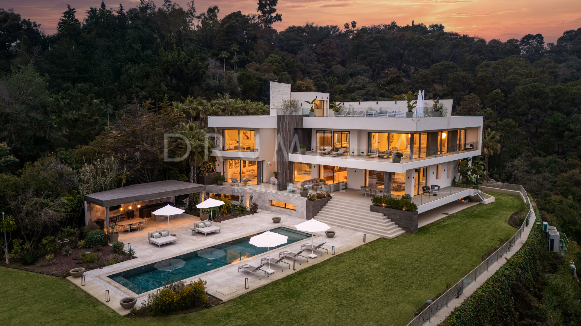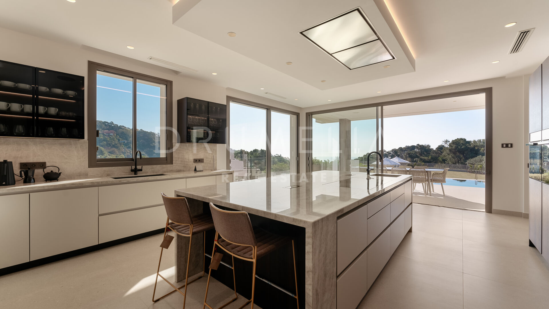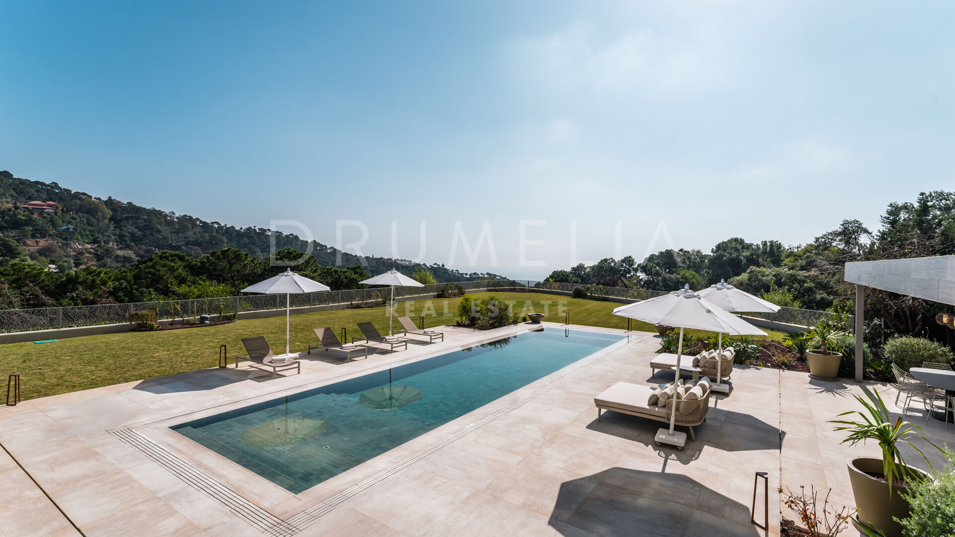 This contemporary villa for sale in La Zagaleta, Benahavís, is located on a large flat plot of 5,394 m² and offers a high standard of living with panoramic sea, valley, and mountain views from every level. Built across three floors and with a total constructed area of 958 m², the property combines modern architecture with practical layout and quality finishes throughout.