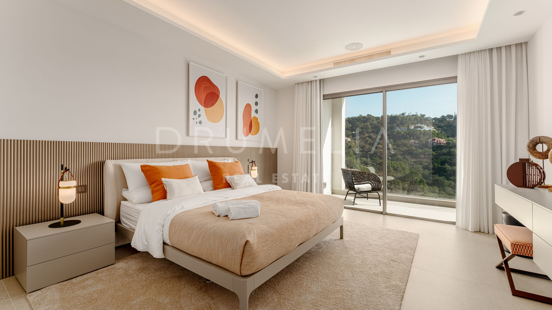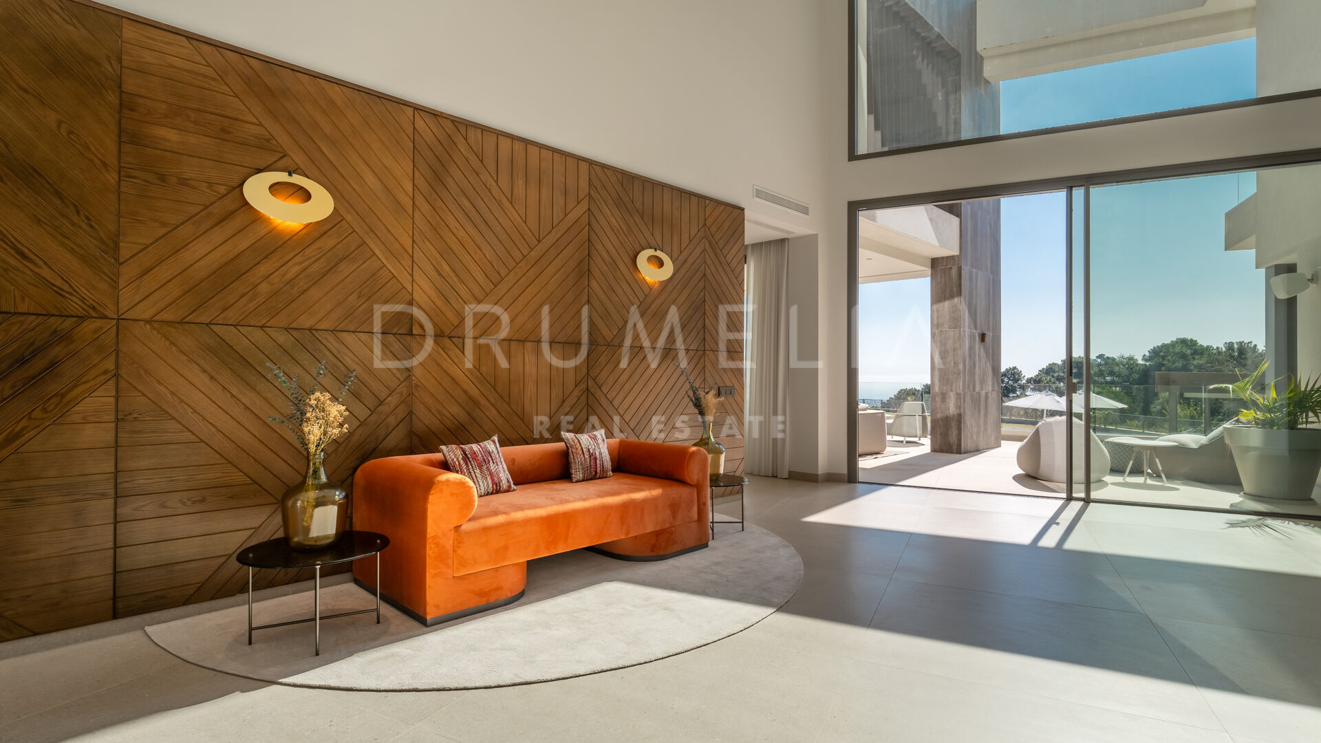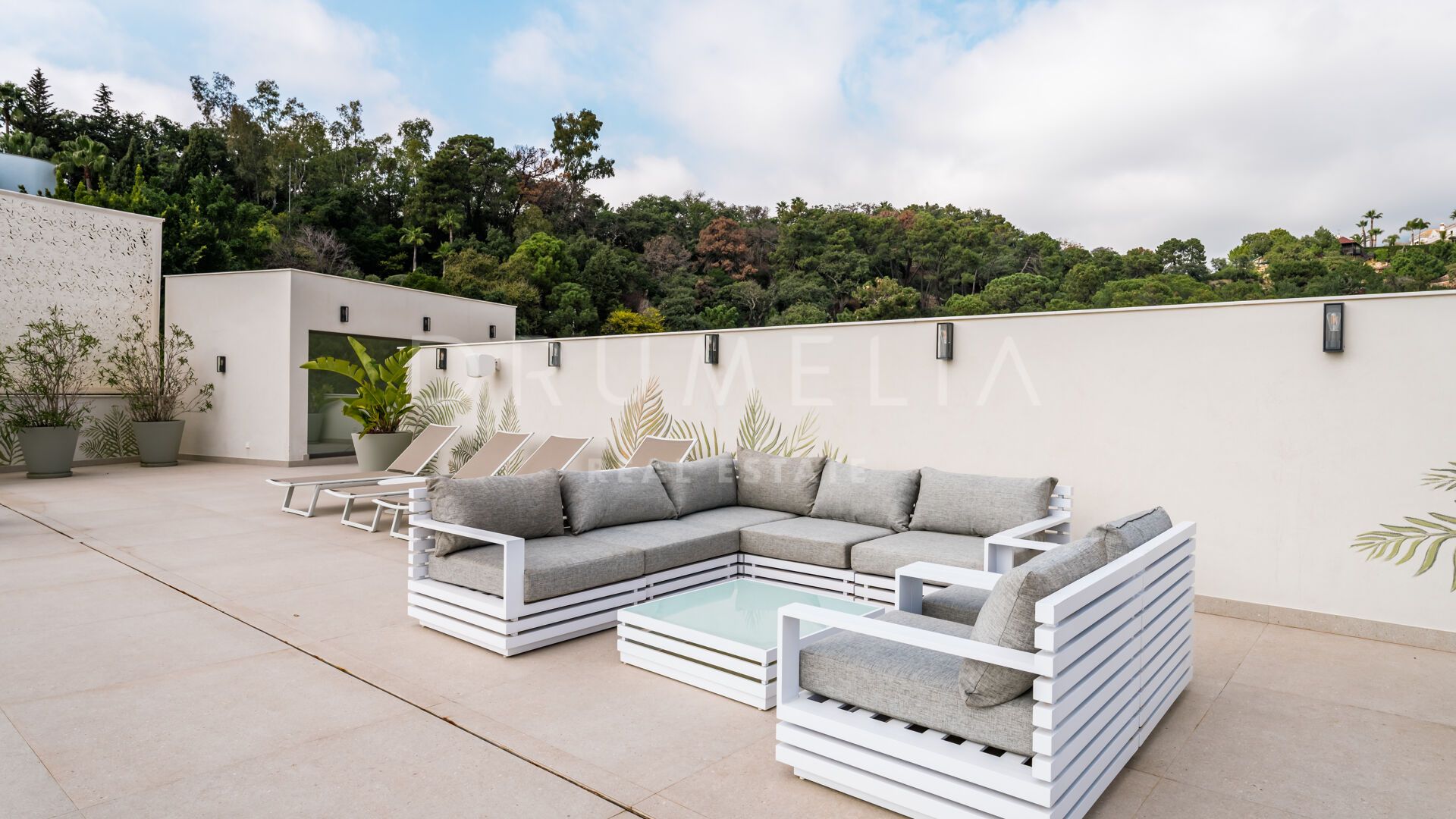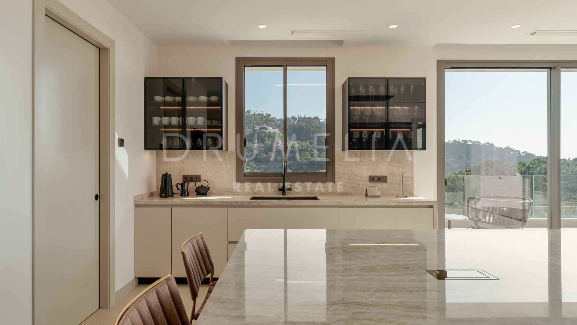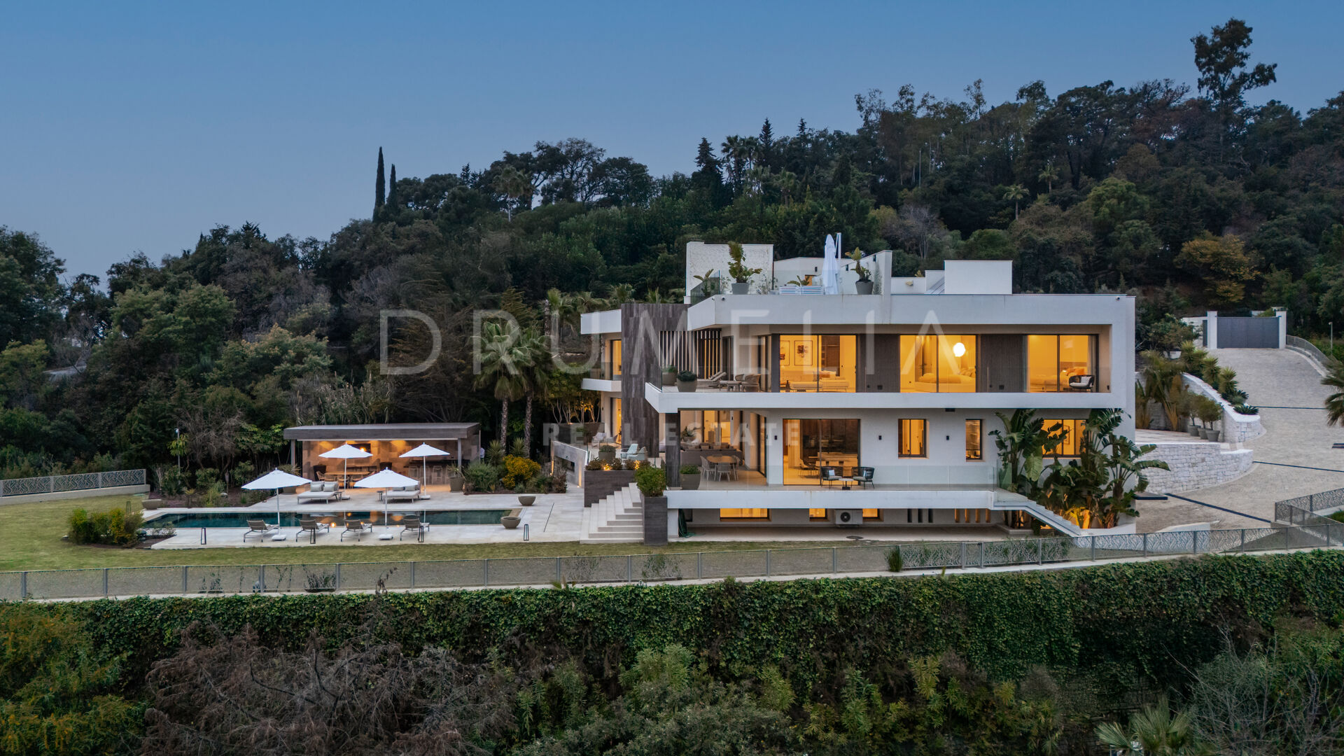 This contemporary villa for sale in La Zagaleta, Benahavís, is located on a large flat plot of 5,394 m² and offers a high standard of living with panoramic sea, valley, and mountain views from every level. Built across three floors and with a total constructed area of 958 m², the property combines modern architecture with practical layout and quality finishes throughout.