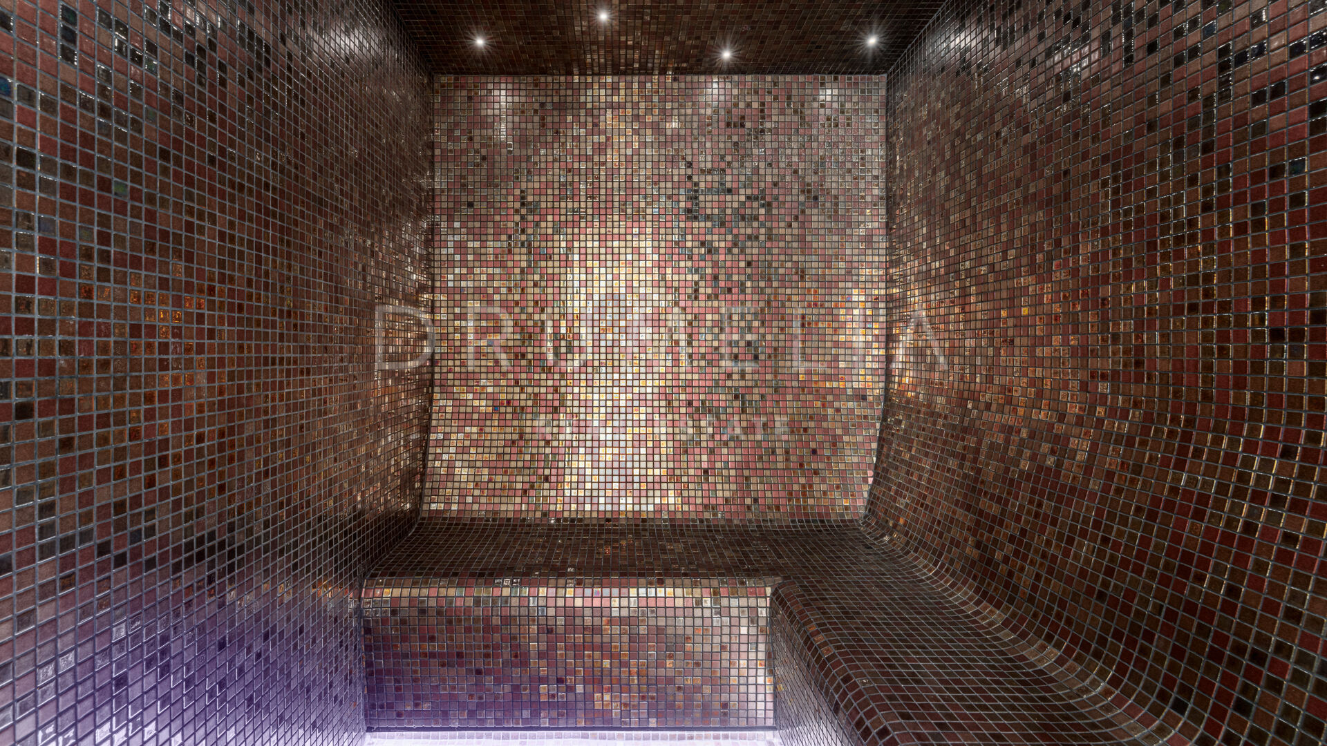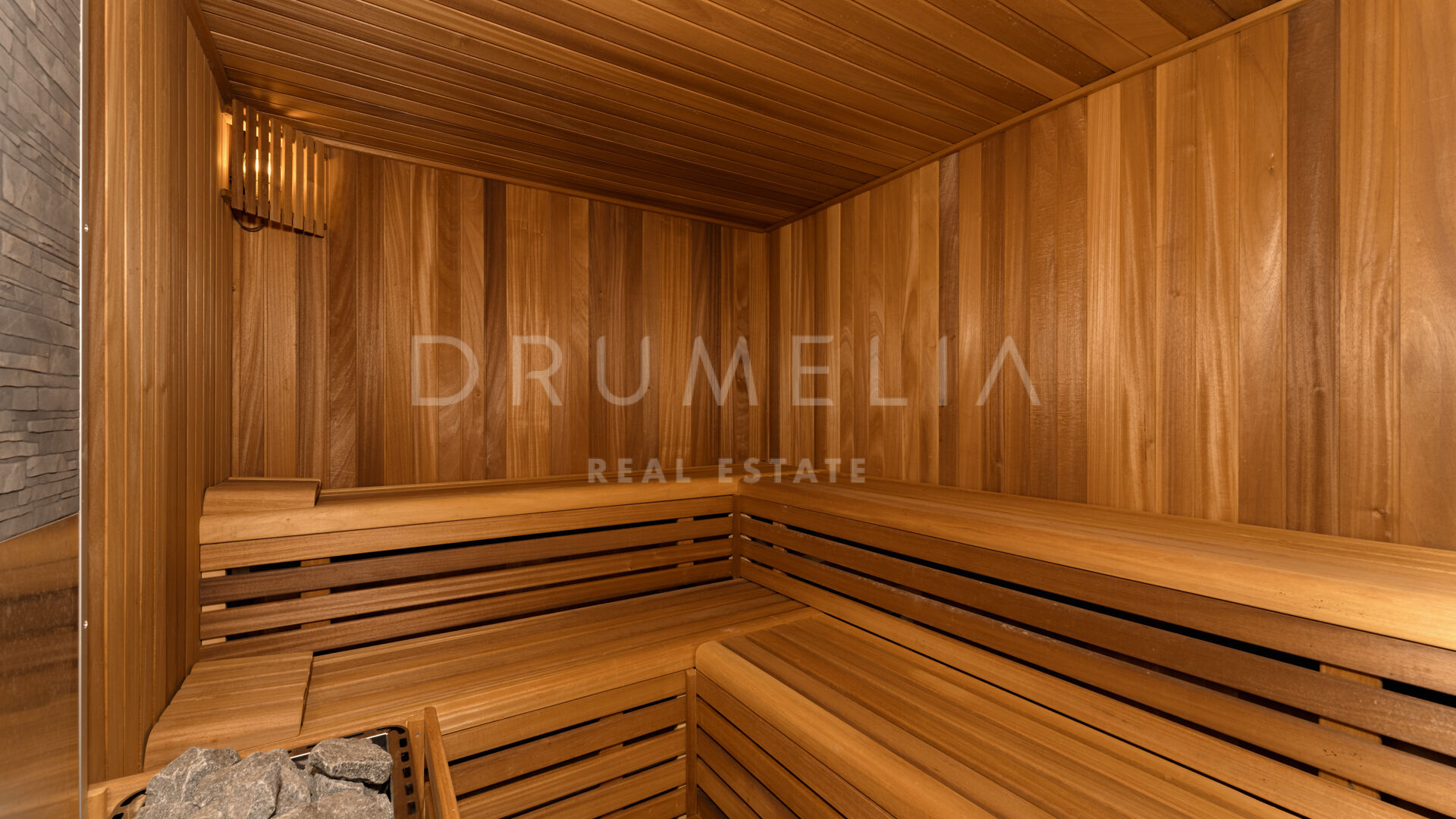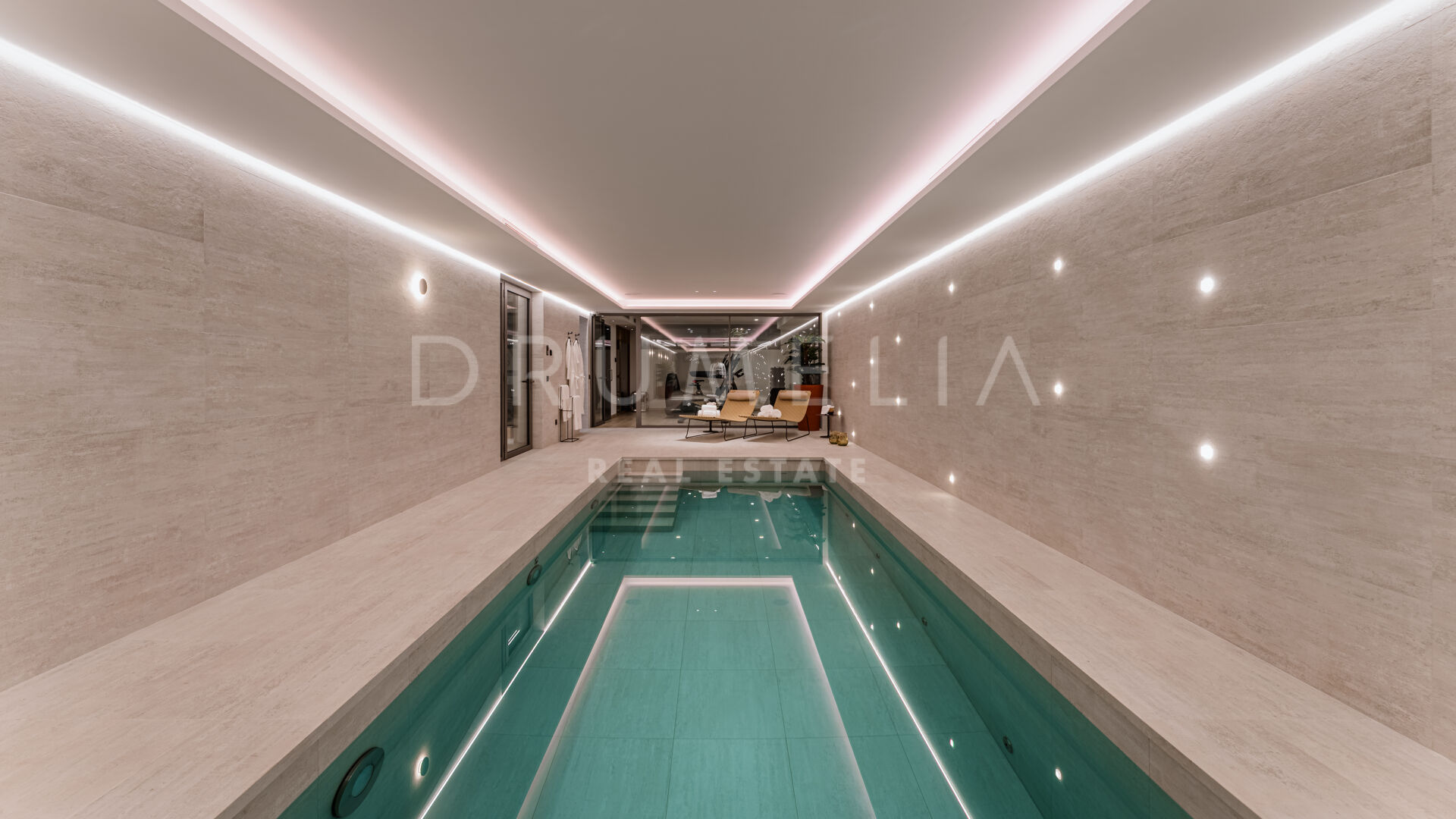 The lower floor offers a fully equipped spa and fitness area, including a heated indoor pool, sauna, steam room, gym, and changing facilities. This level also includes a large entertainment space with lounge, bar, and pool table, as well as a climate-controlled wine cellar. A staff/guest apartment with its own kitchen and bathroom is also located on this floor.