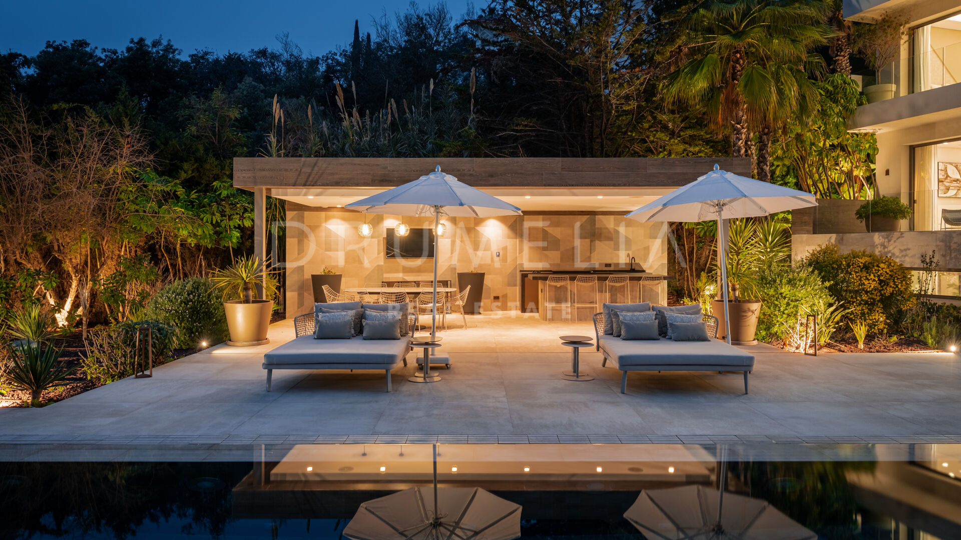 Large floor-to-ceiling windows open onto an expansive terrace and outdoor entertaining area, which features a fully fitted summer kitchen, al fresco dining space with BBQ, and a swimming pool surrounded by landscaped gardens and lawn.