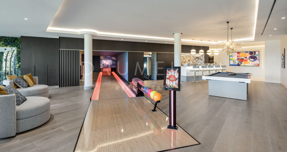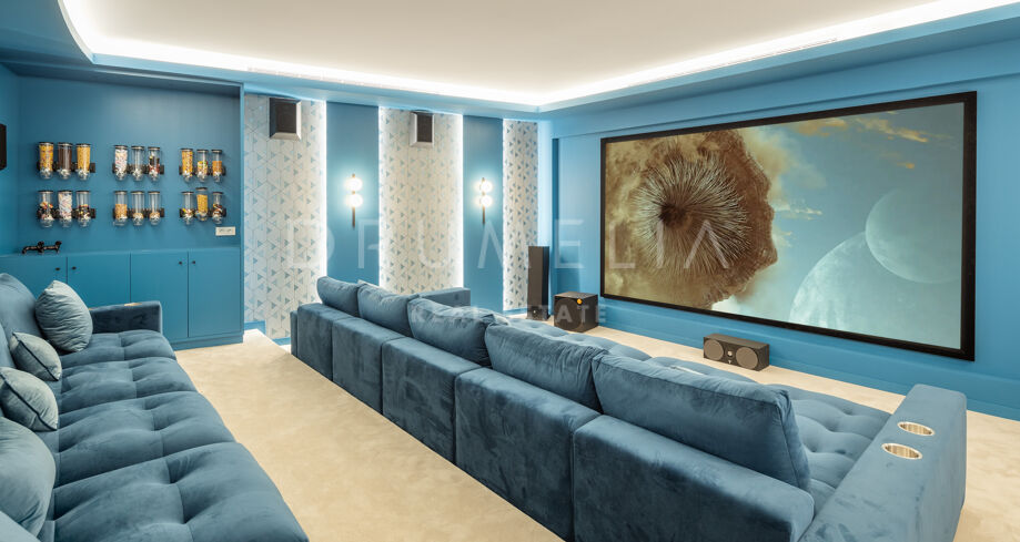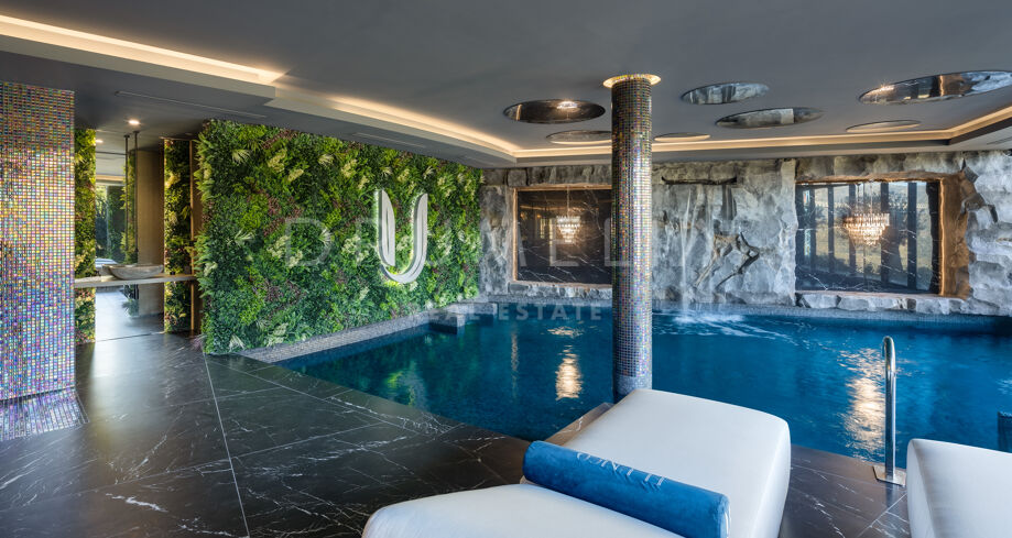 Designed for seamless entertainment, the villa includes a cinema, bowling alley, games room, and children’s lounge with an outdoor cinema. A luxurious spa features a heated indoor pool, waterfall, Jacuzzi, steam room, and sauna, while a fully equipped gym completes the wellness experience.