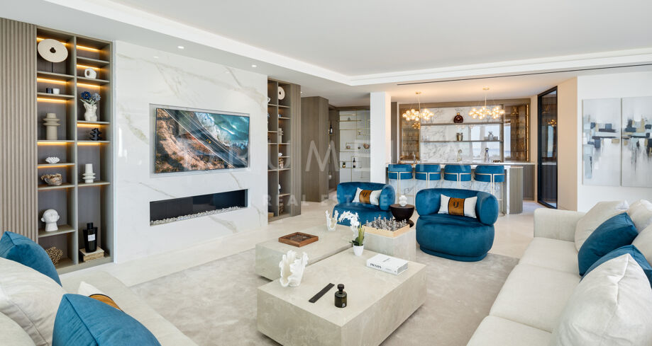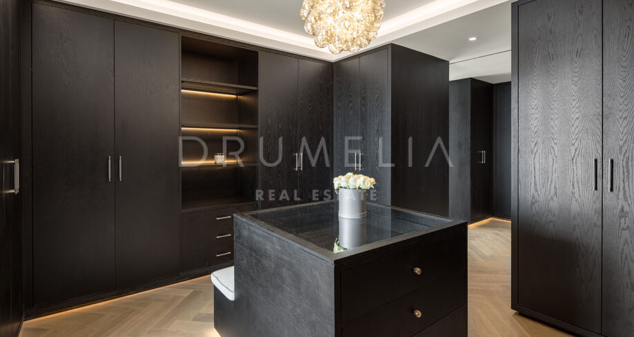A double-height entrance with 7-metre windows and a statement fireplace leads into spacious living areas. The gourmet kitchen features two oversized islands, Gaggenau appliances, and a staff kitchen, connecting to a 16-seat dining area. The villa has 9 bedrooms and 13 bathrooms, including a spectacular 180 m² master suite with a walk-in closet, designer bathroom, private terrace, fireplace, and café station. Among the guest suites, three have private exterior access, and in addition to the nine bedrooms, we can find a separate two-bedroom staff quarters with its own kitchen that provides extra functionality.