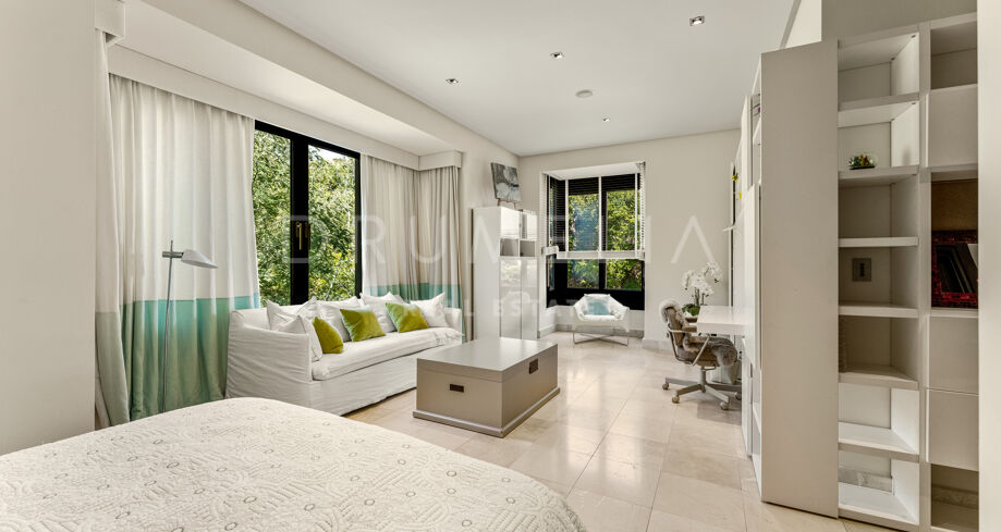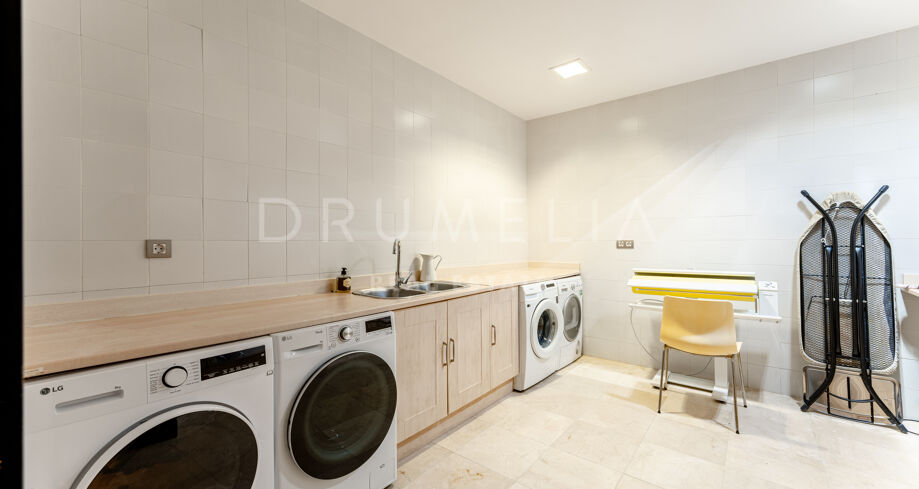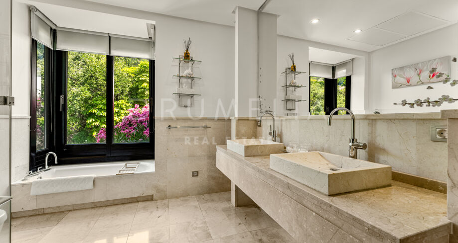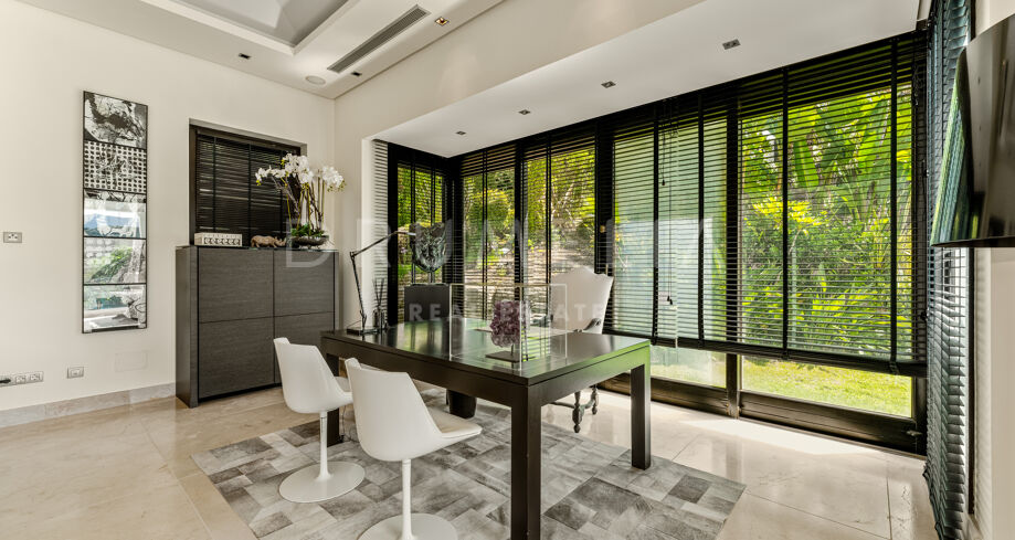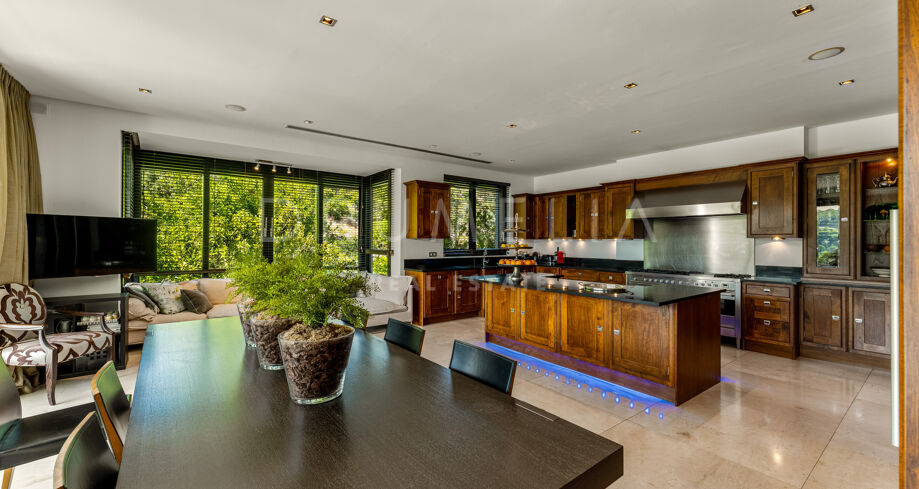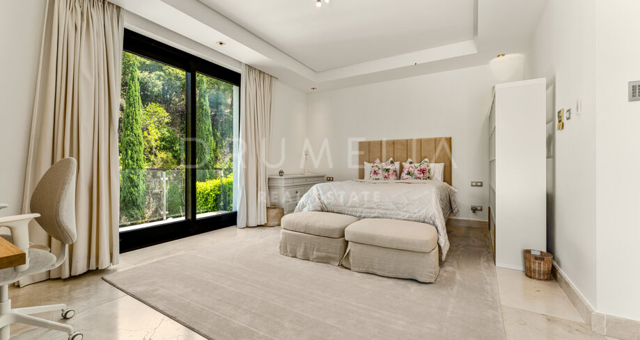 This private villa in La Zagaleta ensures total seclusion, with no possibility of being overlooked. It comes fully furnished and presented in excellent condition, equipped with underfloor heating, air conditioning, panoramic glass doors, double glazing, fitted wardrobes, video entry system, and elegant water features.
