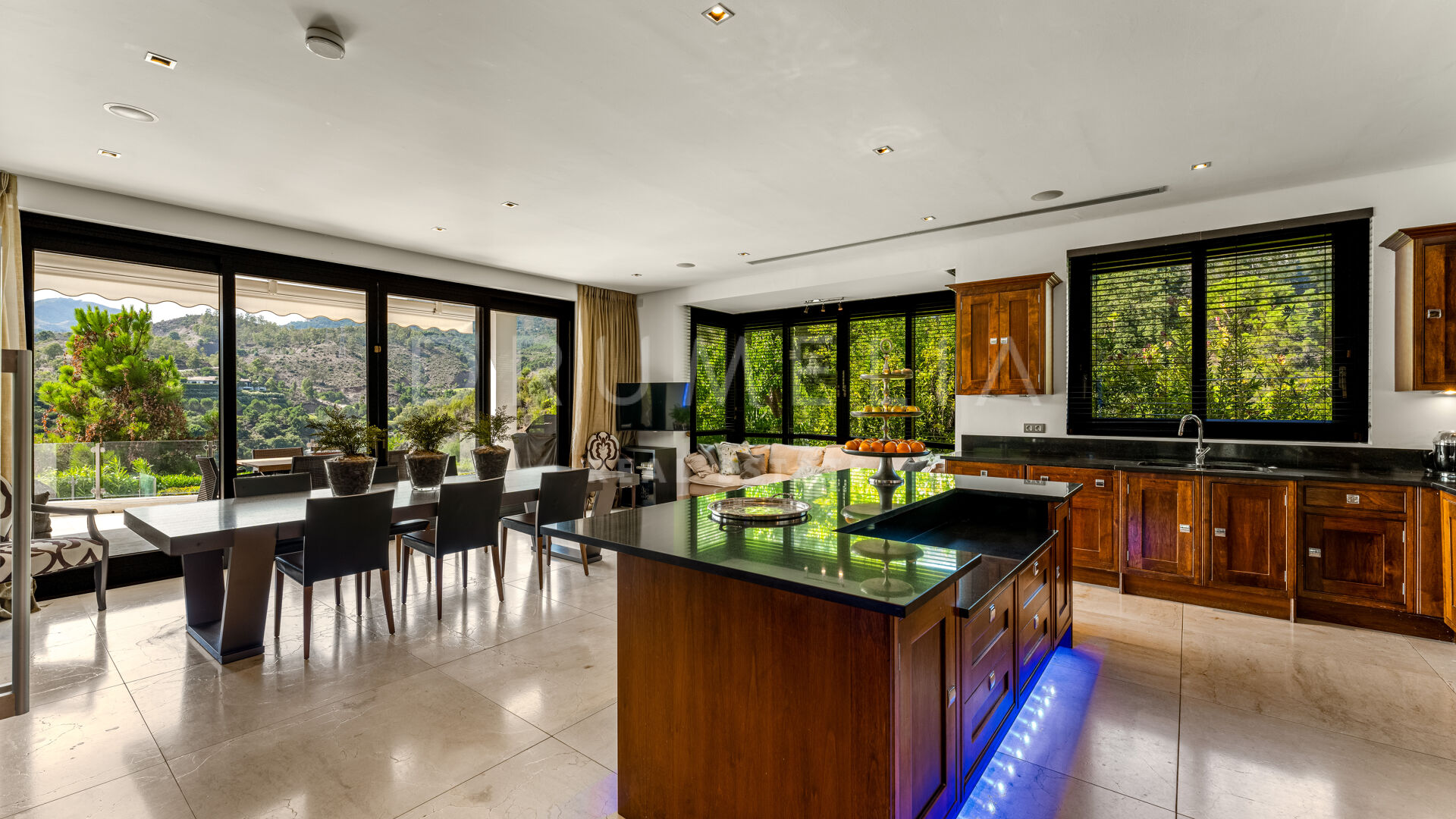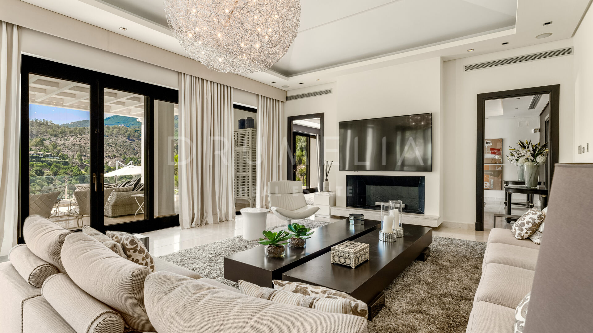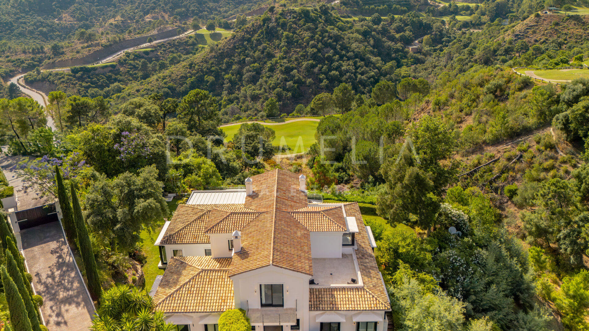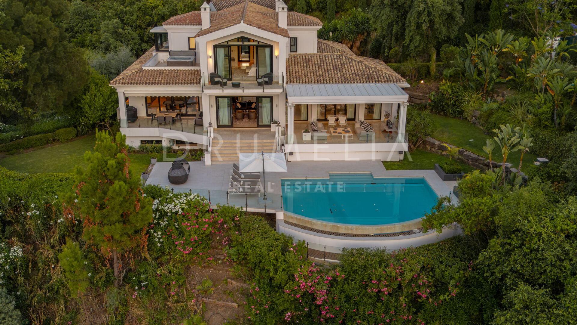 Situated on a private west-facing plot of 4,418 m², the villa offers breathtaking views of landscaped gardens, rolling hills, and the surrounding countryside. The spacious layout includes an open-plan lounge, a state-of-the-art gourmet kitchen, and multiple indoor and outdoor dining areas — ideal for entertaining. The property offers six spacious bedrooms, six bathrooms, and six guest toilets, all finished with premium fixtures.