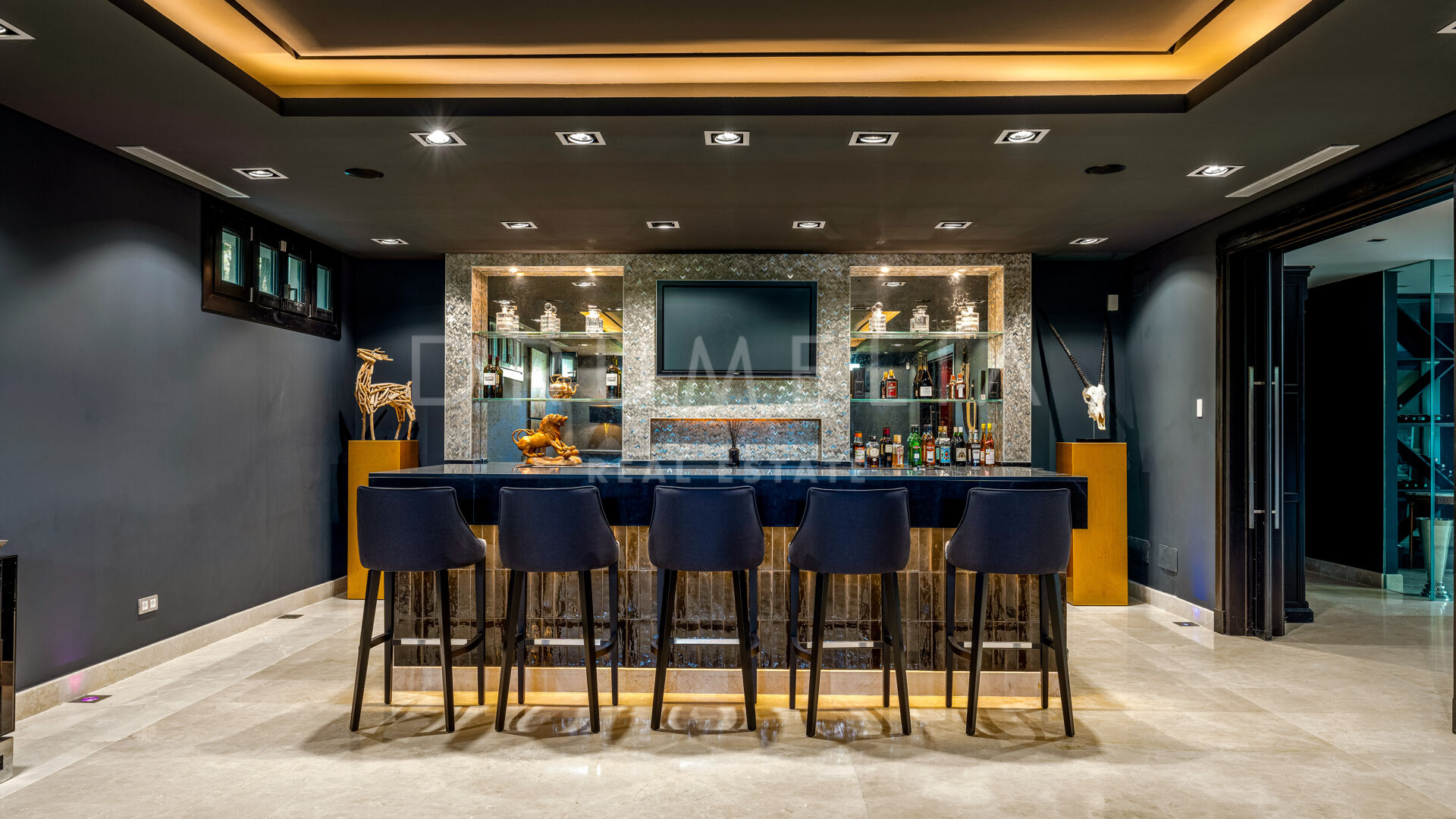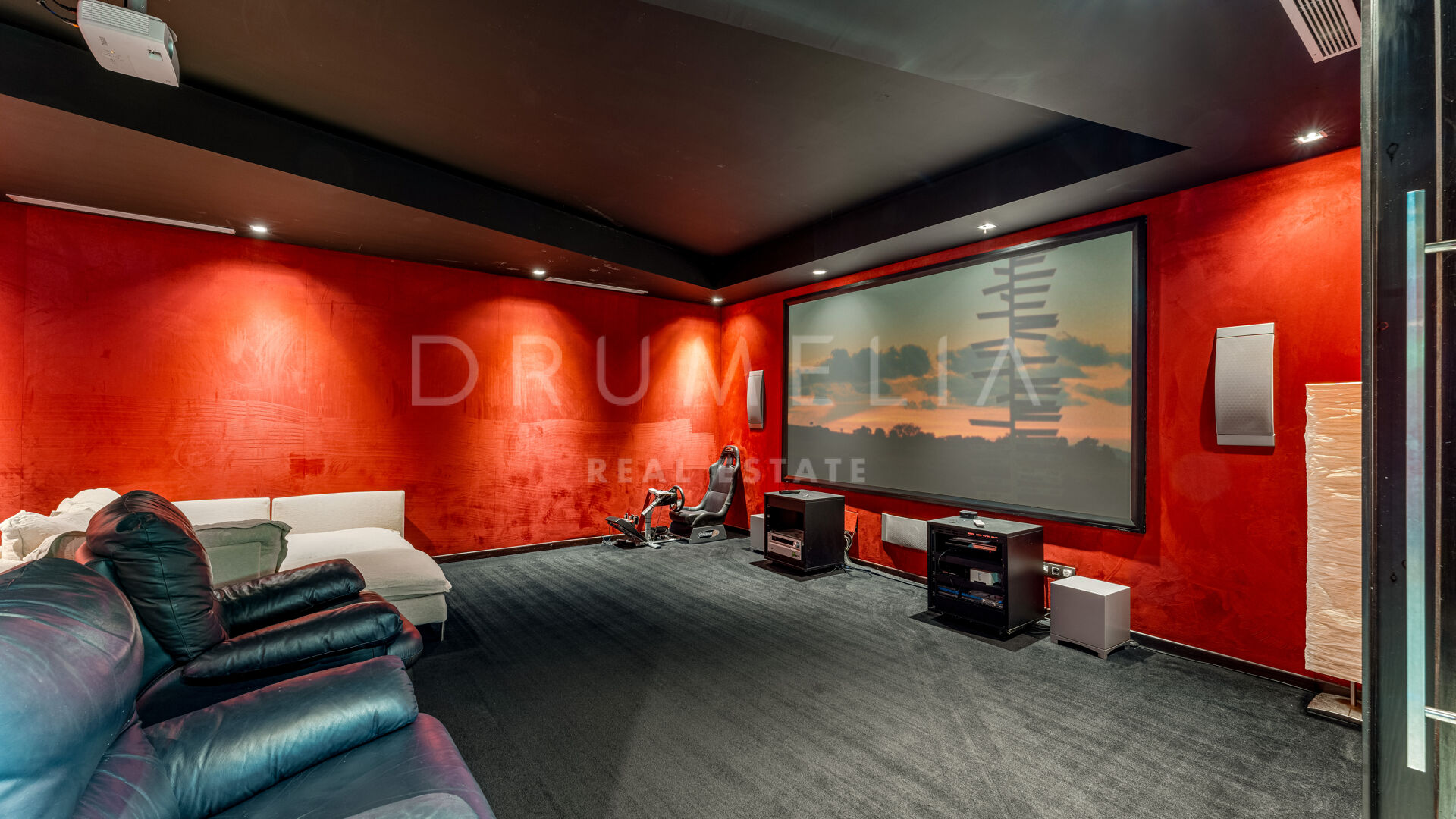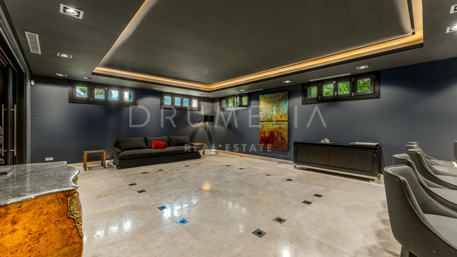 Additional features include a wine cellar, home cinema, bar, gym, sauna, a staff apartment, and a garage for up to three cars. The outdoor areas are equally striking, with a mature landscaped garden, hardwood decking, and a heated infinity pool — all seamlessly integrated with the villa’s architectural design.