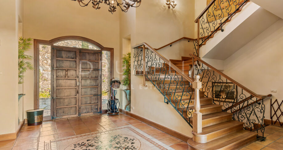 On the lower level, the home is designed for leisure and everyday living, featuring a games room, wine cellar, gym with shower, Turkish bath, additional guest bedrooms, and staff quarters. The outdoor areas include a swimming pool, expansive terraces, and mature gardens that have been recently enhanced with new landscaping, irrigation systems, and planting.