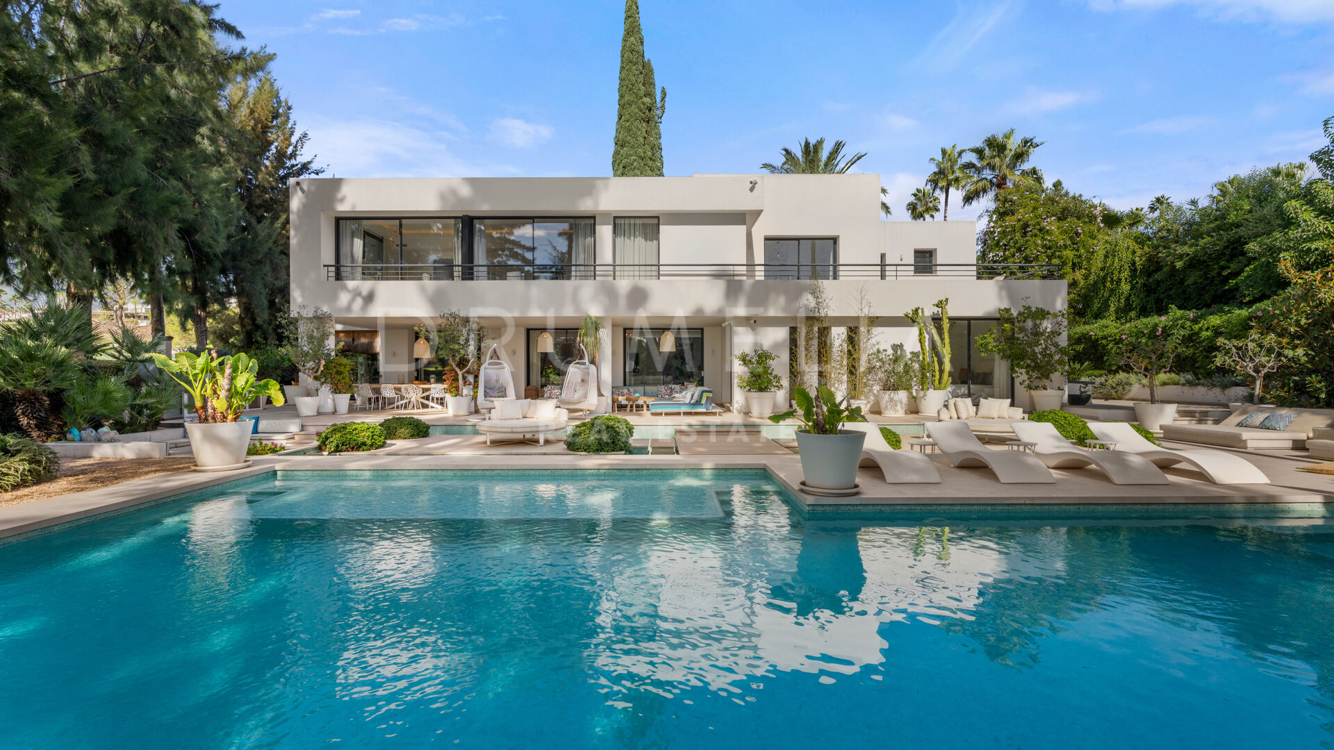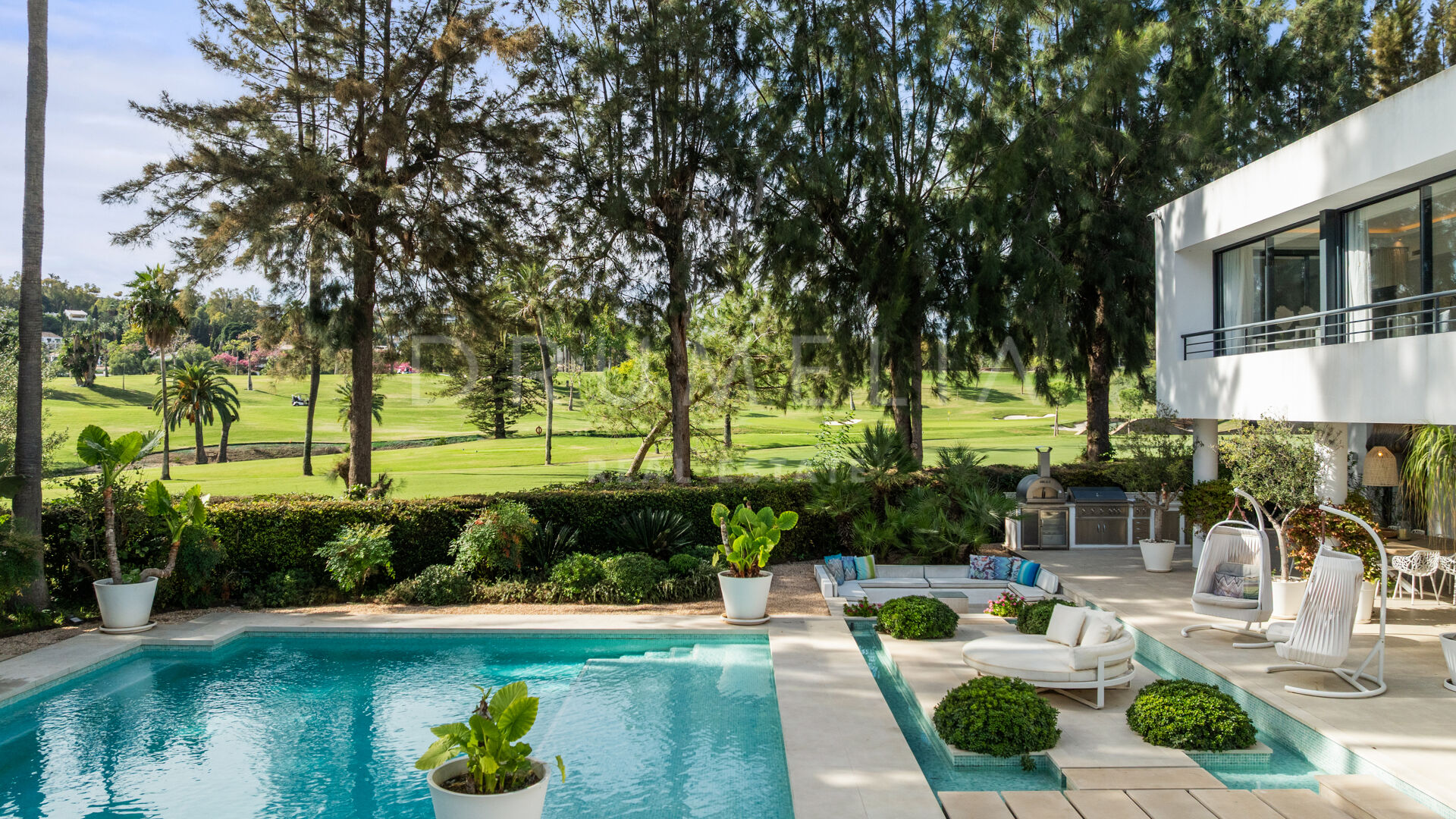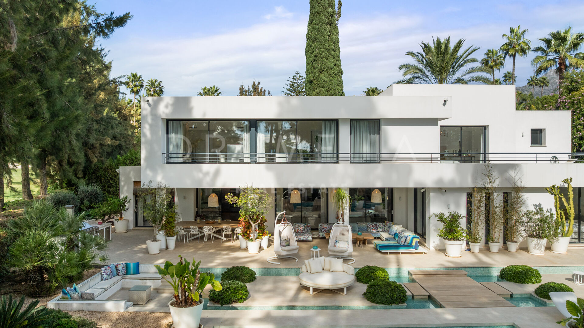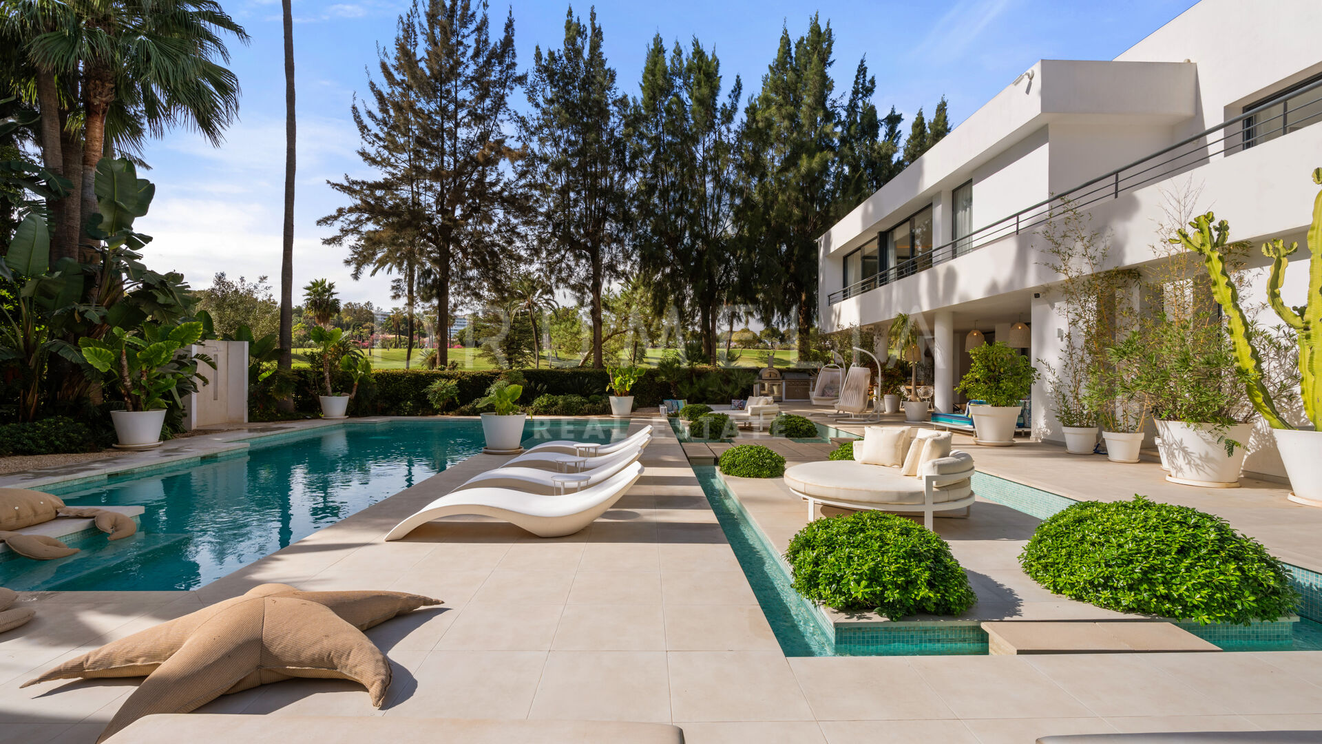 The exterior of this remarkable property features the solarium, covered and sunny terraces of 330 m², a swimming pool and sunbathing areas surrounded with perfectly manicured and tastefully decorated garden with several areas that guarantee an ideal entertainment time and fun for your family and guests. Every detail ensures the highest quality outdoor living. The strategic spots around the house are decorated with fountains and lush greenery where you can let your thoughts wander, meditate or read a good book. You can organize a formal dinner under the moonlight in the al fresco dining room with a natural wooden table. Comfortable chill-out areas are located around a huge white barbecue where to enjoy pleasant reunions with friends.