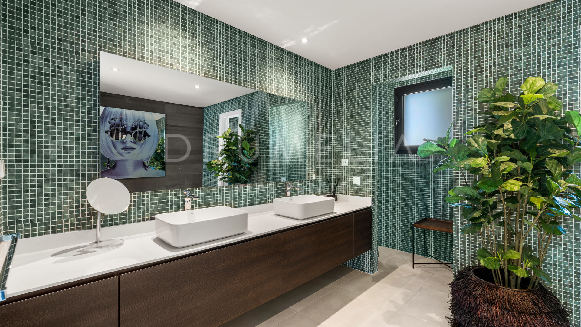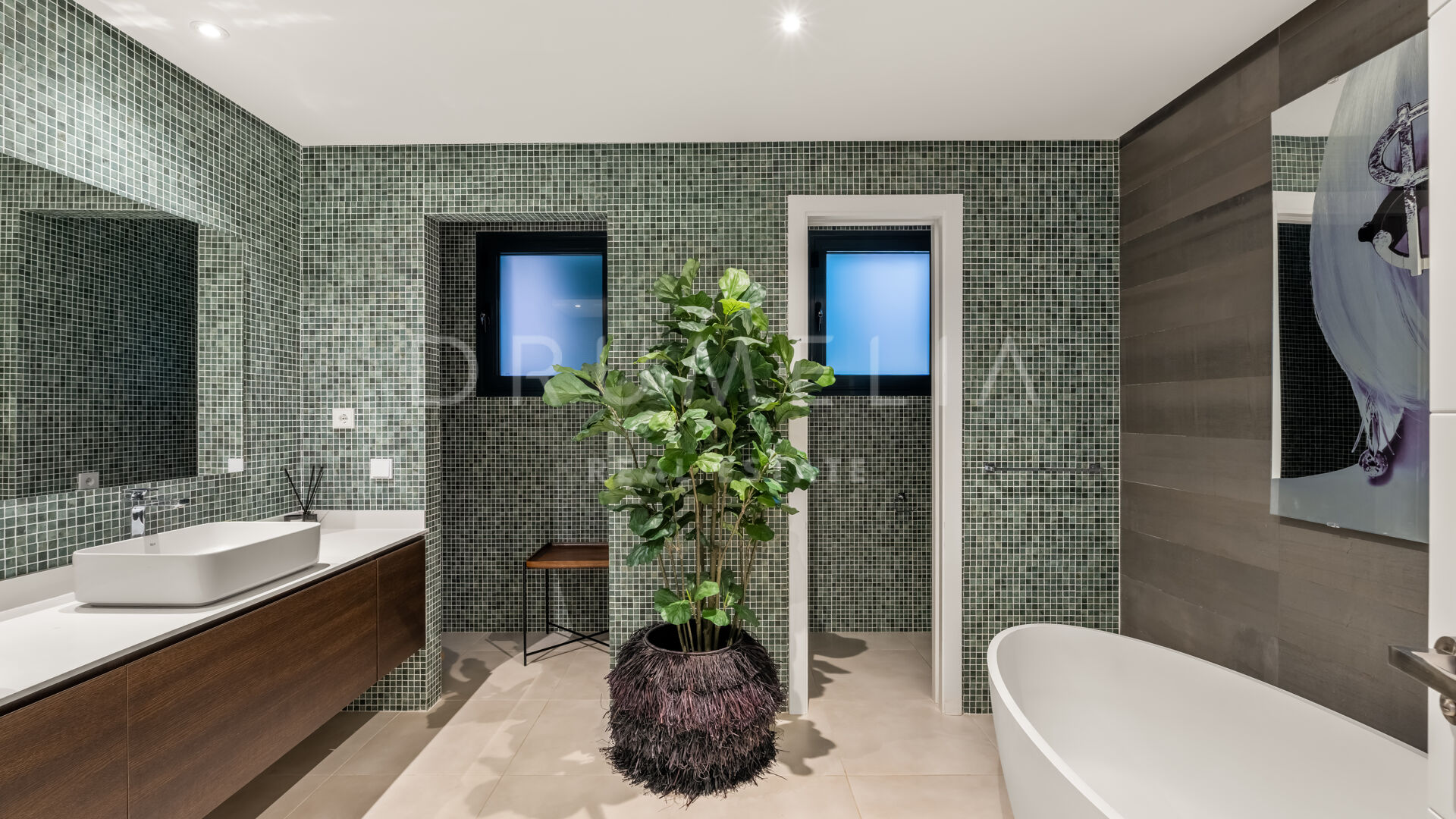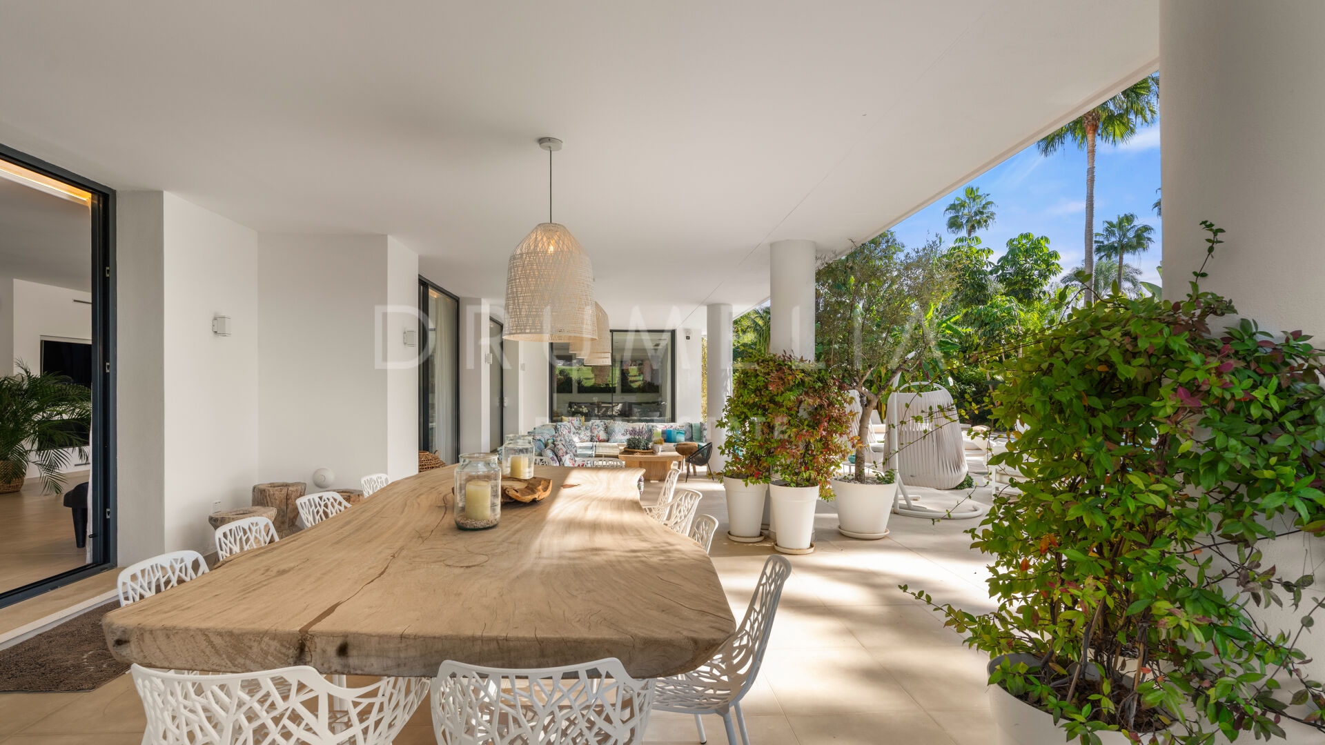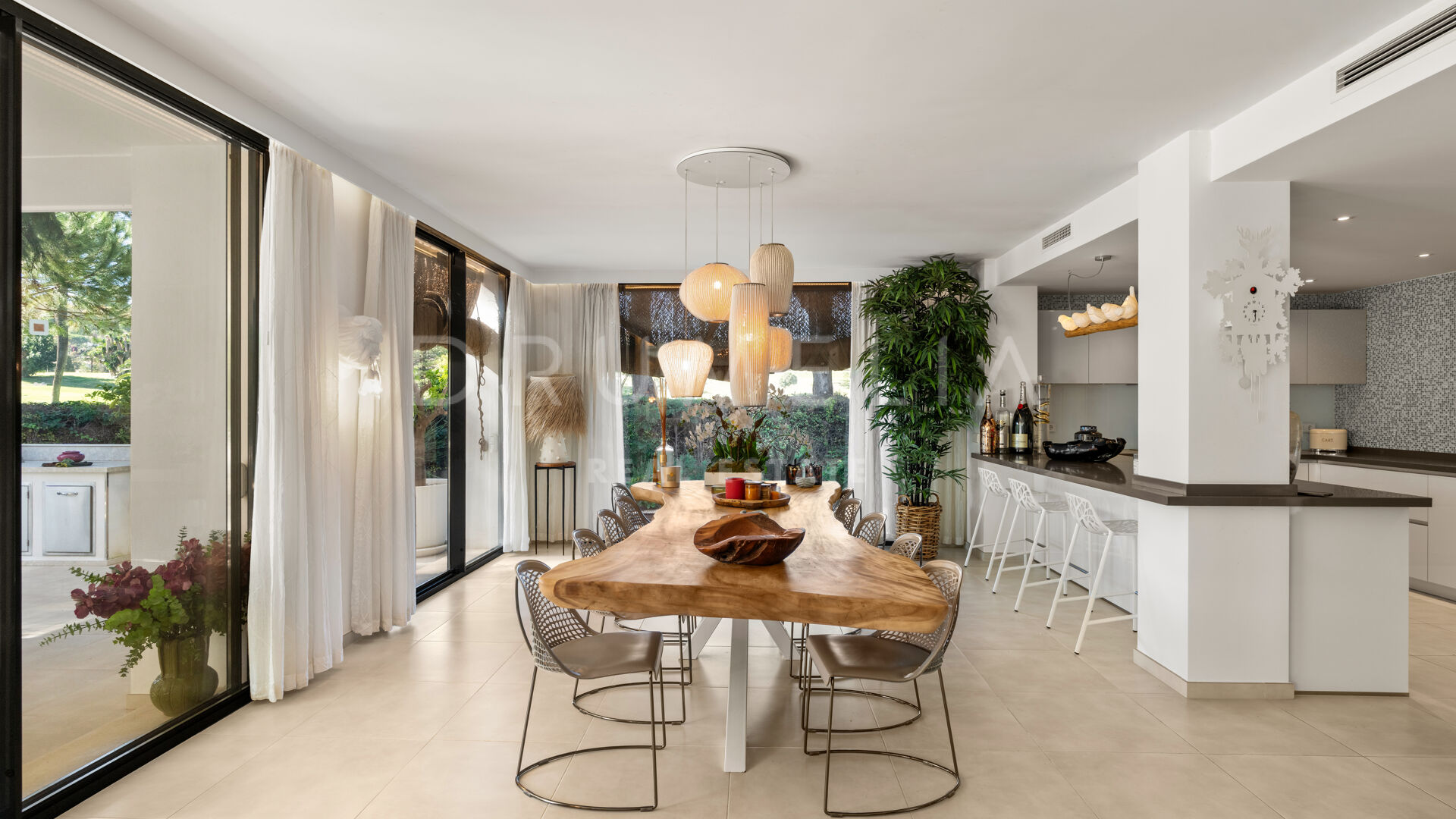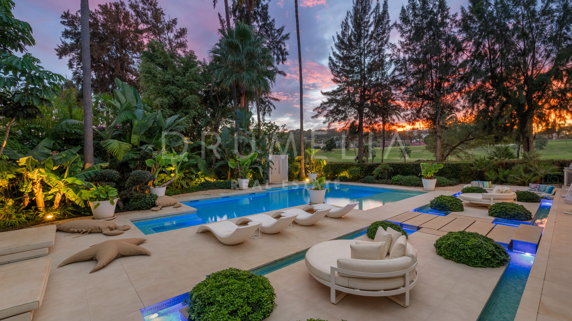 The exterior of this remarkable property features the solarium, covered and sunny terraces of 330 m², a swimming pool and sunbathing areas surrounded with perfectly manicured and tastefully decorated garden with several areas that guarantee an ideal entertainment time and fun for your family and guests. Every detail ensures the highest quality outdoor living. The strategic spots around the house are decorated with fountains and lush greenery where you can let your thoughts wander, meditate or read a good book. You can organize a formal dinner under the moonlight in the al fresco dining room with a natural wooden table. Comfortable chill-out areas are located around a huge white barbecue where to enjoy pleasant reunions with friends.