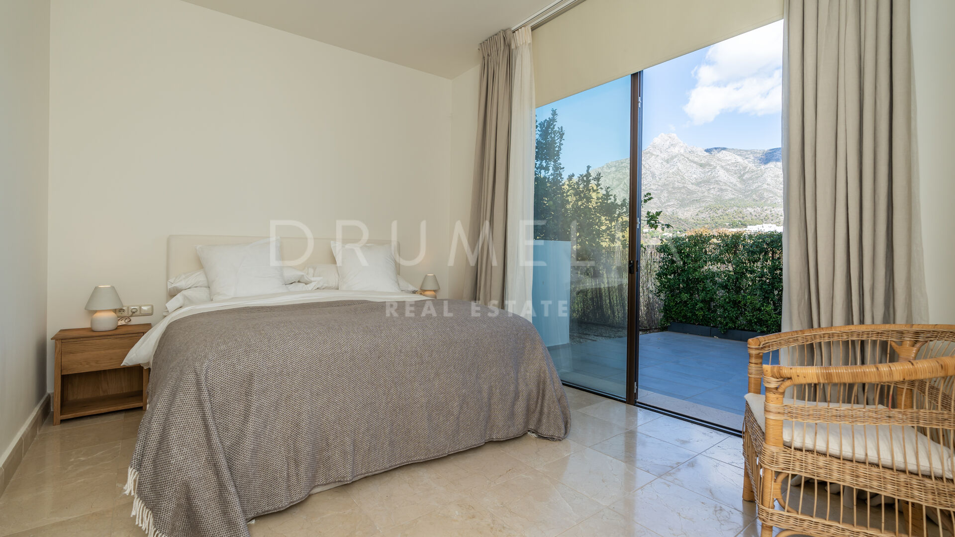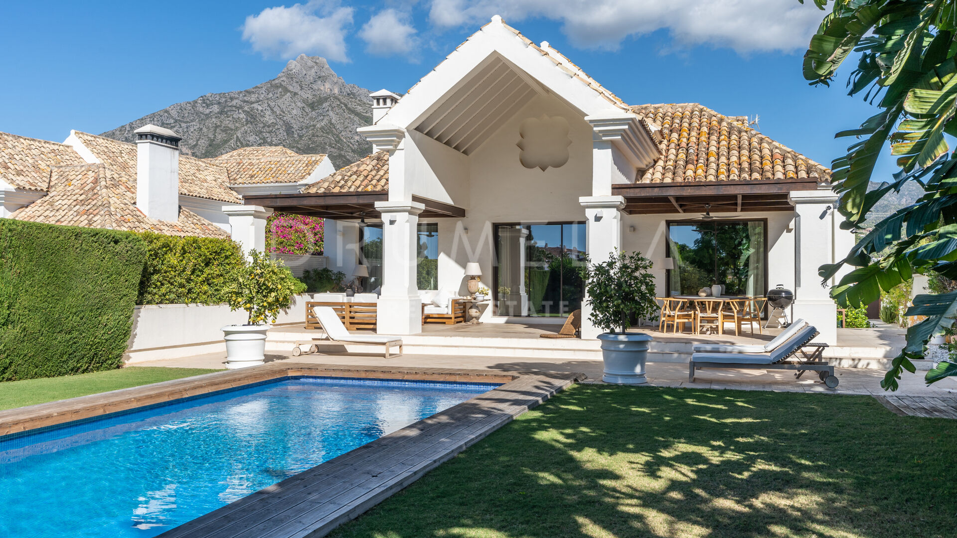 Surrounded by lush greenery and similar luxurious properties of Marbella, the house of 608 m² sits on a plot of 1.112 m². The interior and wonderful terraces offers breath- taking views of the Mediterranean Sea and peaceful mountains. The expansive plot includes a private swimming pool, a porch area, and a beautifully landscaped garden. The elegant traditional-style villa with white walls and terracotta clay roof is full of southern charm. The splendid property stands in impeccable condition, boasting superb construction quality. Spread across 3 levels, it features 5 serene bedrooms, 5 bathrooms and a guest toilet, a spacious and inviting living room with a fireplace and soaring ceilings, a dining area and a large, separate and fully fitted kitchen. A private garage can accommodate 3-4 cars. Air-conditioning, glass doors, double glazing, fitted wardrobes are just some of many feature of this property that will make your living super comfortable.