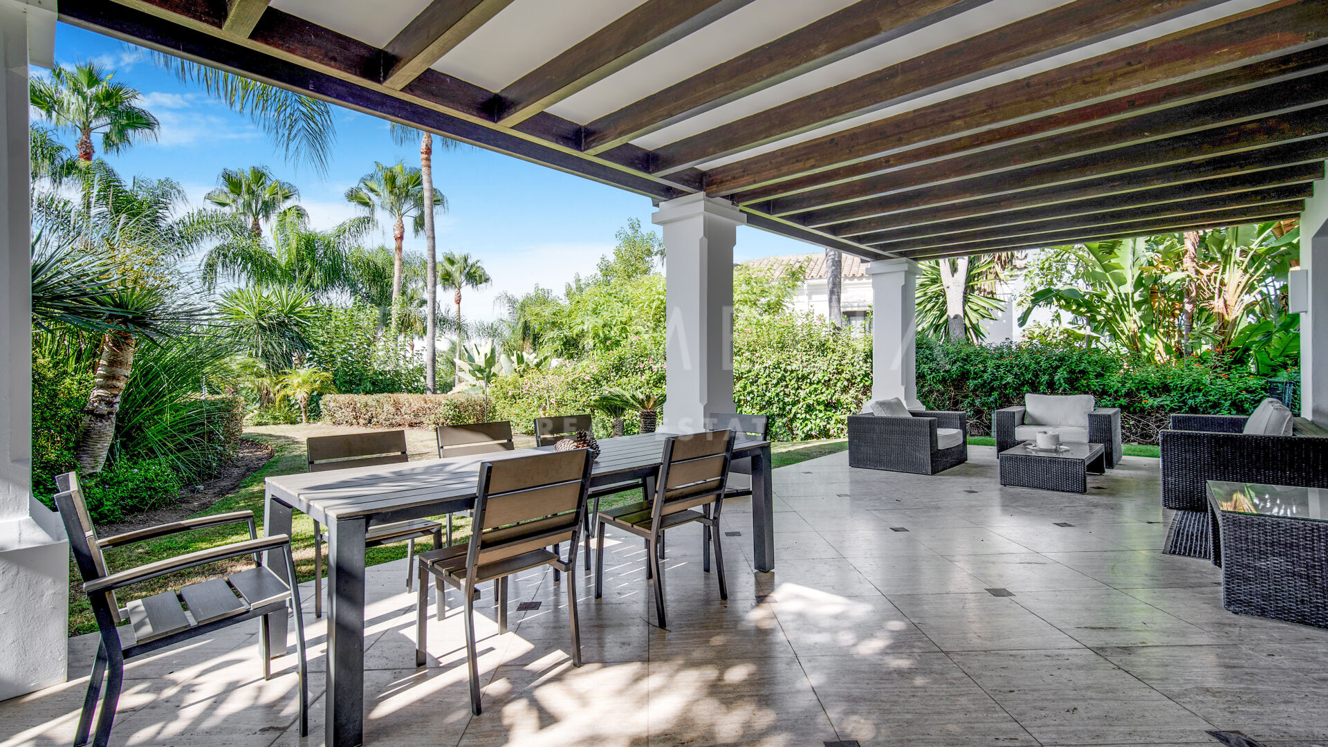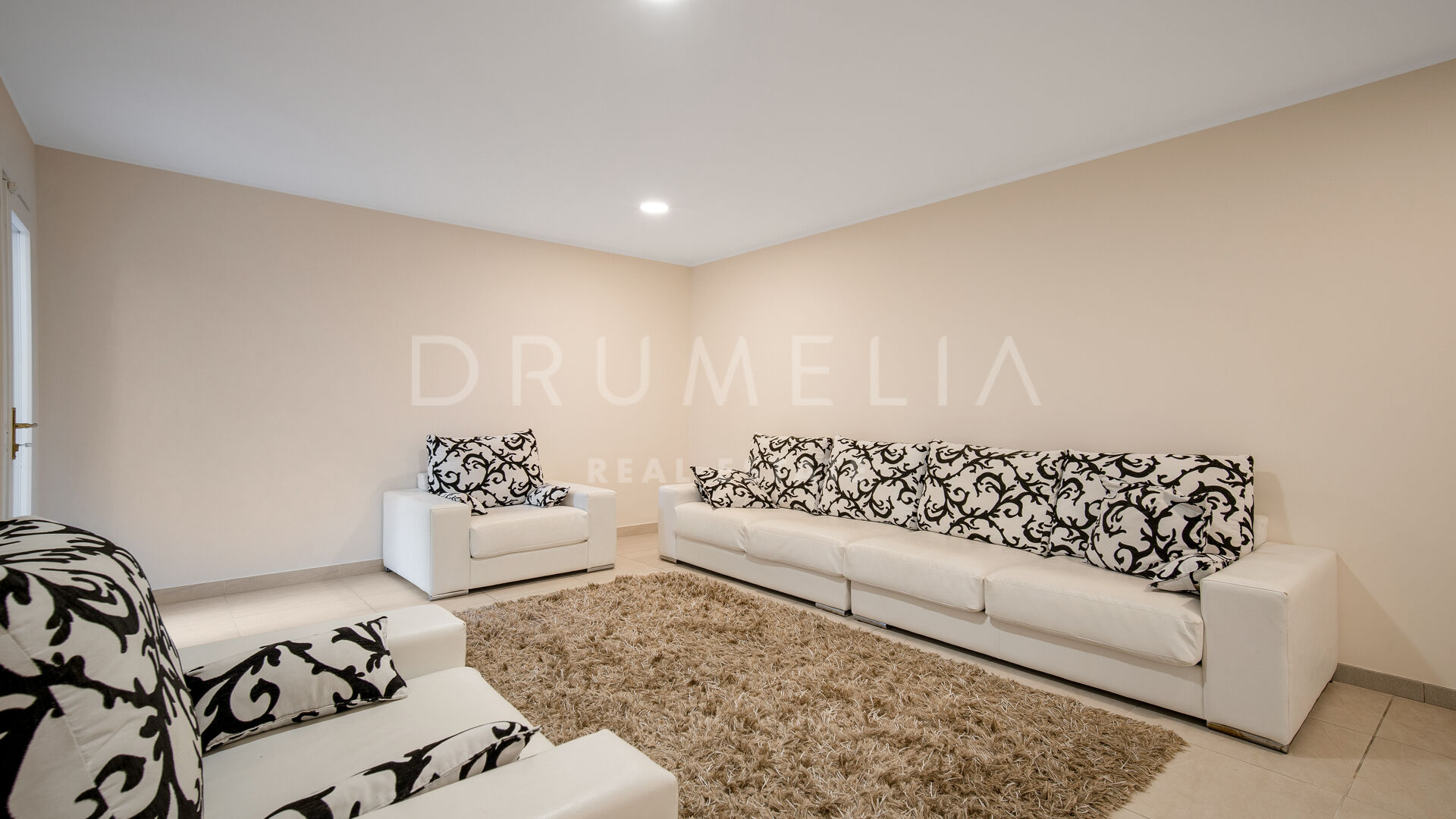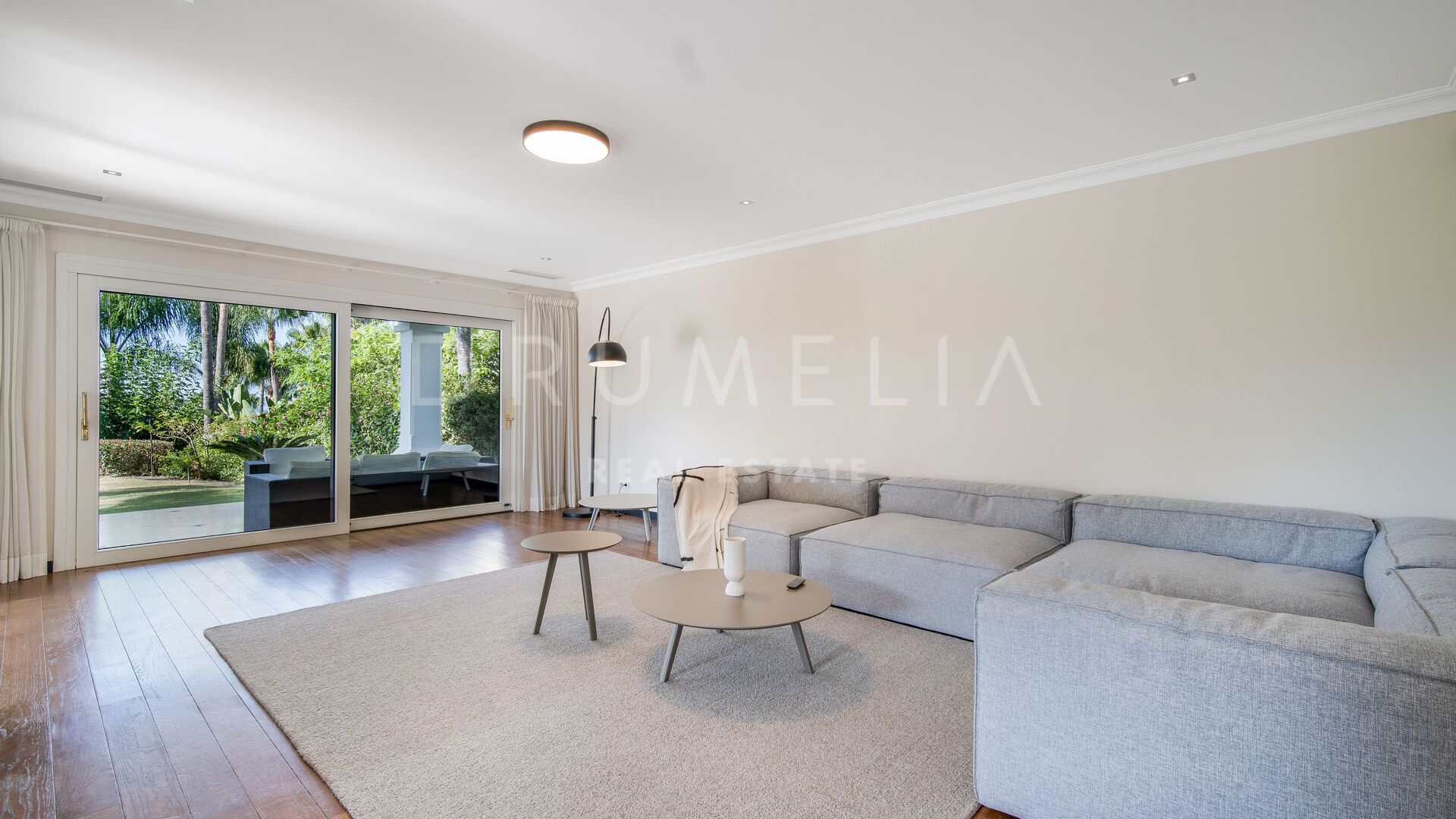 This five-bedroom south-facing villa is located in the secure and prestigious Las Lomas de Magna Marbella complex on the Golden Mile. The community offers 24-hour security, two large swimming pools, and lush tropical gardens, all just minutes from beaches, restaurants, shops, and golf courses.