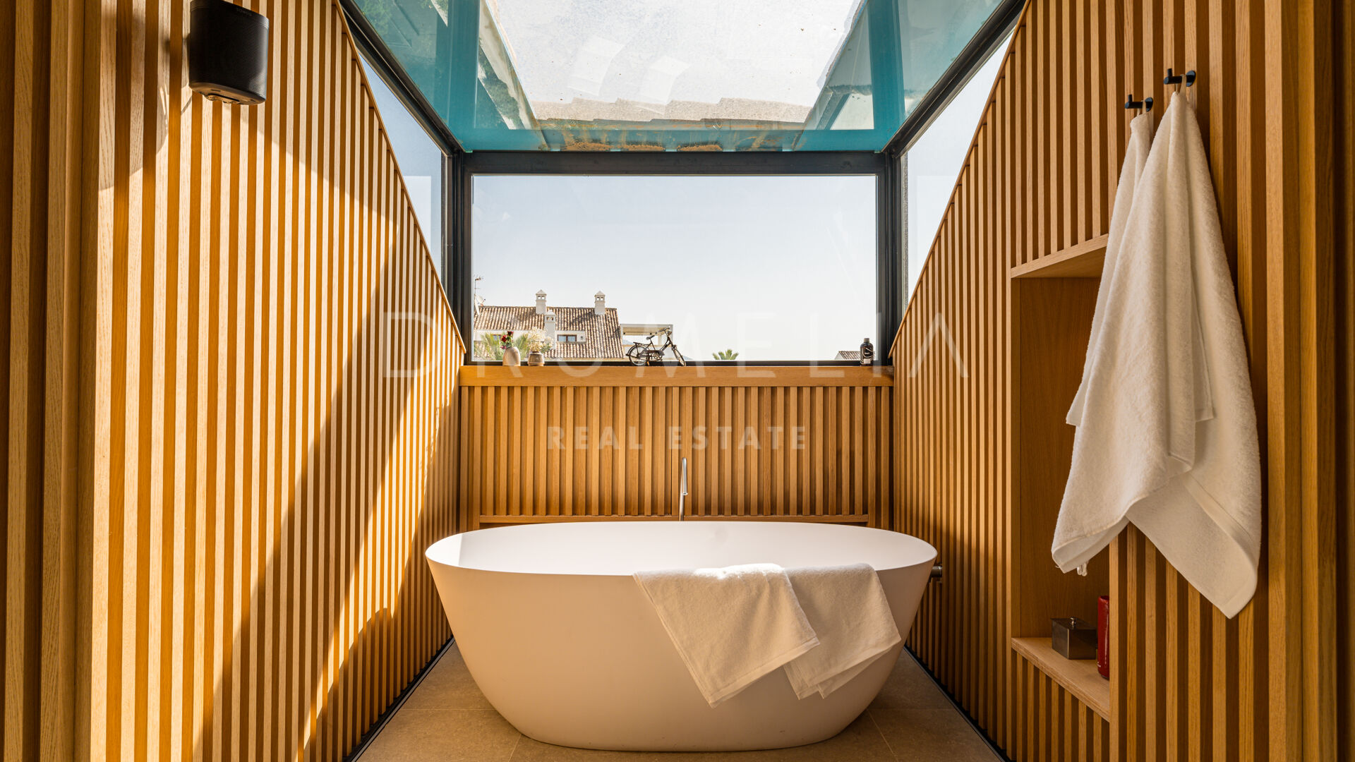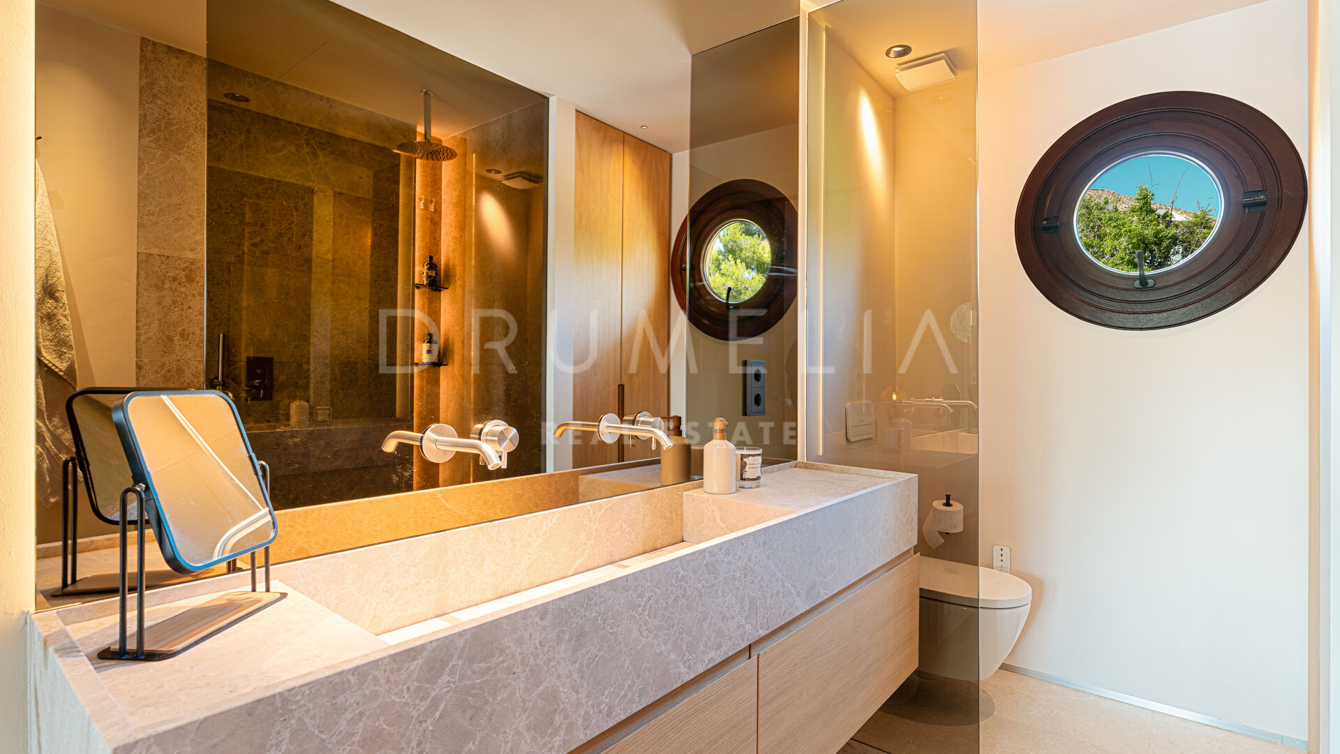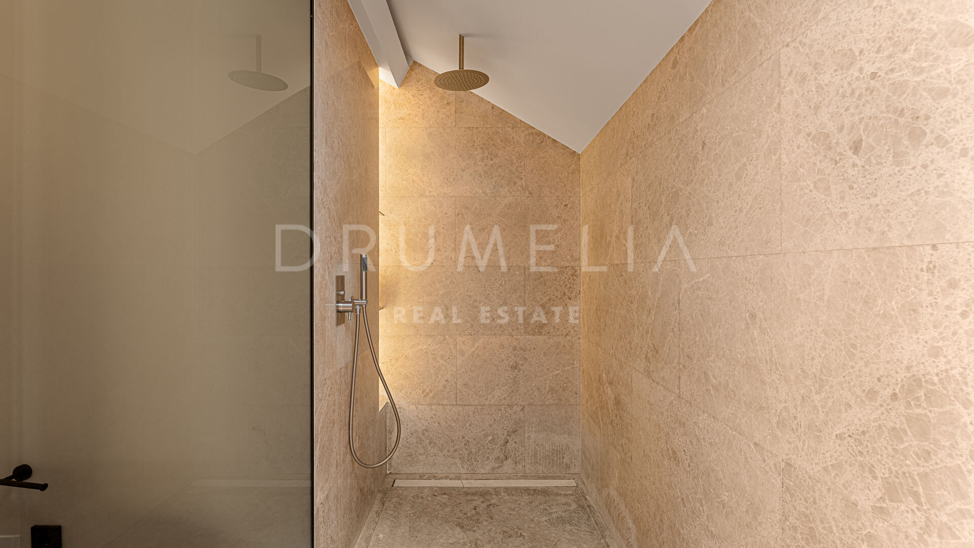 An internal staircase leads to the upper level, entirely dedicated to the master suite. This space offers privacy and serenity, with direct access to its own terrace via a French balcony. Bathrooms throughout the property feature high-end fixtures and contemporary finishes, maintaining a consistent luxury standard.
