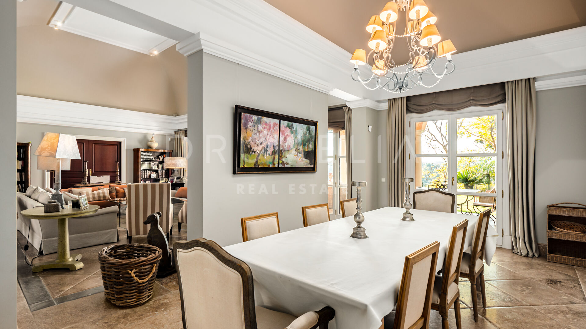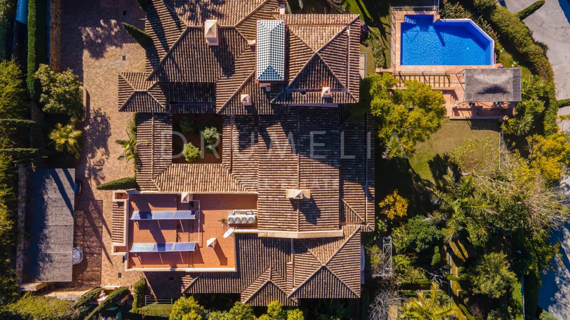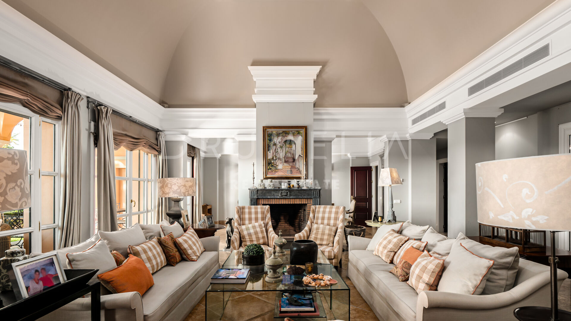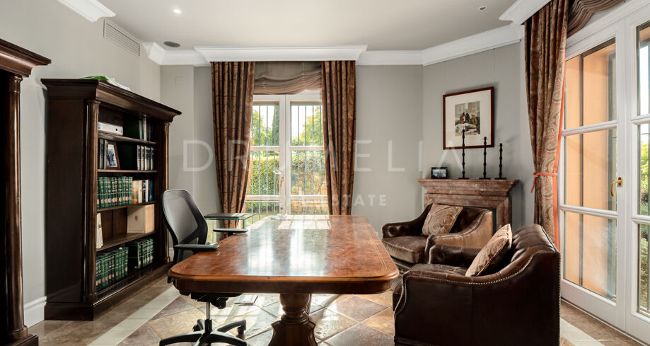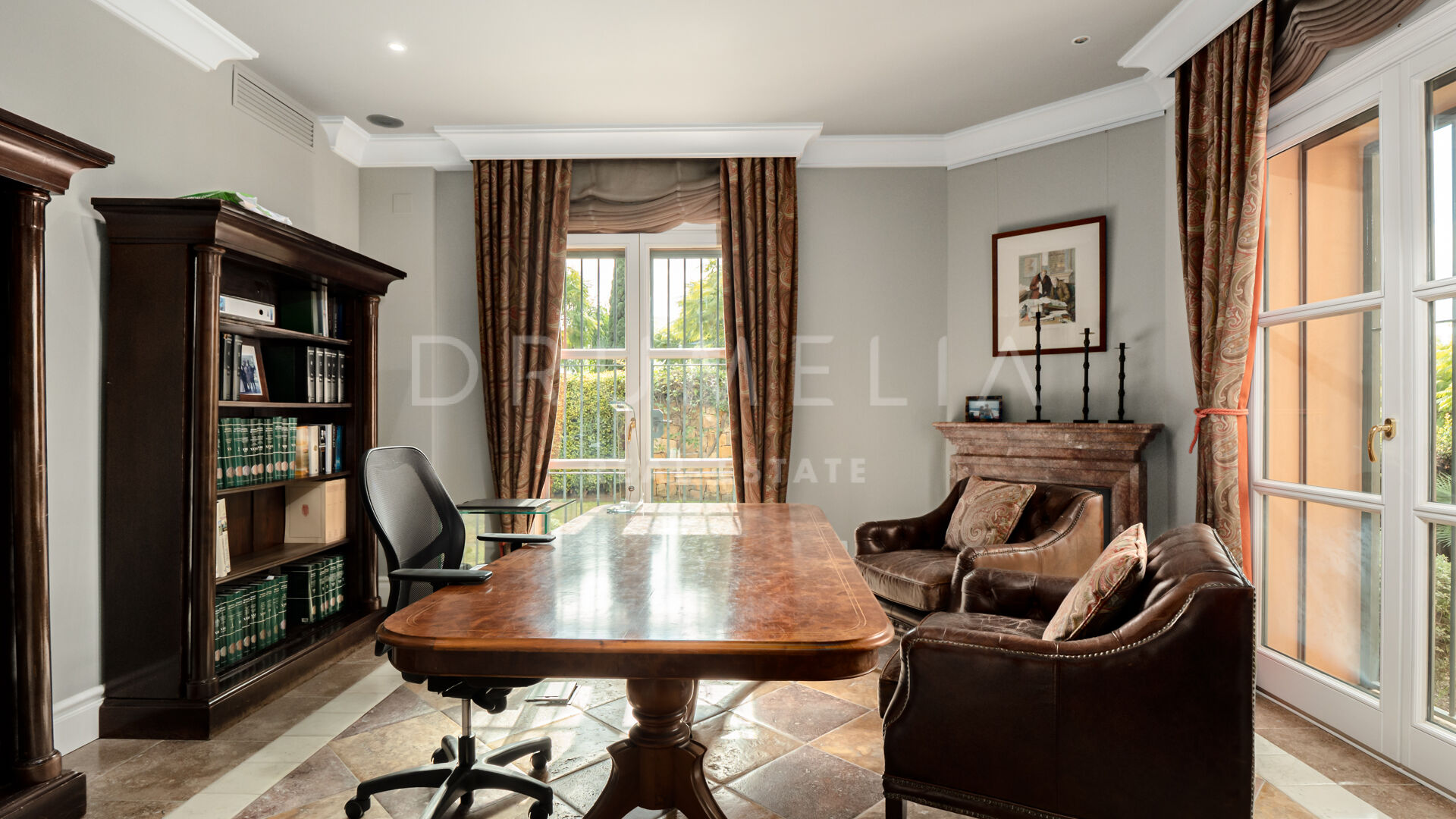 The spectacular mansion features an entrance hall, a timelessly elegant living room with a fireplace and a separate dining room, a fully fitted modern-style, black and white kitchen with a breakfast area, a pantry and laundry area, an office/library with another classic fireplace, a family room, 8 serene bedrooms (6 with en-suite bathrooms), 8 luxurious bathrooms and 2 guest toilets. The living areas of the house lead to the private balconies and wonderful terraces of 166 m² where you have enough space to relax, have BBQ and dine al fresco.