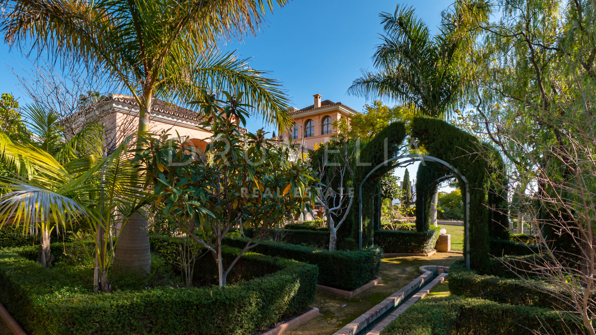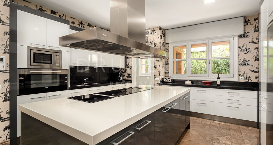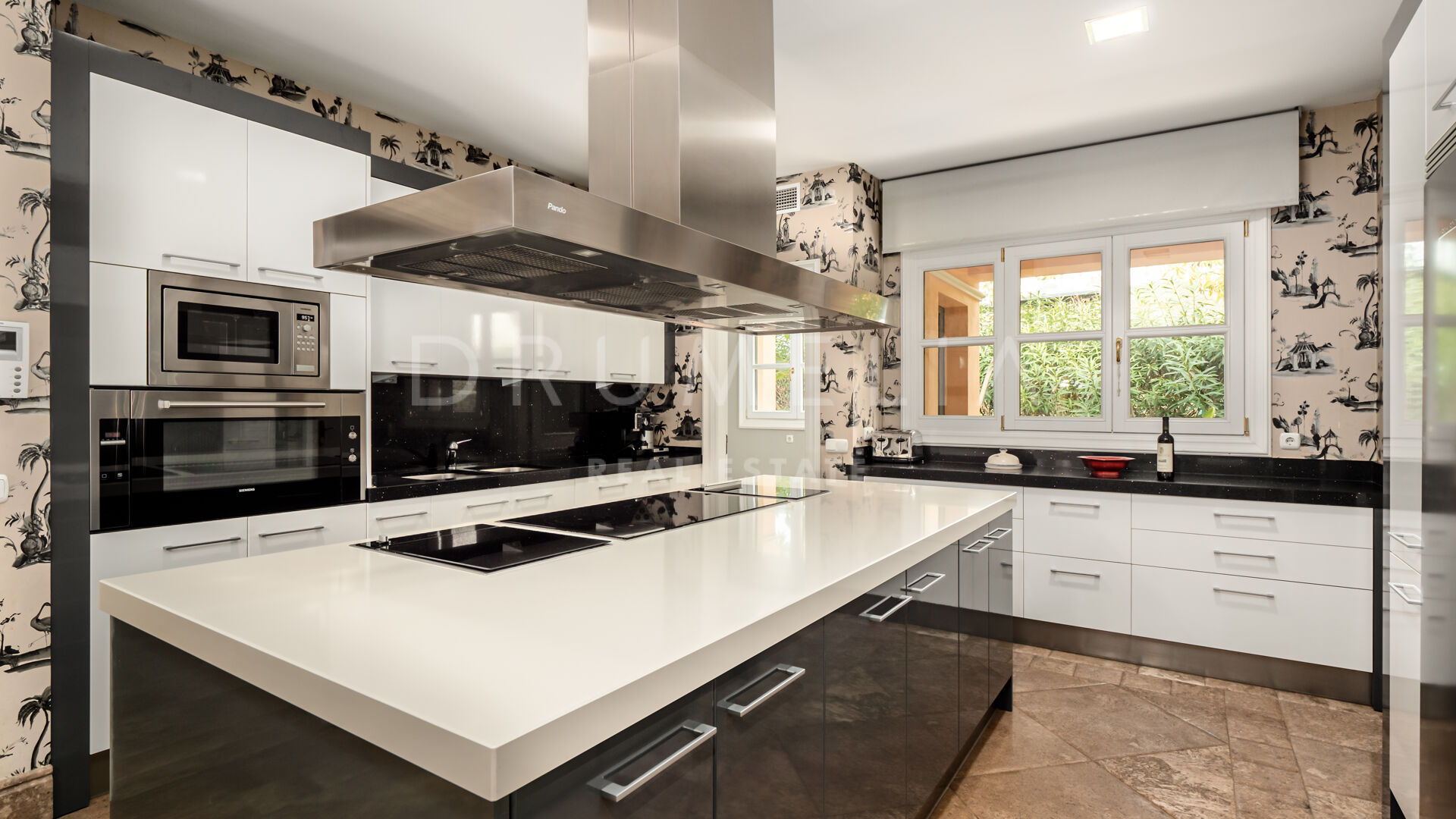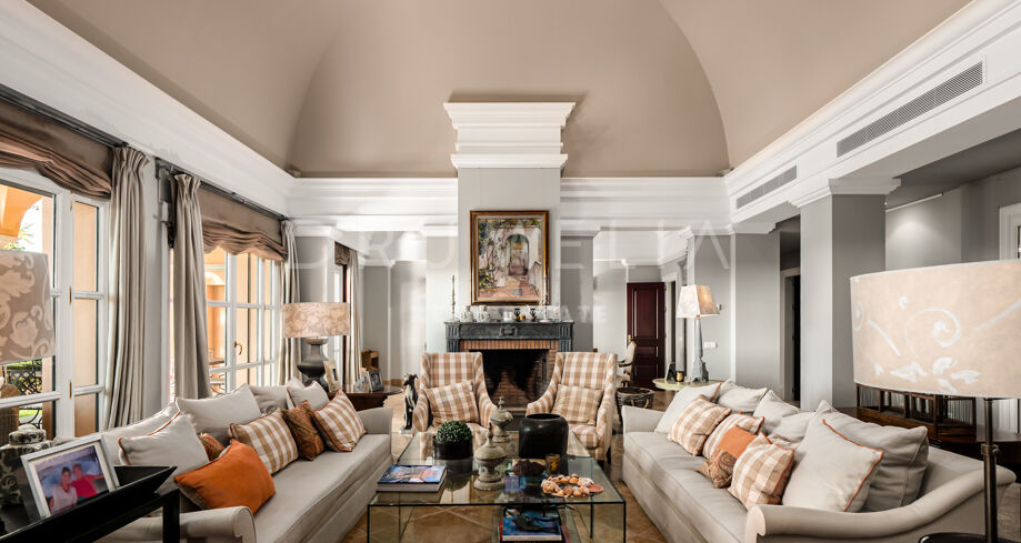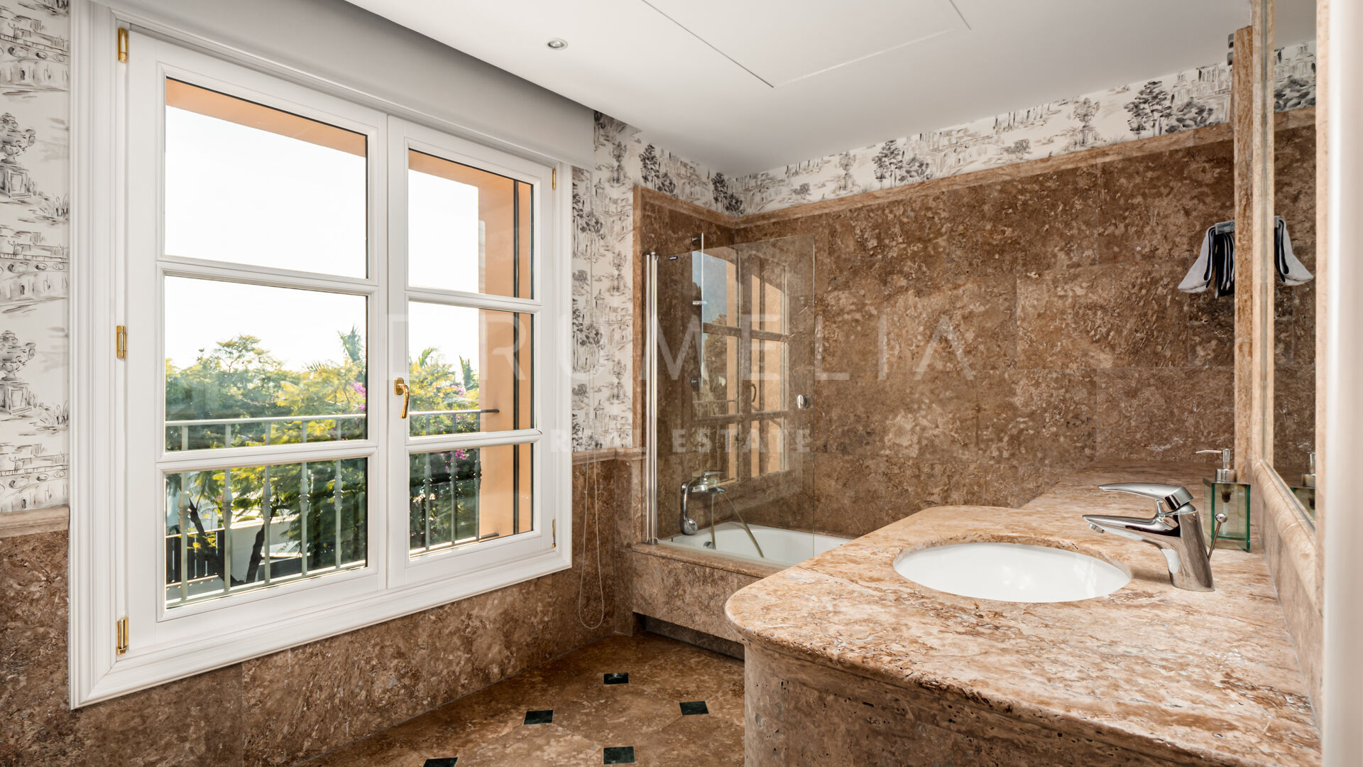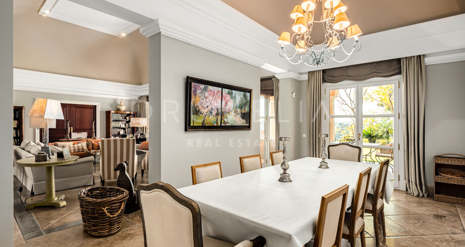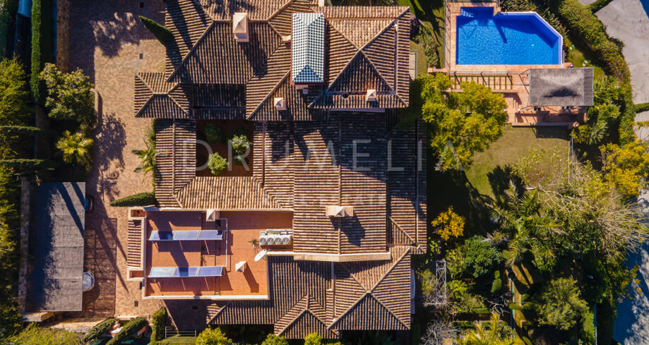 The spectacular mansion features an entrance hall, a timelessly elegant living room with a fireplace and a separate dining room, a fully fitted modern-style, black and white kitchen with a breakfast area, a pantry and laundry area, an office/library with another classic fireplace, a family room, 8 serene bedrooms (6 with en-suite bathrooms), 8 luxurious bathrooms and 2 guest toilets. The living areas of the house lead to the private balconies and wonderful terraces of 166 m² where you have enough space to relax, have BBQ and dine al fresco.