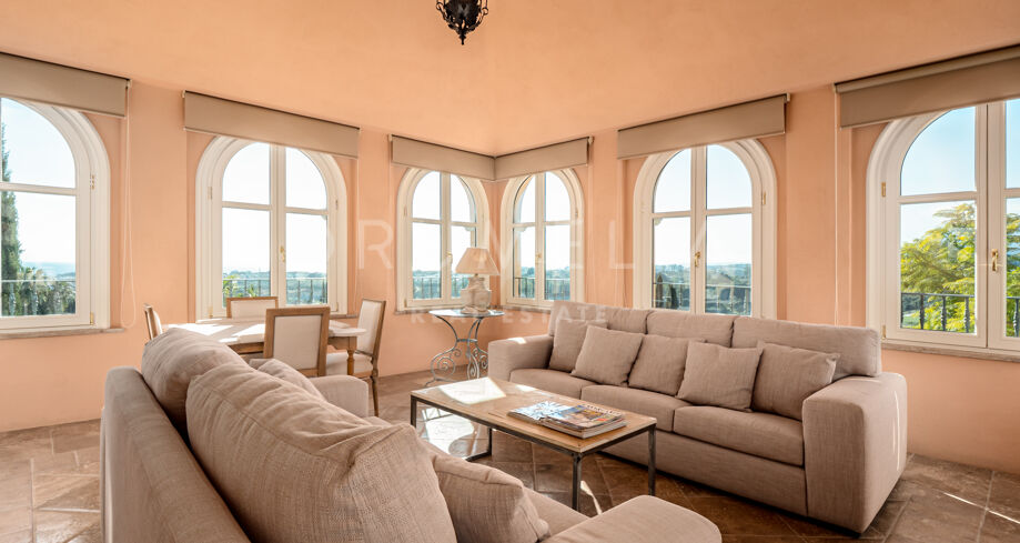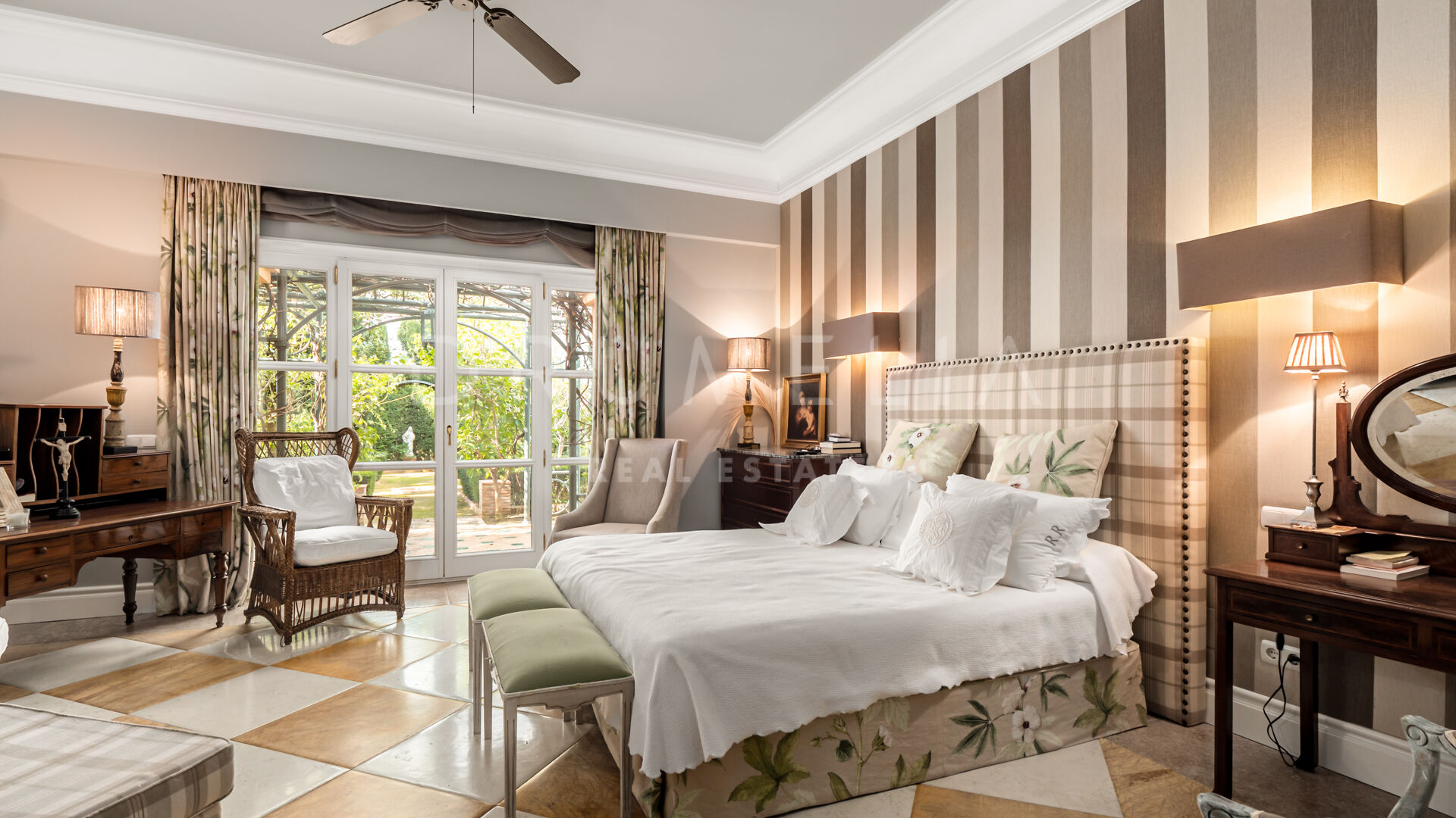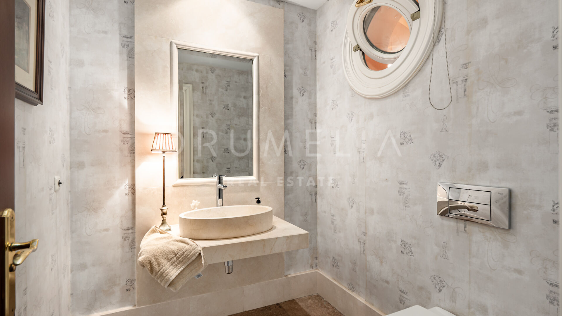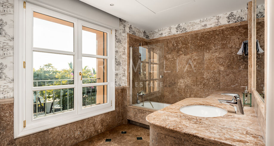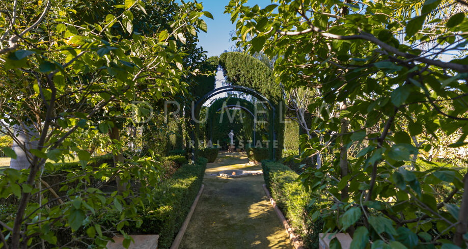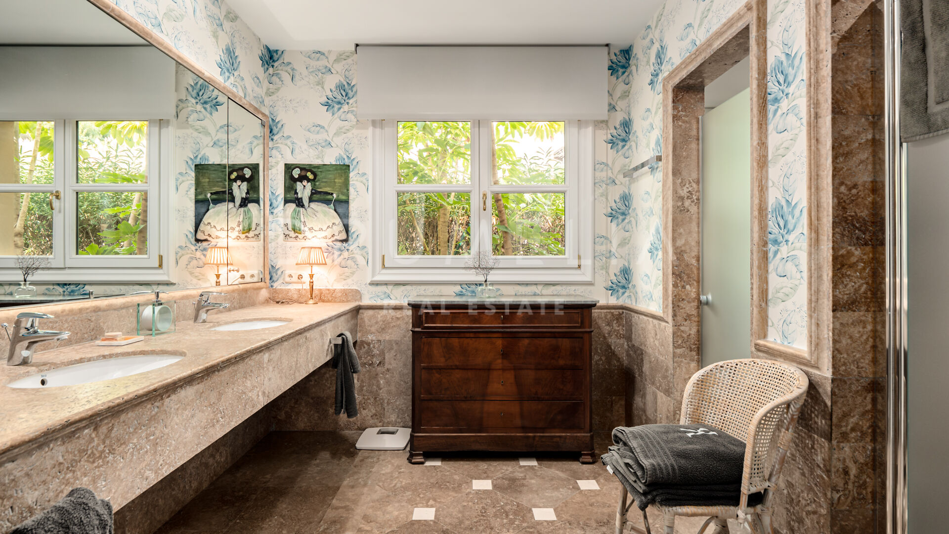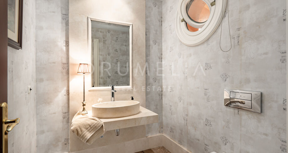 The spectacular mansion features an entrance hall, a timelessly elegant living room with a fireplace and a separate dining room, a fully fitted modern-style, black and white kitchen with a breakfast area, a pantry and laundry area, an office/library with another classic fireplace, a family room, 8 serene bedrooms (6 with en-suite bathrooms), 8 luxurious bathrooms and 2 guest toilets. The living areas of the house lead to the private balconies and wonderful terraces of 166 m² where you have enough space to relax, have BBQ and dine al fresco.