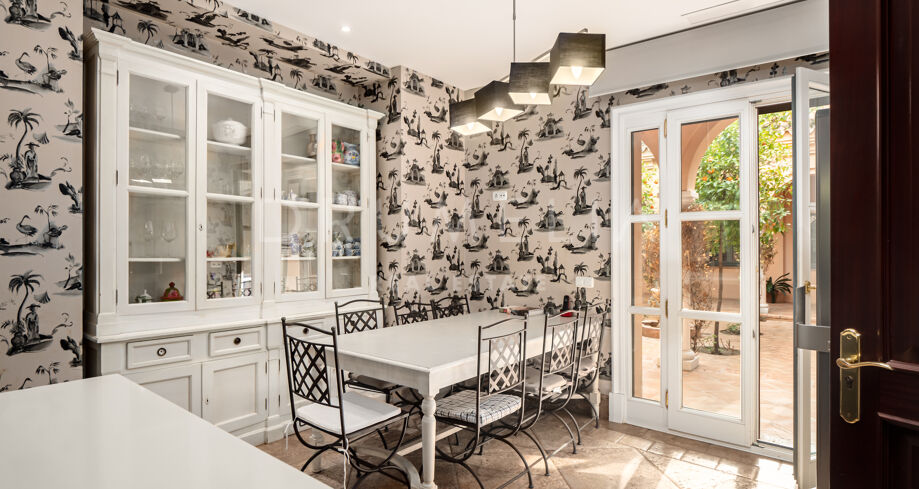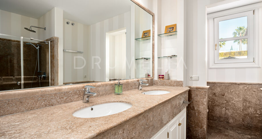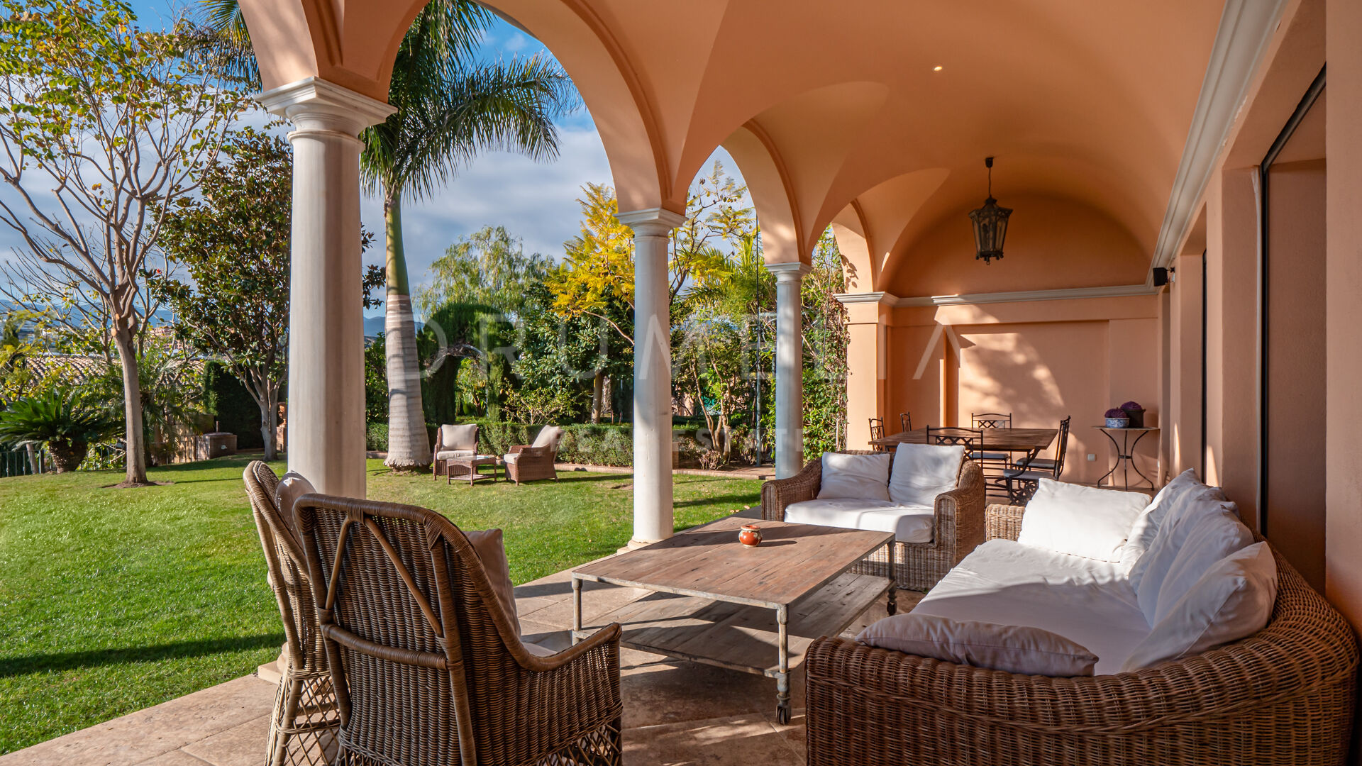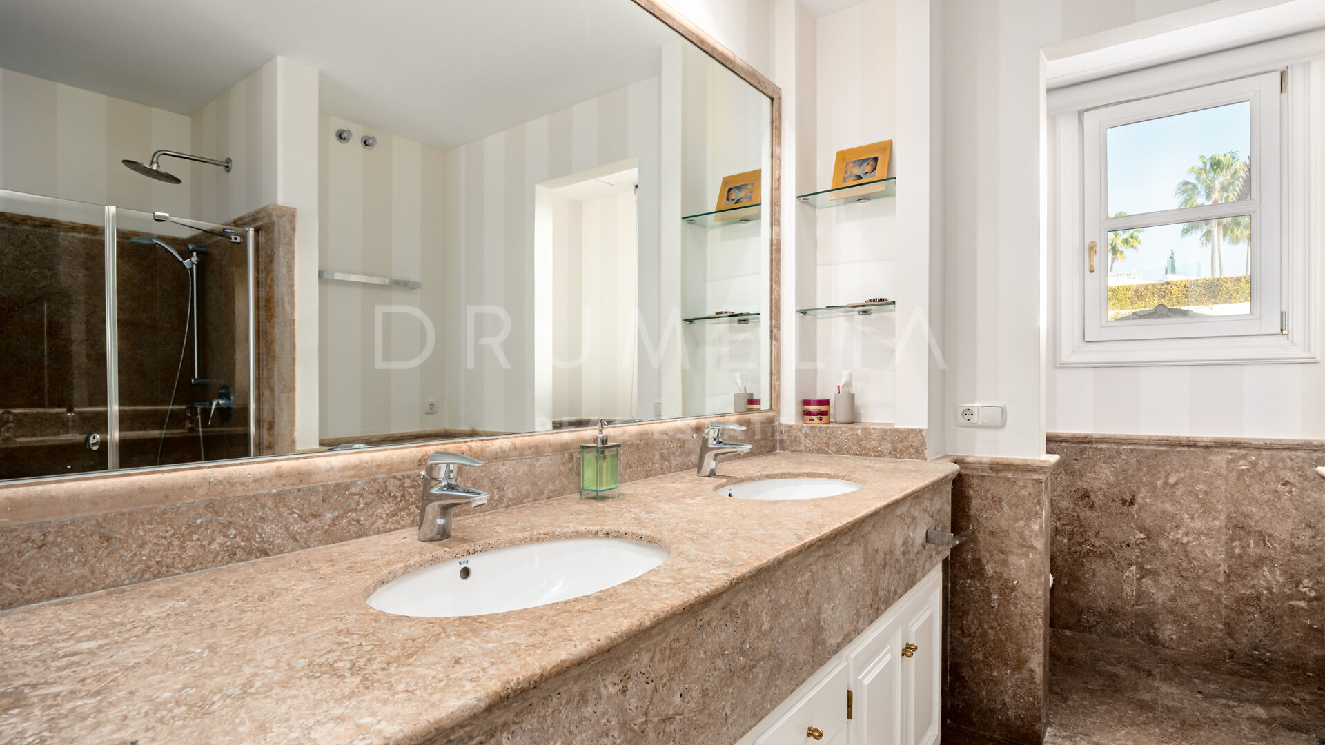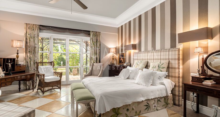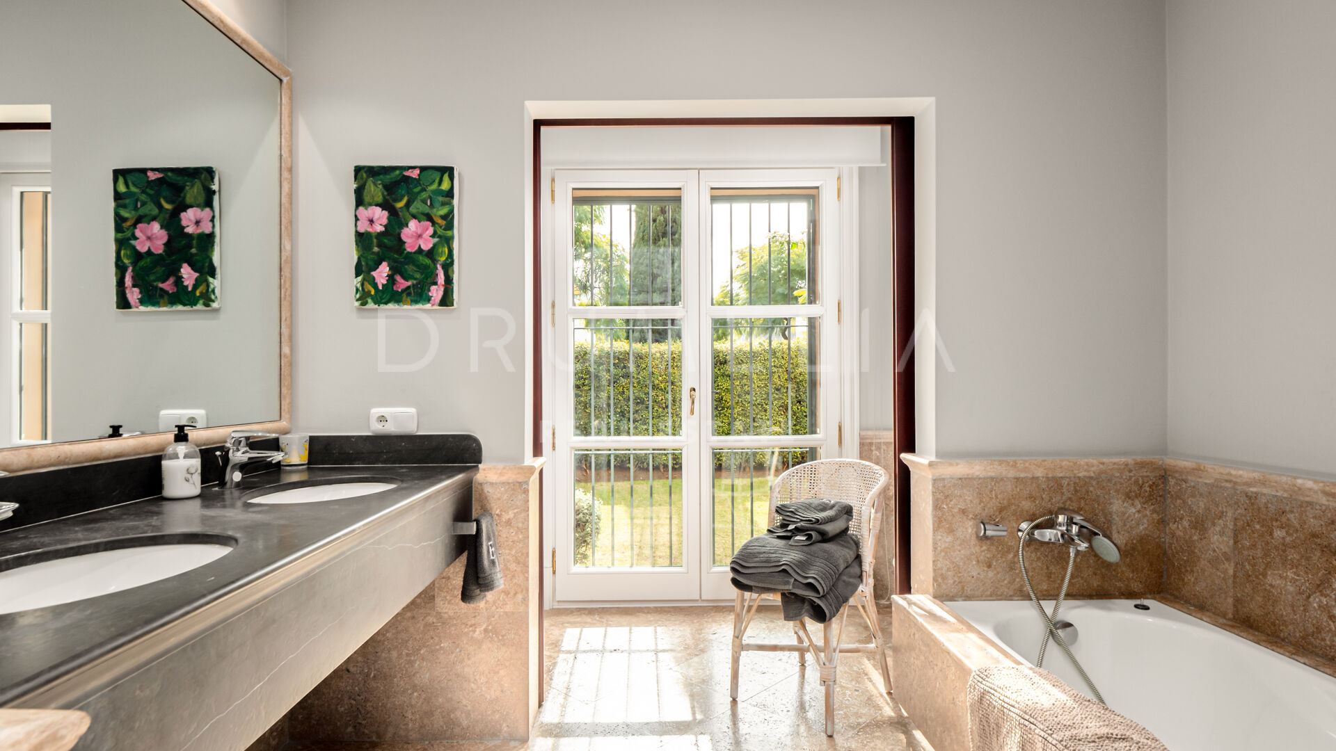 The spectacular mansion features an entrance hall, a timelessly elegant living room with a fireplace and a separate dining room, a fully fitted modern-style, black and white kitchen with a breakfast area, a pantry and laundry area, an office/library with another classic fireplace, a family room, 8 serene bedrooms (6 with en-suite bathrooms), 8 luxurious bathrooms and 2 guest toilets. The living areas of the house lead to the private balconies and wonderful terraces of 166 m² where you have enough space to relax, have BBQ and dine al fresco.