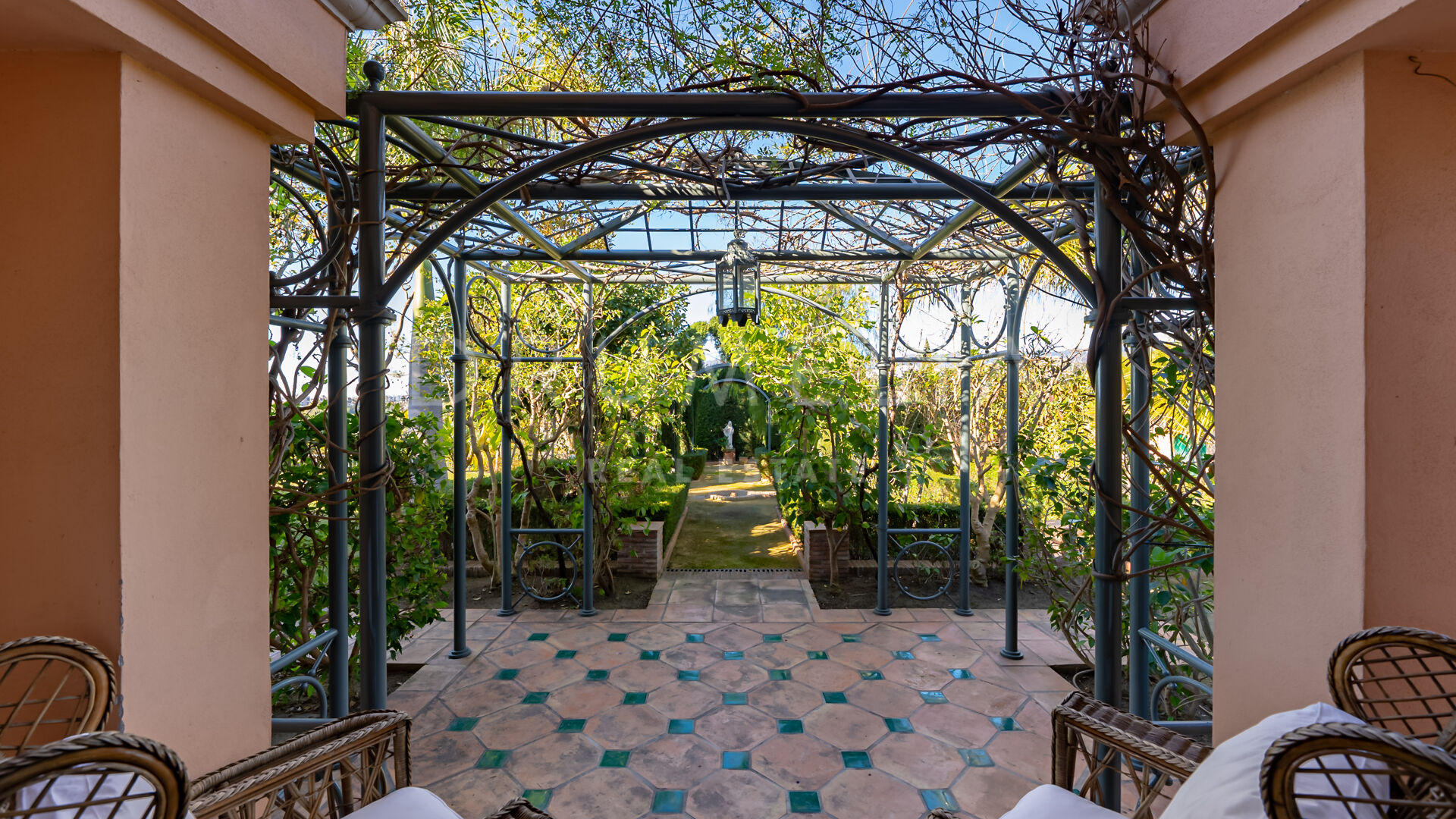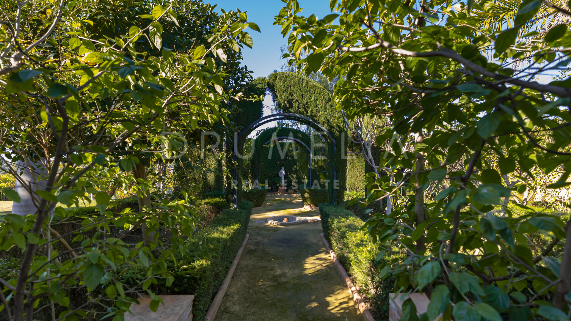 The amazing garden is full of southern charm, with its emerald-green lawns, flowerbeds and mature trees, romantic corners, a wall fountain, exposed brick and natural stone. A large zero-edge swimming pool has a security wrought iron fence that provides protection and actually, enhance the beauty; custom-designed, it fits the style and landscaping, and is in full harmony with a pavilion with chill-out and sunbathing areas. A delightful Andalusian patio has a central fountain and orange trees. Significant Mediterranean elements beautify the house inside and outside: a terracotta roof, paved yard, arched windows, columns, metal balustrades and railings of the balconies, hand-made ceramic tiles, accent walls, French doors, classic choice of noble colours dictated by Nature, etc.