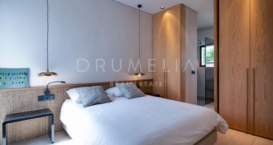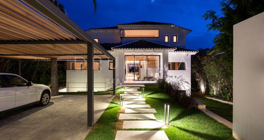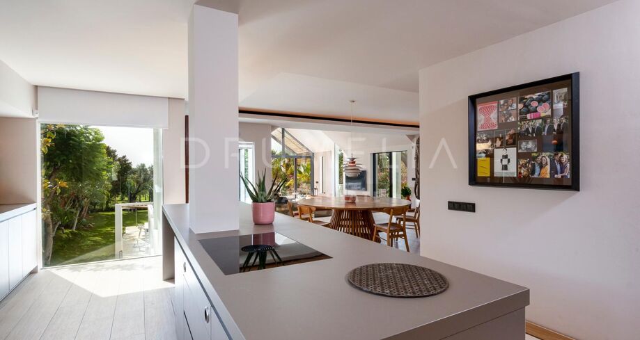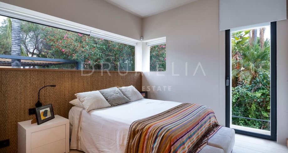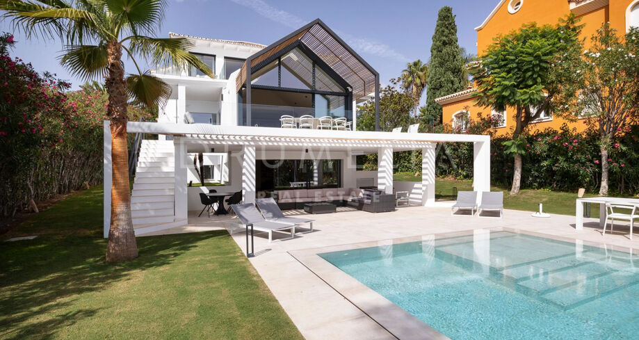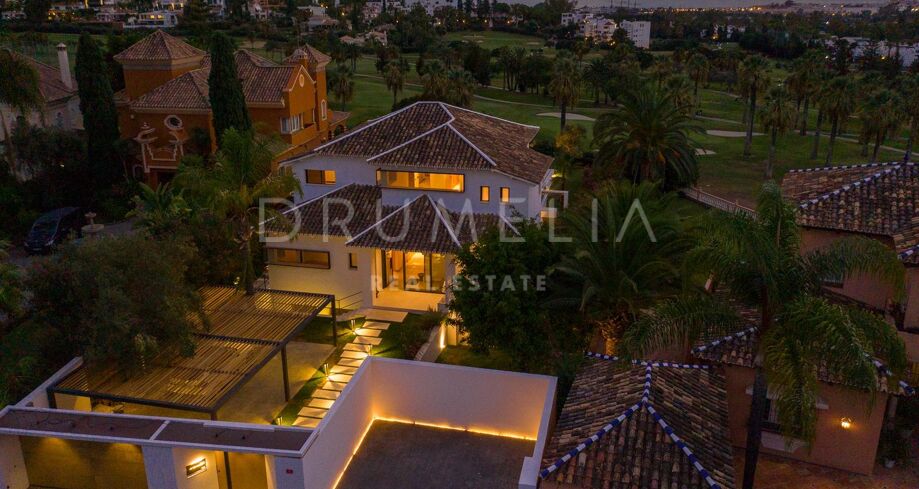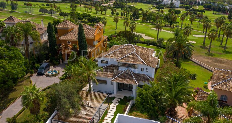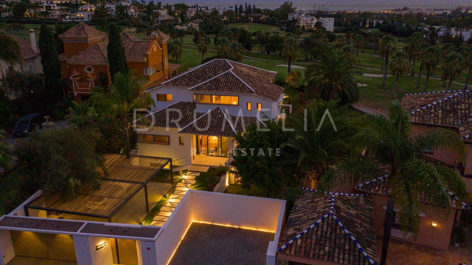 Completely refurbished and beautifully reformed in modern style in 2019, this property is perfect as a golf holiday home or a permanent residence for discerning owners. It enjoys a south orientation and picturesque views to the Mediterranean Sea and green carpets of the golf course designed by legendary Robert Trent Jones Sr. and considered one of the best courses in Spain. Surrounded with similar properties of the sought-after area of Nueva Andalucía, this stunning modern villa blends perfectly into the beautiful surroundings.