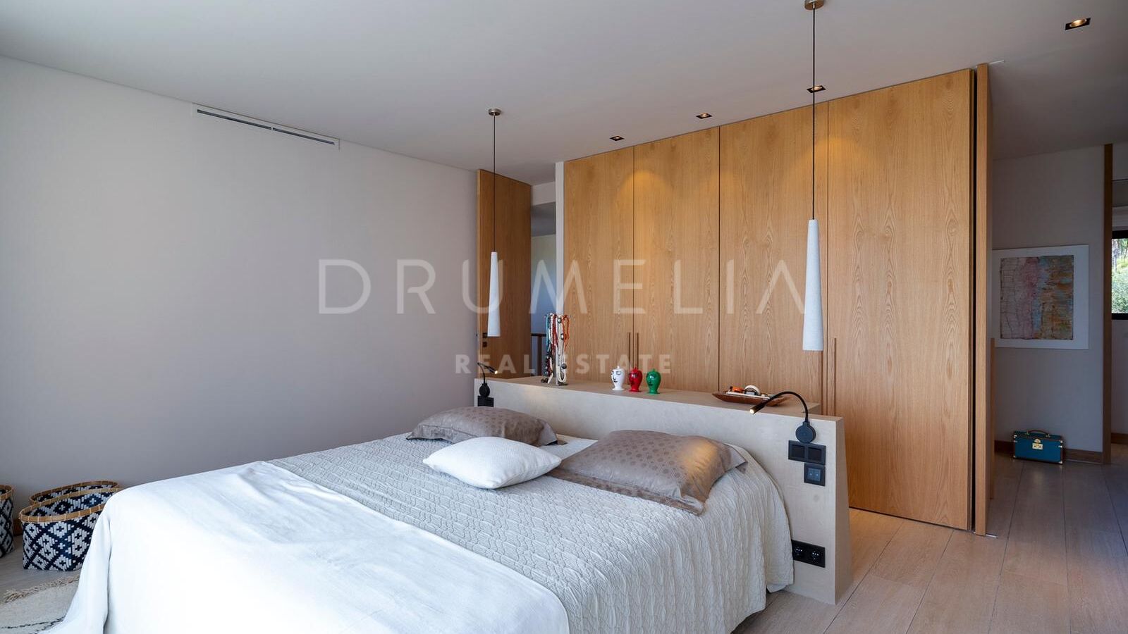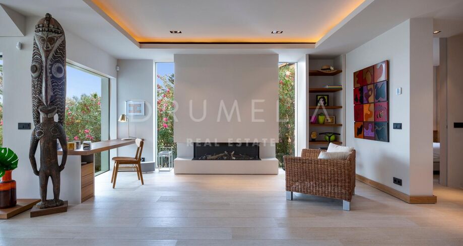 Set on a plot of 1.430 m², the house of 590 m² consists of an open plan main living and dining area with a modern fireplace, wooden floors, dedicated working corner and sliding glass doors leading to the spacious private terraces with serene views; a state-of-the-art sleek kitchen; 6 bedrooms with superb fitted wardrobes, 6 bathrooms and 1 guest toilet. There is the second living room and another kitchen as well. You will find plenty of space for relaxation, watching TV, entertaining or having a wonderful family time. The outstanding covered and sunny terraces on different levels have everything you need to enjoy the famous Mediterranean lifestyle, including chill out, al fresco dining and sunbathing areas.
