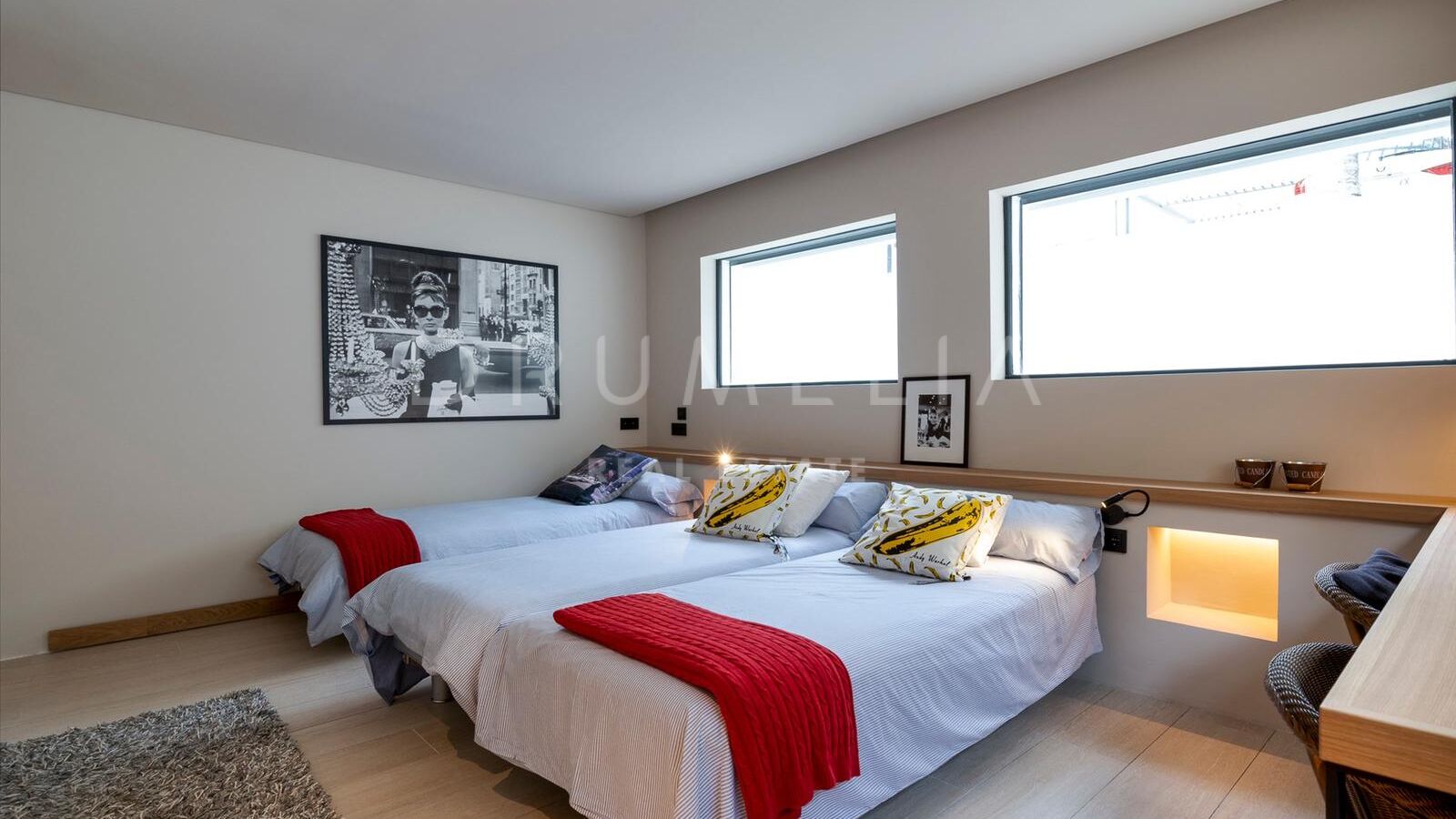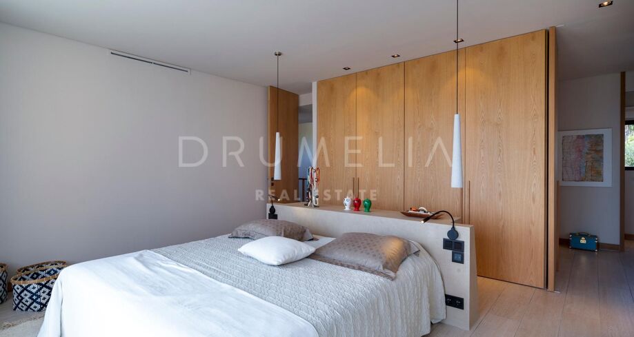 This high-end house is full of modern chic. It comes for sale in excellent condition, with a heated pool, landscaped garden, parking for 3 cars, many comforts and luxurious features: a lift, hot and cold air-conditioning, panoramic glass windows, transparent balustrades, sophisticated lighting and ceiling design, beautiful wooden elements, etc.