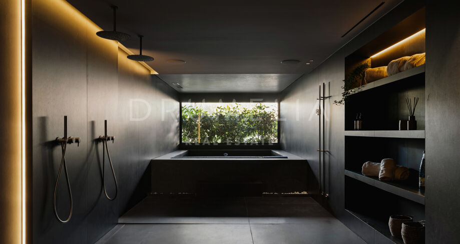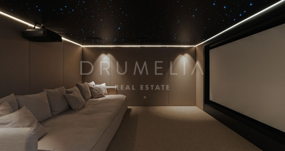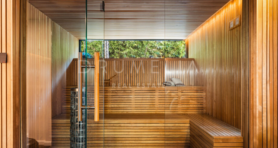 The lower level is dedicated to leisure, with a cinema room, gym, sauna, and indoor wellness area.