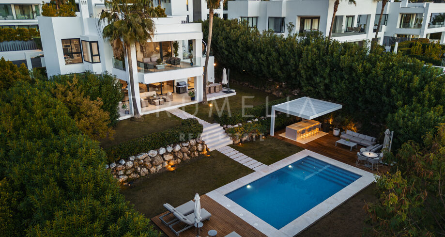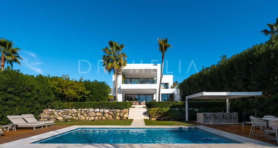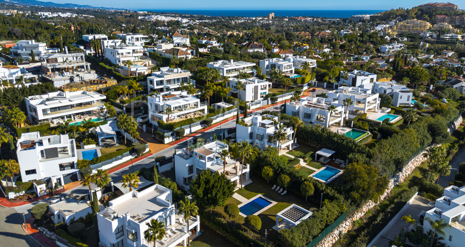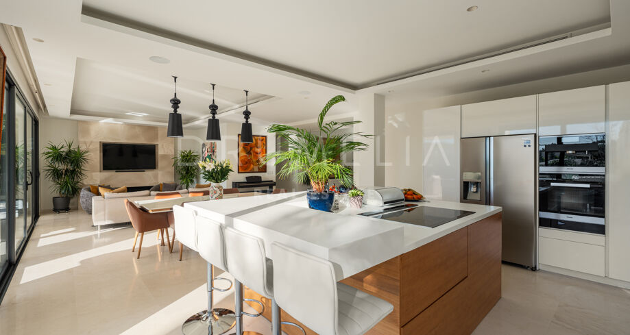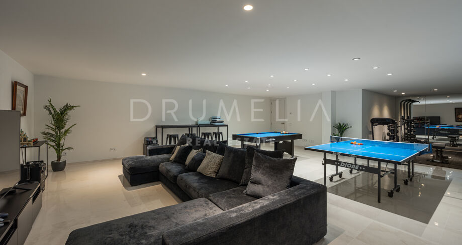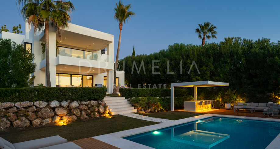 Located in Spain, Andalusia, Málaga, Marbella, Nueva Andalucía, within the gated urbanisation of Los Olivos, this contemporary villa offers privacy and a prime residential setting close to golf courses and amenities.