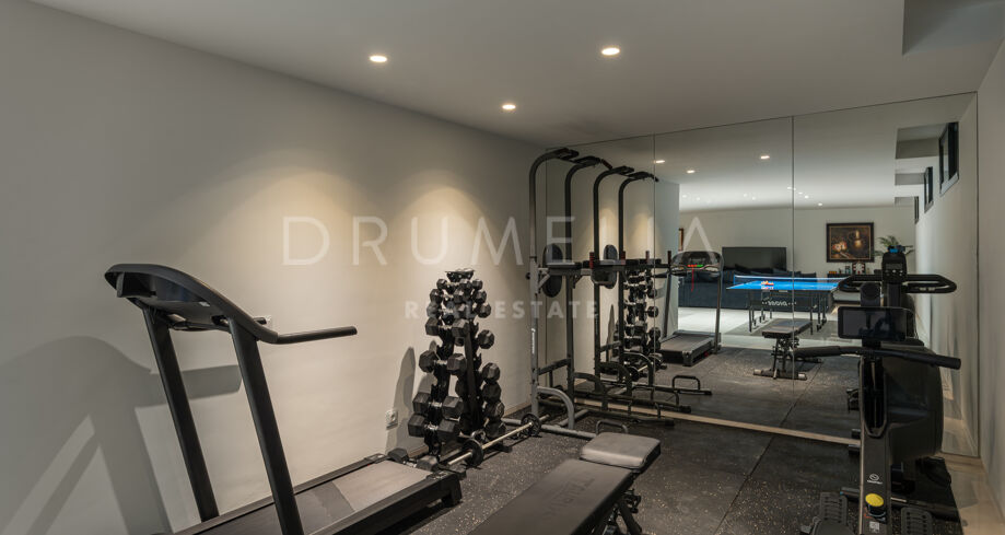The lower level is dedicated to leisure and functionality, including a cinema room, entertainment area, private gym and a laundry room. A private lift connects all floors.