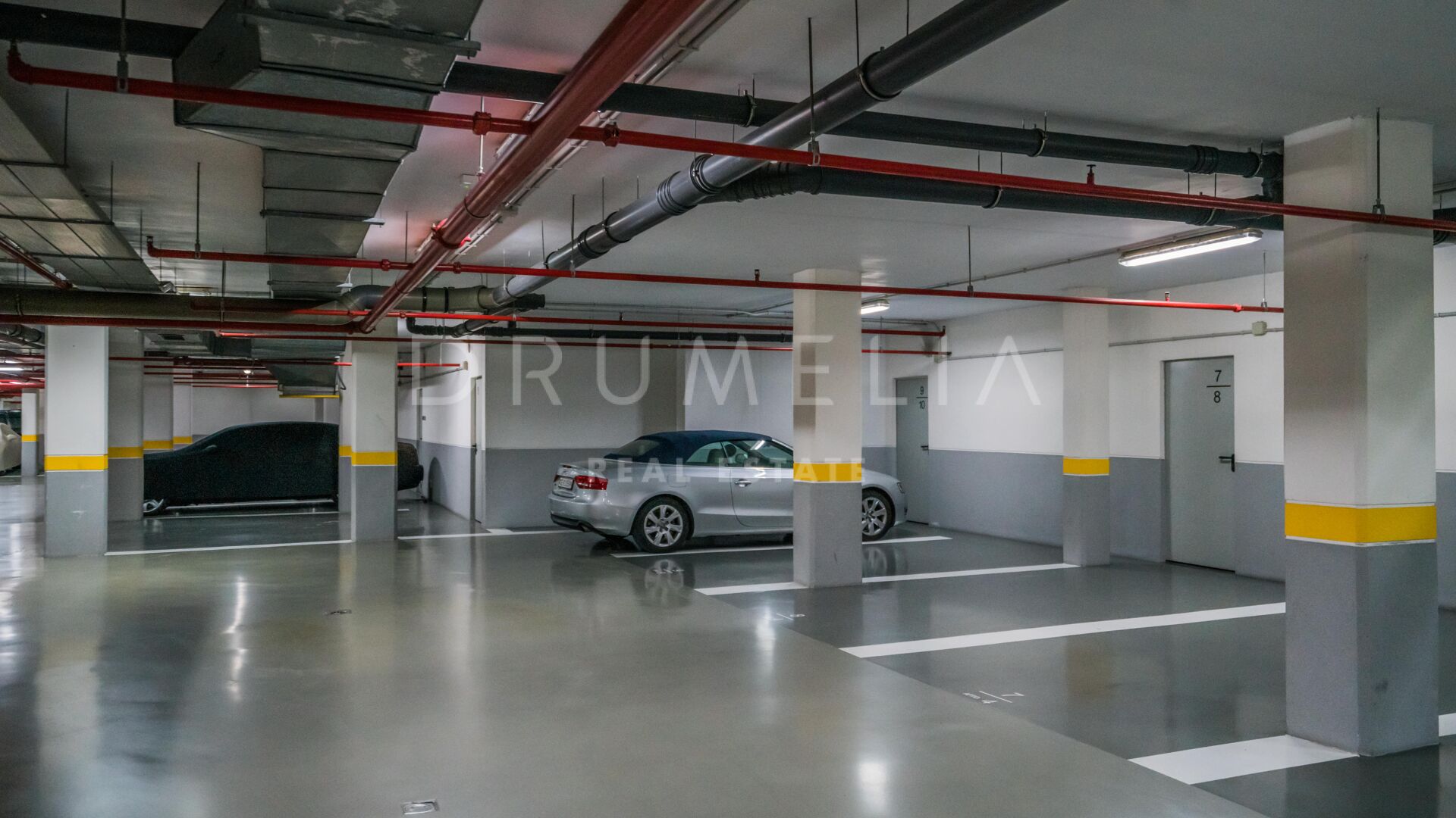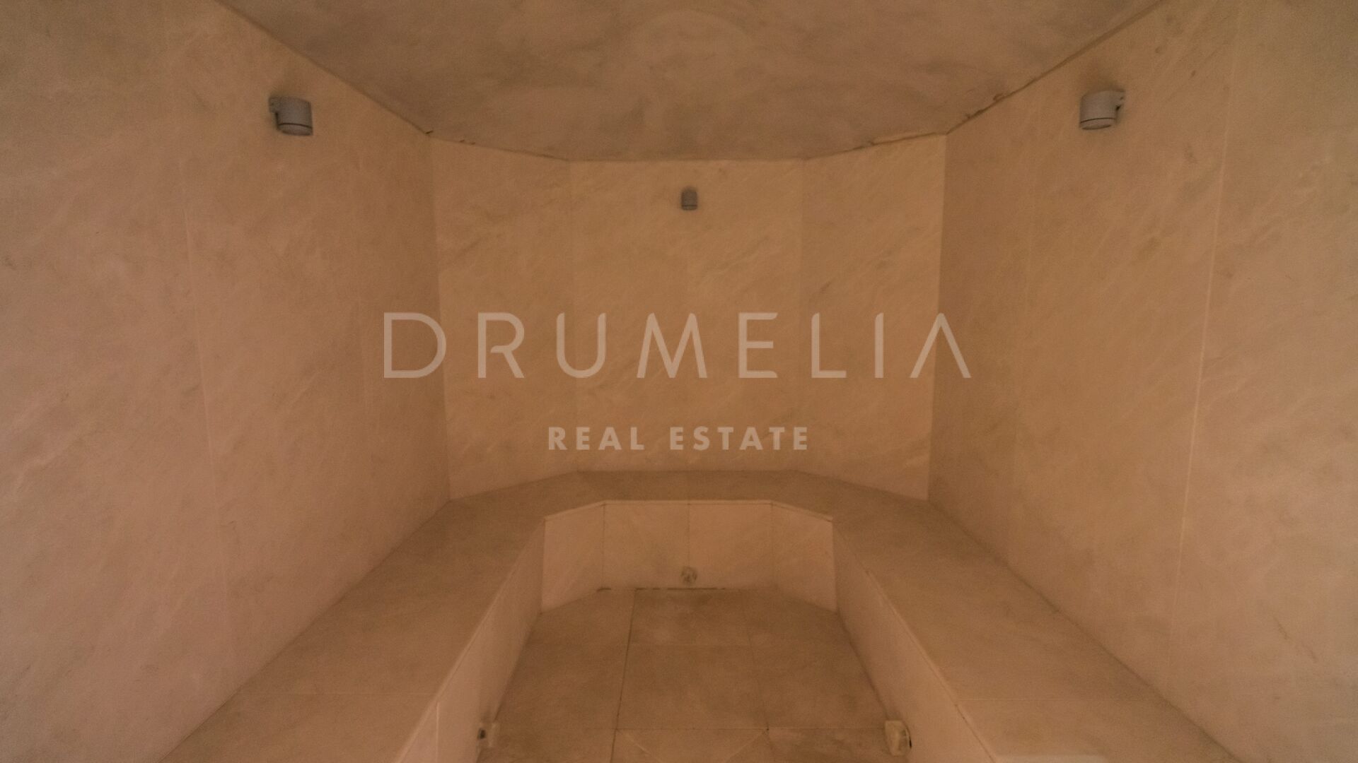 The corner apartment features an entrance hall with a guest toilet, an elegant living room with a classic white marble fireplace, a matching dining area and direct entrance to a terrace, a modern joyful, fully- fitted and equipped kitchen, 3 serene bedrooms and 3 bathrooms. The classic design with clarity of forms, noble colour palette, magnificent cream marble flooring and ‘classy’ architectural details speaks of impeccable taste and commitment to comfort and Mediterranean luxurious lifestyle.