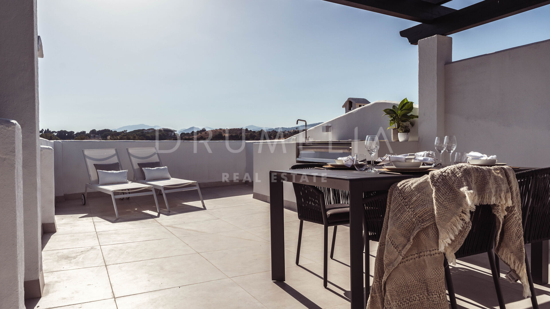 The expansive terrace provides the perfect setting for sunbathing, entertaining, or enjoying panoramic views of the surroundings. With secure private parking and community amenities, the property ensures both convenience and peace of mind.