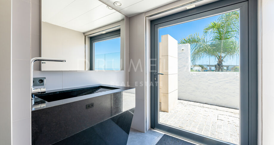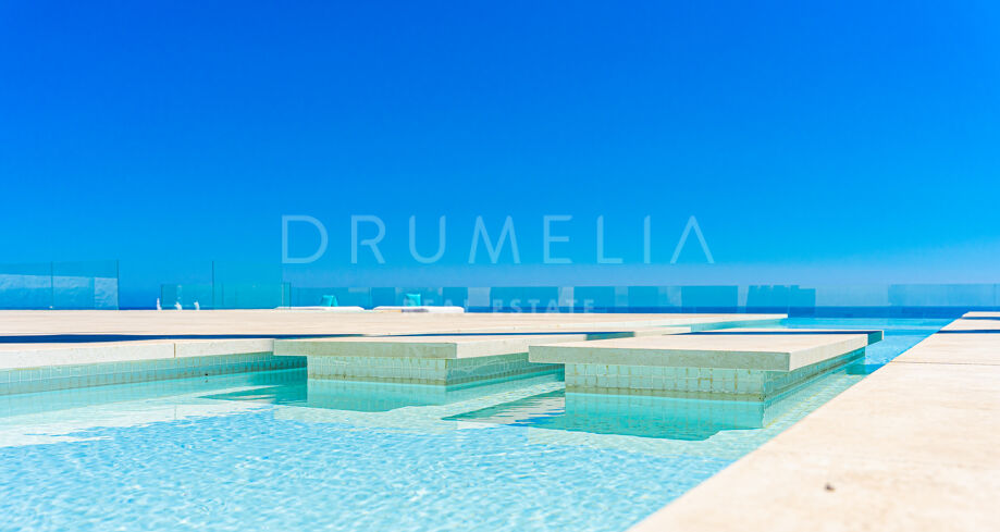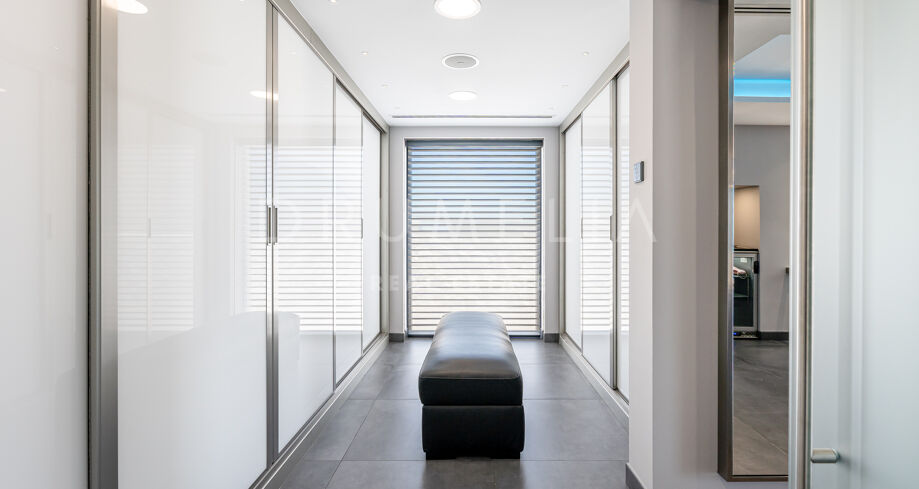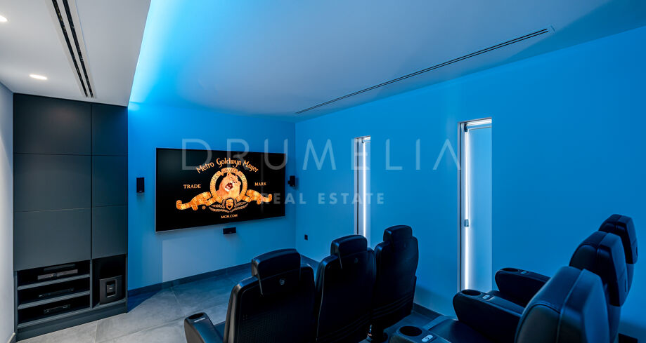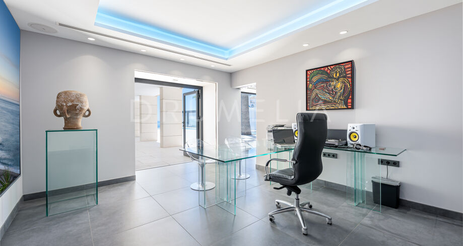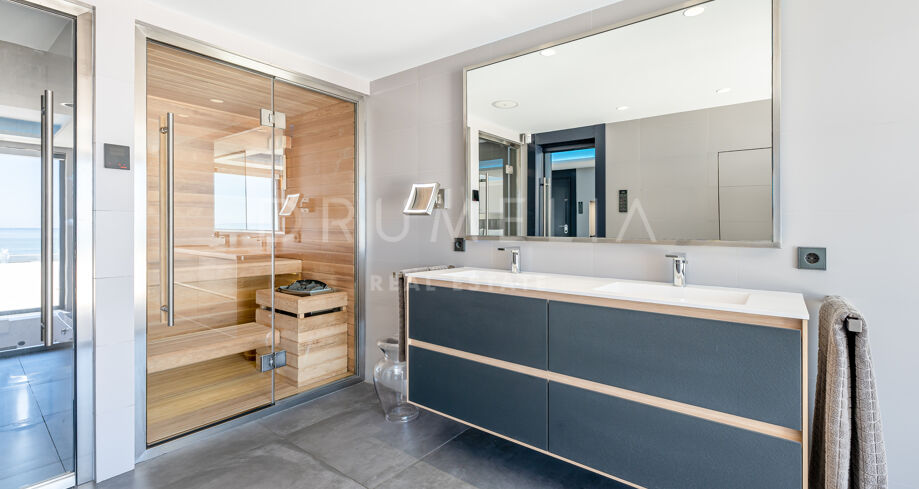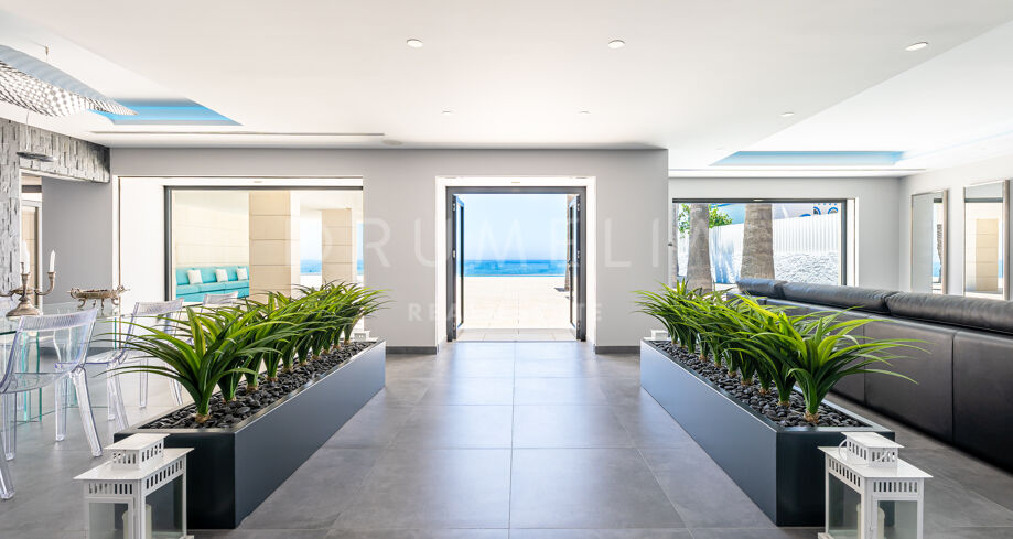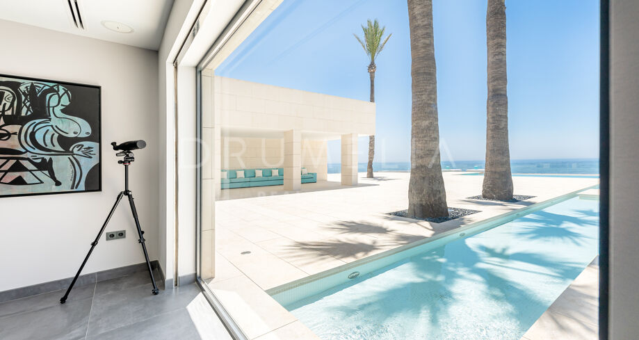 Equally stunning are relaxation and entertainment areas, both inside and outside: a state-of-the-art home cinema, fitness area with gym overlooking the sea towards Africa, outdoor lounge and chill-out areas, separate partying and al fresco dining patio. Luxury doesn’t stop when it comes to the imposing heated pool with decking and sunbathing areas, bathrooms and changing rooms.