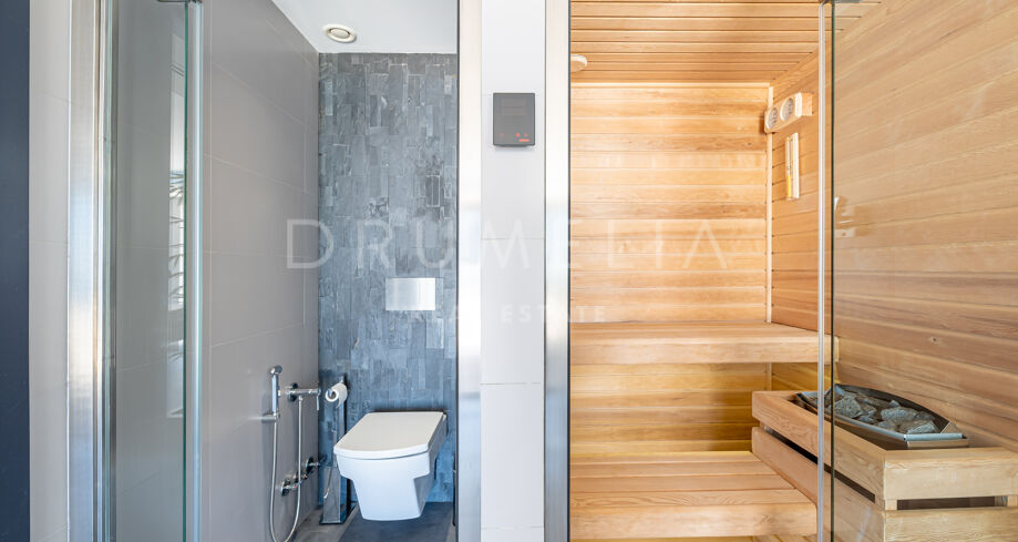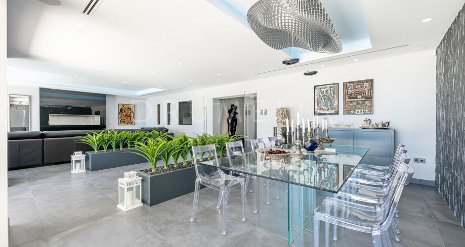 Set on a large 2.190 m² plot, the south-facing villa of 561 m² is built on one level with 700 m² shaded and sunny terraces, and outdoor areas enjoying delightful water features. The ‘wow’ factor comes right the moment you enter a show-stopping entrance hall with exquisite ceiling and lighting design, a mirror wall and statement artwork. It’s see-through and inspirational vistas set the mood for the entire home at once! An amazing open plan living room unites a fireplace salon and a dining room, the light-filled, free-flowing interior spaces with bespoke design touches and bilateral symmetry technique providing balance within the room.